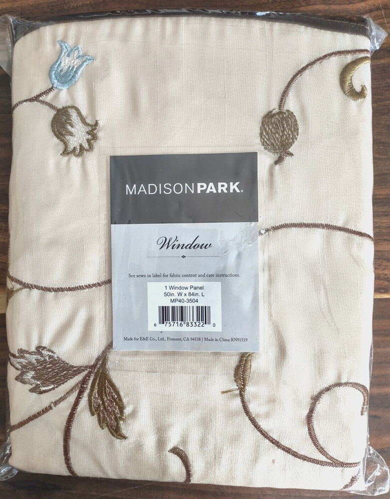 Madison Park Embroidered Window Panel in Blue Finish MP40-3504 Add simple elegance to any room with the Madison Park Serene Embroidered Window Panel. This window curtain features delicate floral embroidery in soft blue and natural hues, offering beautiful contrast for a sophisticated look. The pieced and pleated details provide extra dimension and charm to your home decor, while added lining helps filter the perfect amount of sunlight into your home. Simply hang with rod pocket or backs tabs for a tailored look. Fits up to a 1.25" diameter rod. Color: Blue Material: Polyester 1 Window Panel: 50”x 84" Made in China Care Instructions: Machine Wash Cold, Gently, Separately, Do Not Bleach, Tumble Dry Low, Remove Promptly, Do Not Iron New in original package ~ package has wear Please examine all photos carefully for a true depiction of the item. Due to individual monitor calibration and lighting, the listings photo color may appear different than the actual item. S15