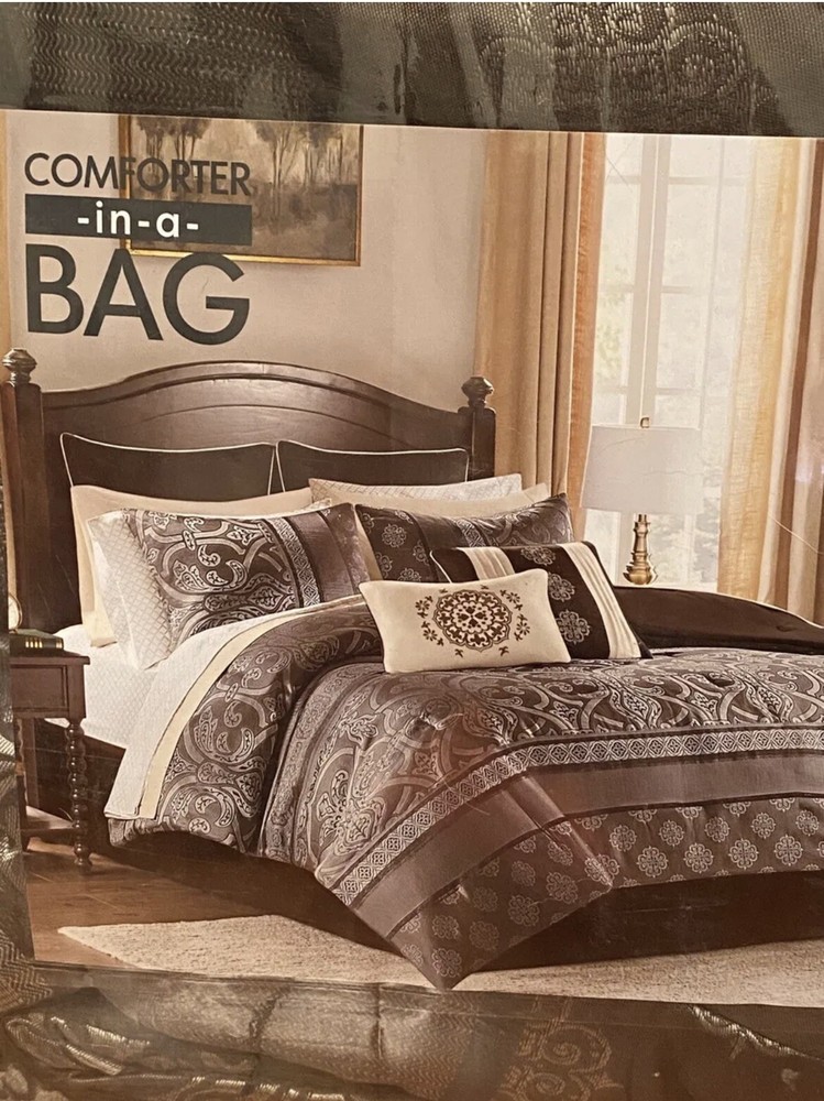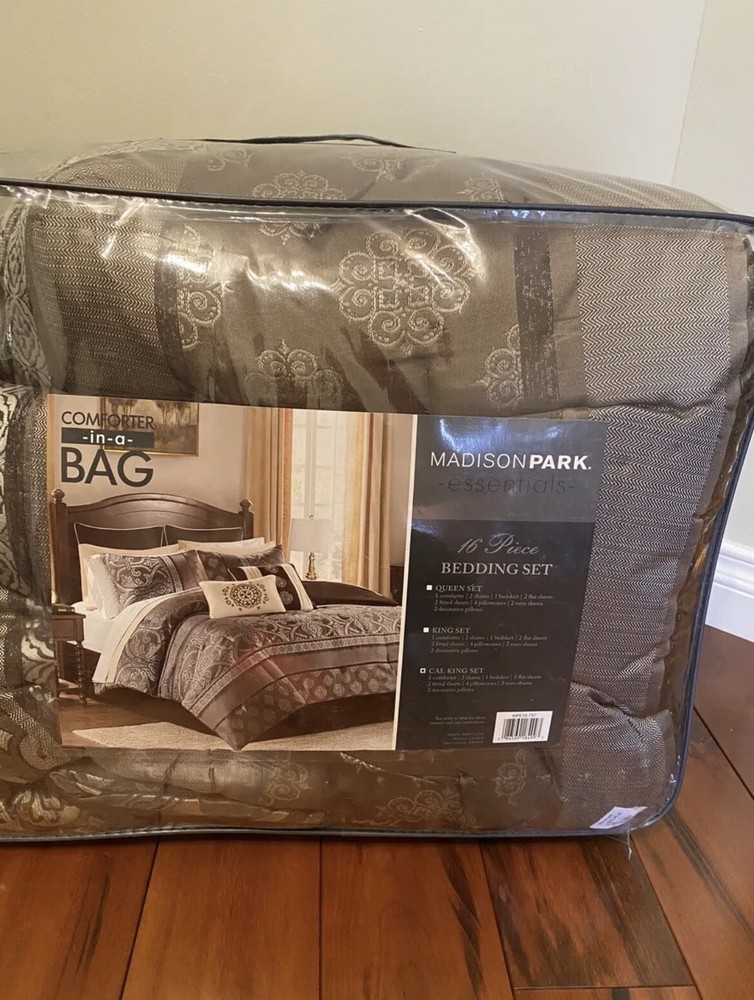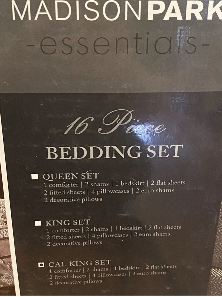 Madison Park Essentials Alexine California King 16 Piece Bedding Set Brand new in original packaging with tags 1 comforter 2 shams 1 bedskirt 2 flat sheets 2 fitted sheets 4 pillowcases 2 euro shams 2 decorative pillows Amazing deal
