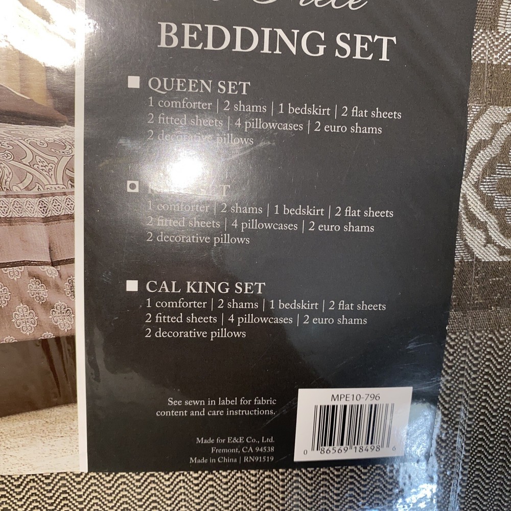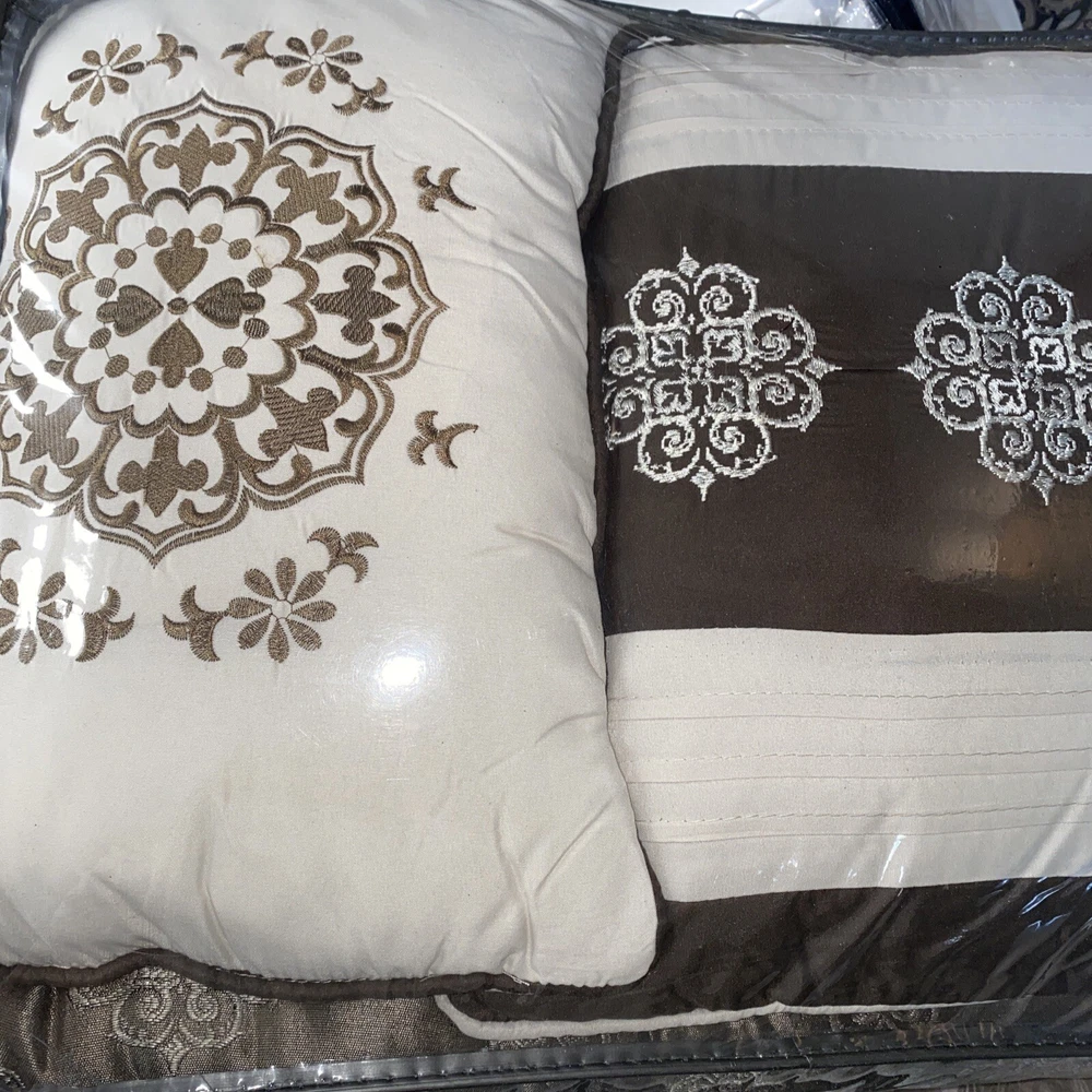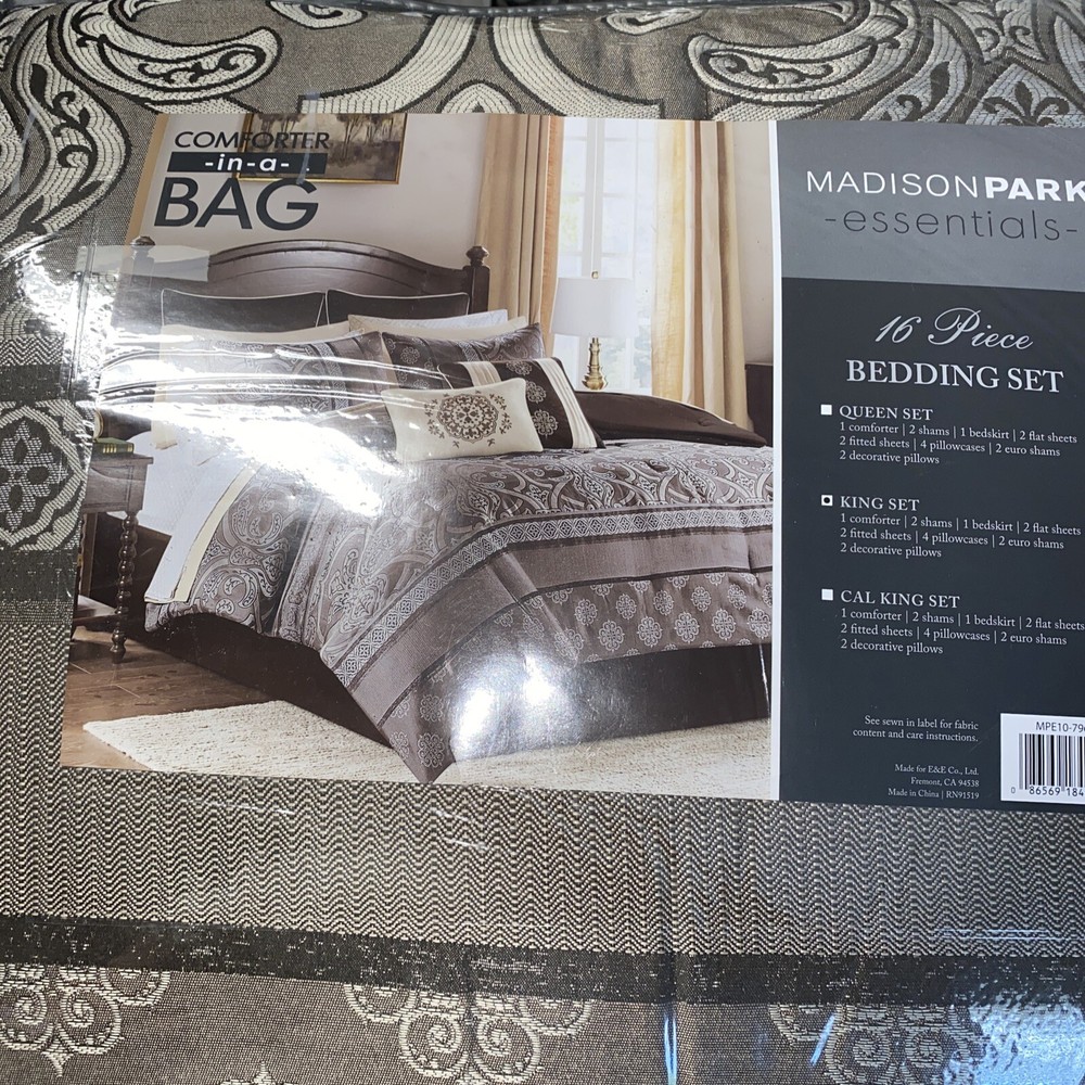 The Zara 16 Piece Jacquard Bedding Set with 2 Sheet Sets offers a luxurious traditional update for your bedroom. An elegant jacquard design, in shades of brown, adorns the face on the comforter and a solid dark brown reverse complements the top of the bed. Dimensions: Comforter: 104" x 92", 2 King Shams: 20" x 36" , Bedskirt: 78" x 80" + 15", 2 Decorative Pillows: 18" x 18"/12" x 18", 2 Euro Shams: 26" x 26" , 2 Flat Sheets: 108" x 102" , 2 Fitted Sheets: 78" x 80" + 14" , 4 King Pillowcases: 20" x 40" Set includes: Comforter, 2 King Shams, Bedskirt, 2 Decorative Pillows, 2 Euro Shams, 2 Flat Sheets, 2 Fitted Sheets, 4 King Pillowcases Best value, 16 piece jacquard comforter set including 2 complete sheet sets Bedskirt drop 15 inches Also included are two complete sheet sets with fitted sheets that fit up to 16" mattress depth One sheet set showcases a medallion print and the other is a solid brown that coordinate back to the jacquard bedding set Two shams and two dark brown Euro shams perfectly complement the comforter, while three decorative pillows with embroidery and pintuck details and a solid brown bedskirt provide the finishing touches Comforter/sham/euro sham/bedskirt/sheet set: polyester microfiber, comforter with polyester filling; Decorative pillow: polyester cover with polyester filling Machine Washable, Spot Clean Decorative Pillow Please note: this item will be shipped in a compression bag The Plastic bag the item comes in has been taped together as they are very thin and the item is very heavy - if you need more information, please contact me