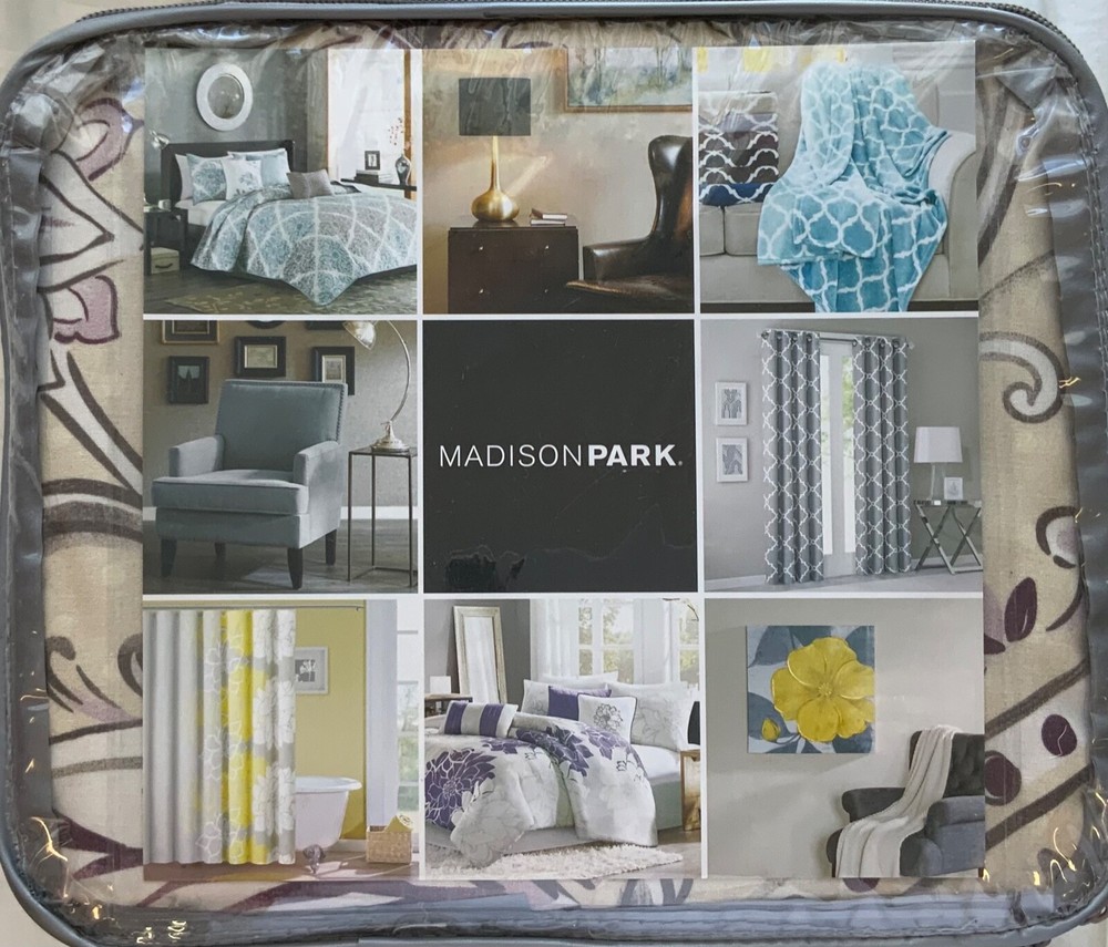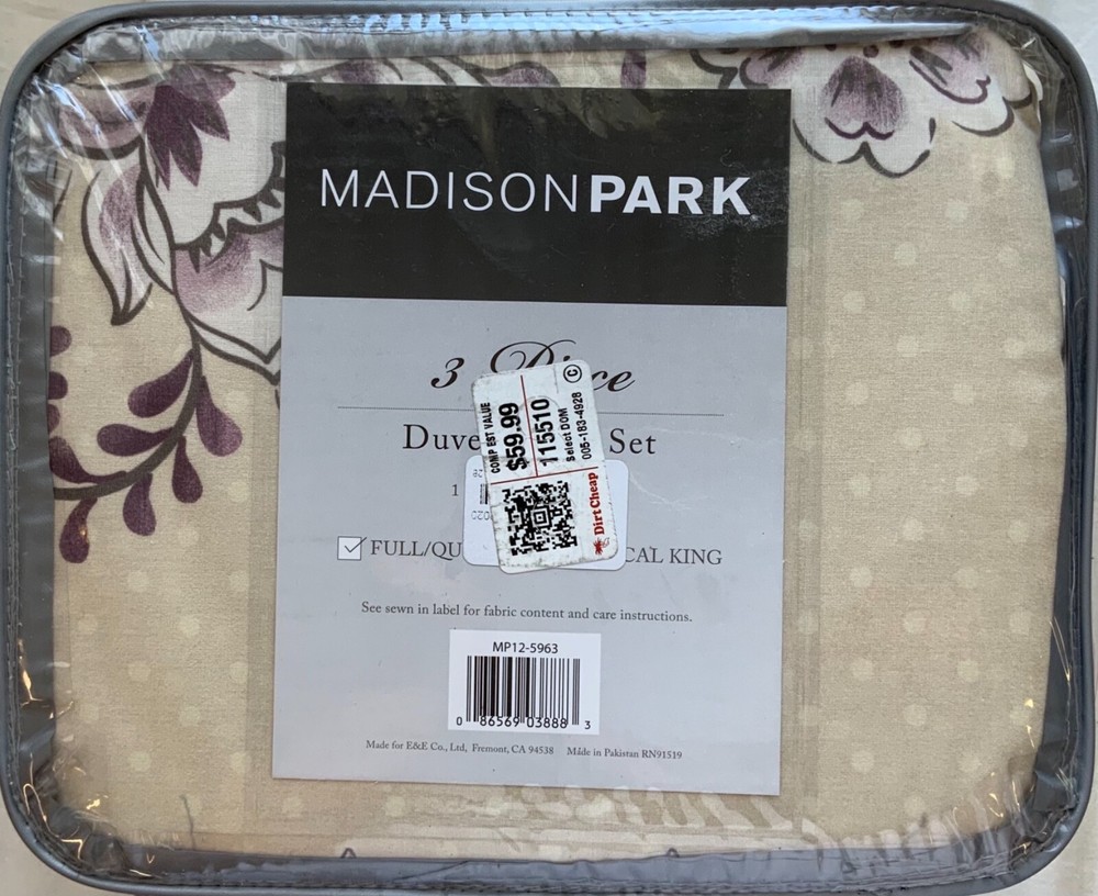 MADISON PARK FULL/QUEEN TAN AND PURPLE FLOWER 3PC DUVET SET NEW IN PACKAGE SET INCLUDES: 1 FULL/QUEEN DUVET COVER / 2 STANDARD SHAMS FACE: 100% COTTON / REVERSE: 52% POLYESTER 48% COTTON TAN BACKGROUND WITH BEIGE POLKA DOTS ND PURPLE ND WHITE FLOWER PATTERN ALL OVER BUTTON CLOSURES NEW IN PACKAGE