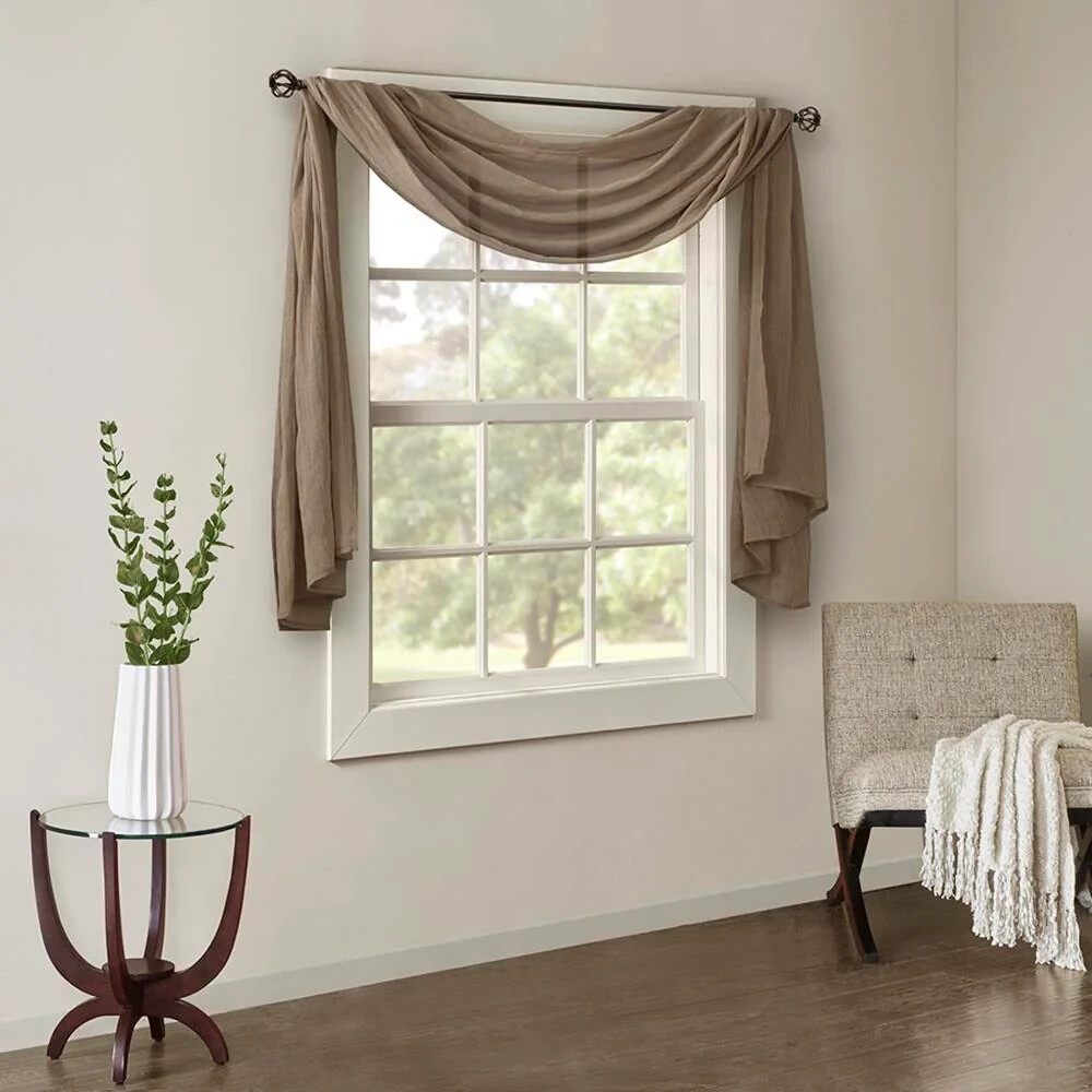 Harper Solid Crushed Scarf Sheer 42x216" by Madison Park. Soften the edges of your window, with our Madison Park Harper Solid Crushed Sheer Scarf. This light taupe scarf features crushed detailing for beautiful texture, while the lightweight sheer fabric provides easy draping and an airy touch to your decor. Four tabs are also included to make the DIY assembly easy so you can drape the scarf to best fit your window. For a complete look, layer this scarf with coordinating panels or prints in our collection for a more custom appeal.