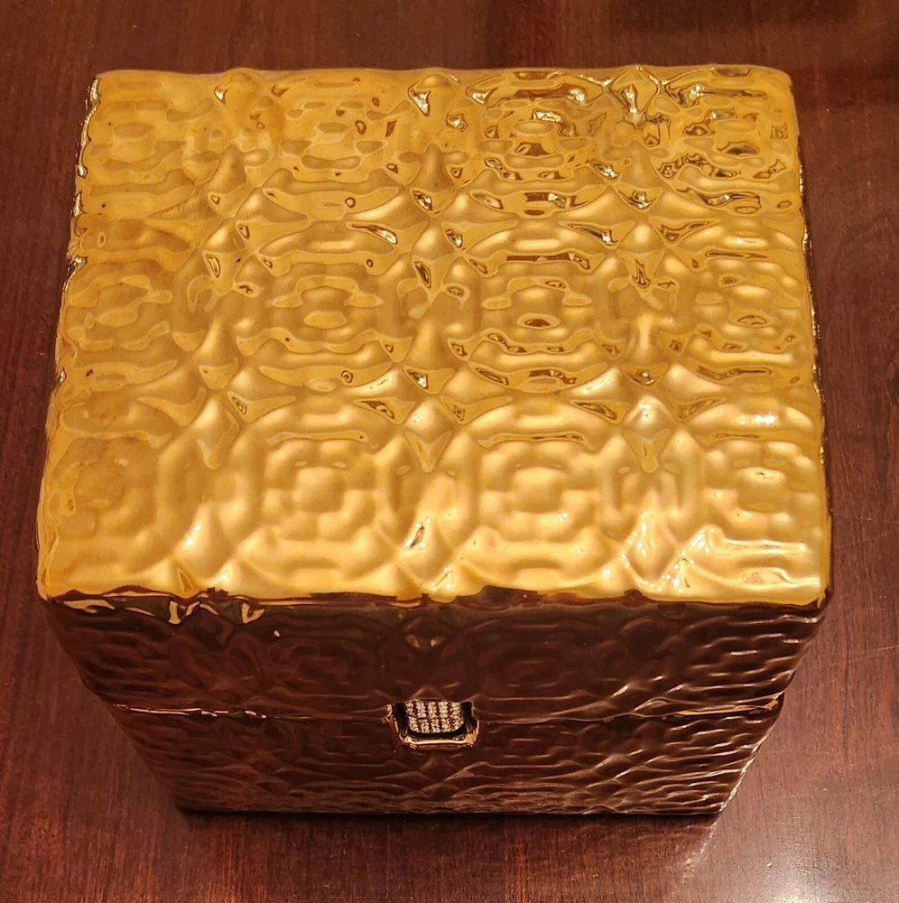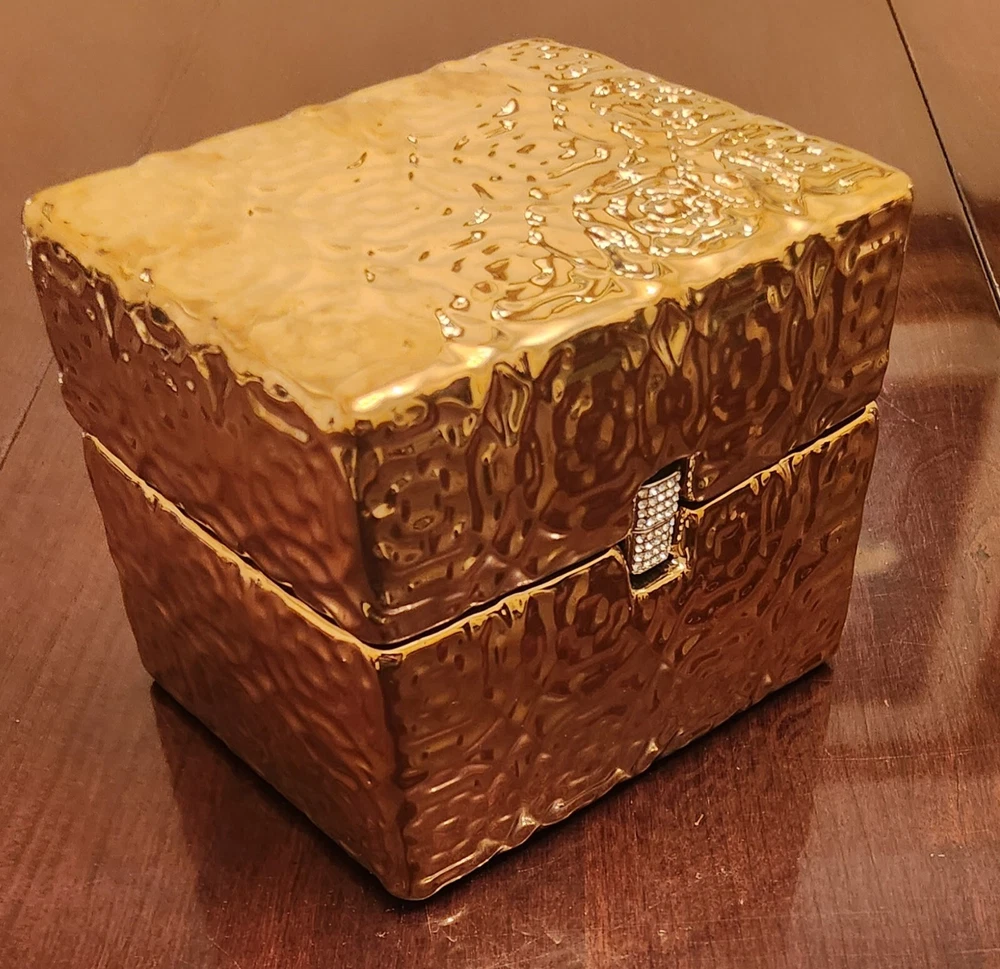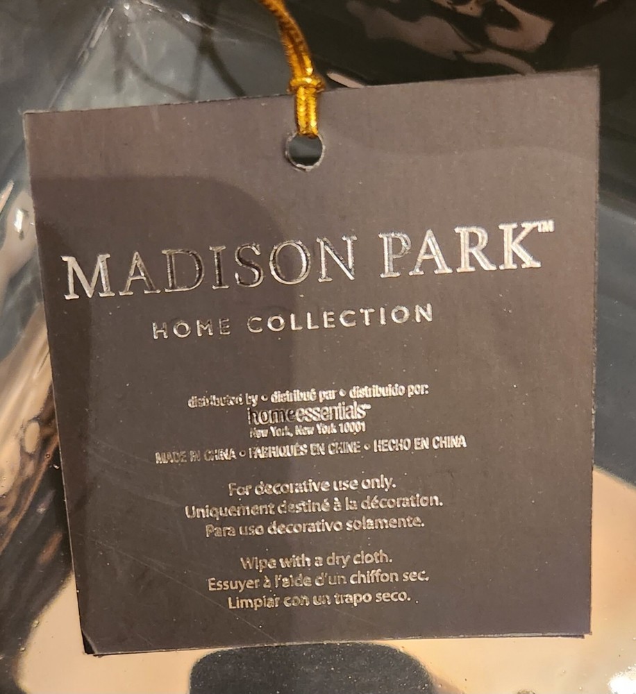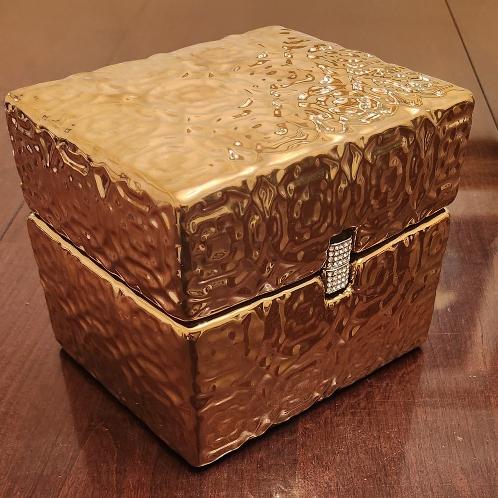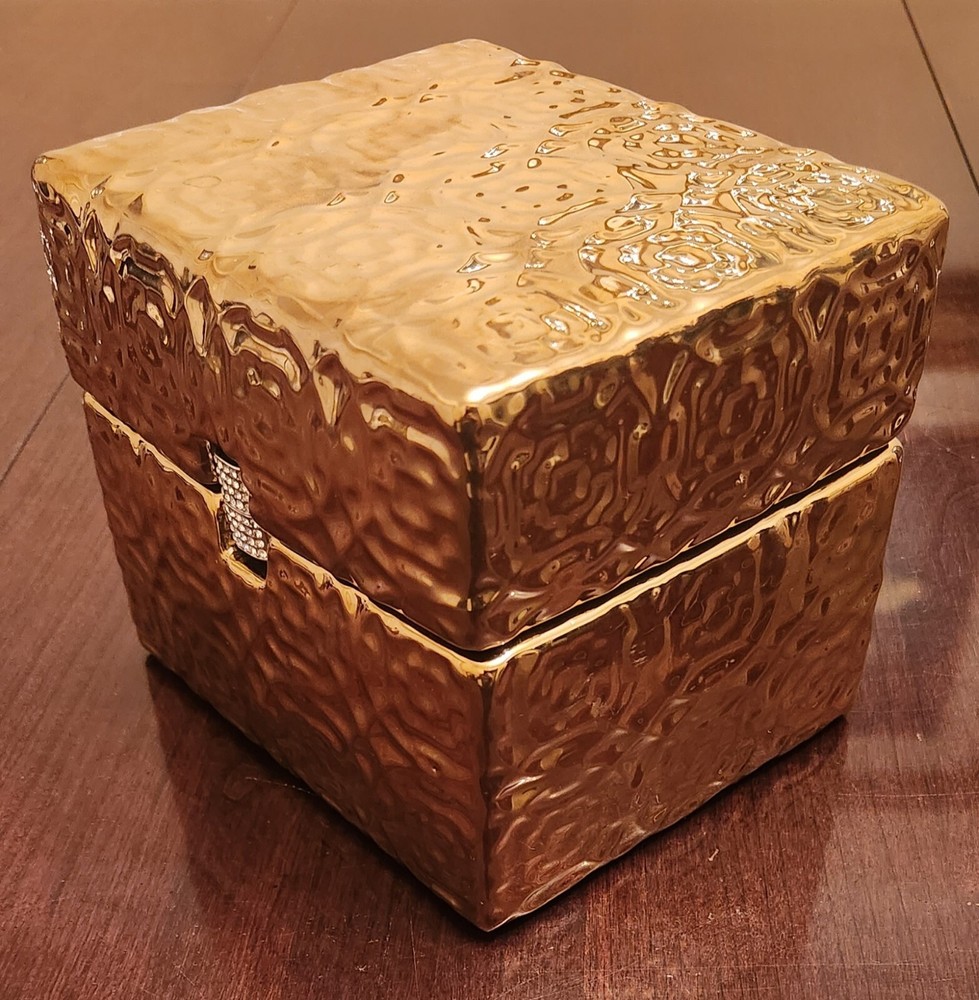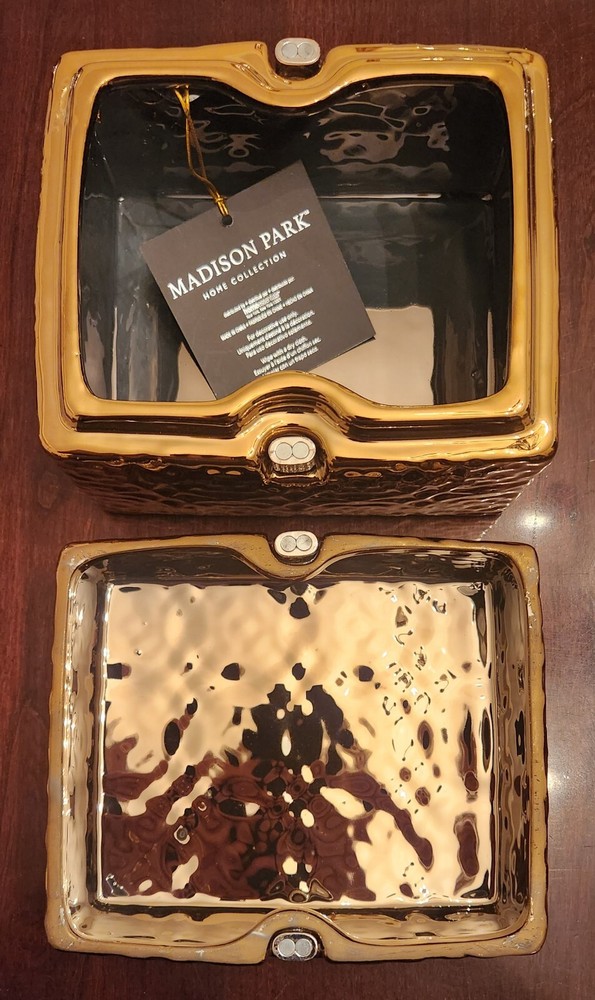 New with tag Size: 6"L x5"W x 5"H Color: Gold This exquisite jewelry box by MADISON PARK HOME COLLECTION is the perfect addition to any collection. Crafted from high-quality ceramic and featuring a fine design, it is the ideal storage solution for any jewelry enthusiast. Its spacious interior provides ample room for all types of jewelry, from necklaces to bracelets and everything in between. The jewelry box is designed to keep your jewelry safe and organized, with multiple compartments and a soft interior lining to protect delicate pieces. Whether you're looking to store your most valuable pieces or simply want a beautiful and functional jewelry box, this ceramic masterpiece has you covered.