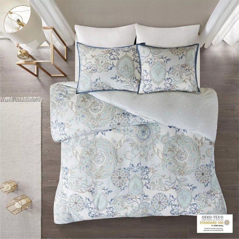 MADISON PARK ISLA 3PICES REVERSIBLE DUVET COVER SET SIZE FULL/QUEEN NEW Madison Park Isla Reversible 3-Pc. Duvet Cover Set, Full/Queen Blue T4103704 The 100% cotton percale duvet and shams flaunt a botanical floral design with a medallion motif printed in soft blue watercolor hues. This reversible duvet cover displays a grey printed pattern on the reverse to complement the top of the bed. Button closures allow you to place a comforter insert within the duvet cover and the internal corner ties. Duvet Cover - 90" x 90", 2 Standard sham - 20" x 26" + 2" Includes - Duvet Cover, 2 Shams Face - 144TC, Reverse - 132TC Fabric Pattern - Floral Bedding Feature - Reversible OEKO-TEX® STANDARD 100 certified. Tested in an independent lab and verified to be safe from harmful substances 11-47893 Shirley Duvet/Sham - 144Tc Cotton Percale, 132Tc Cotton/Polyester Reverse Machine Washable