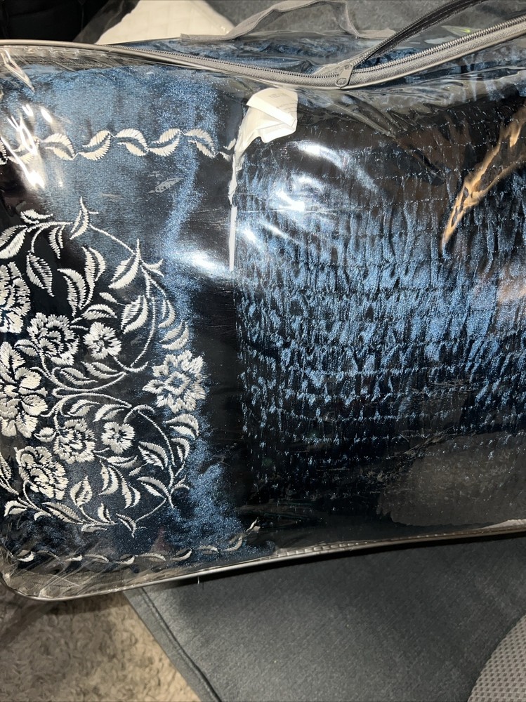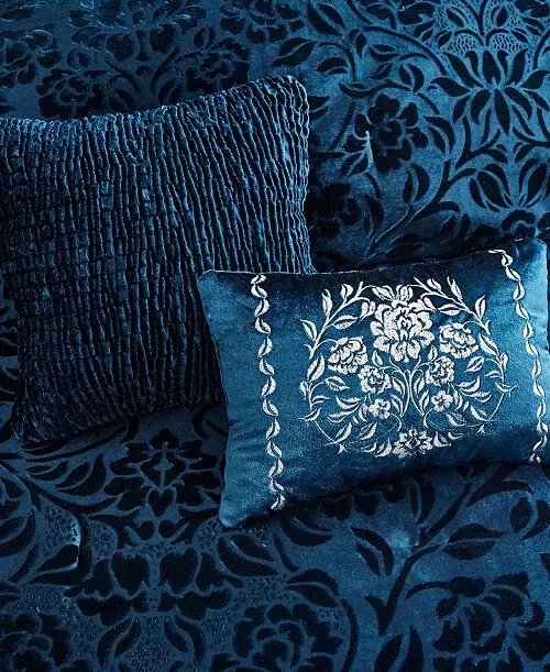 Transform your bedroom with the luxurious allure of this comforter set. The velvet comforter and shams feature an embossed floral pattern on a teal ground that creates a rich texture and adds dimension, for a stunning stylish look. Dimensions: comforter 90" x 90", shams 20" x 26", decorative pillows 12" x 18" and 18" x 18" Set includes: 1 comforter, 2 standard shams, 2 decorative pillows Polyester Machine washable Imported This item will be shipped in a compression bag (row2)