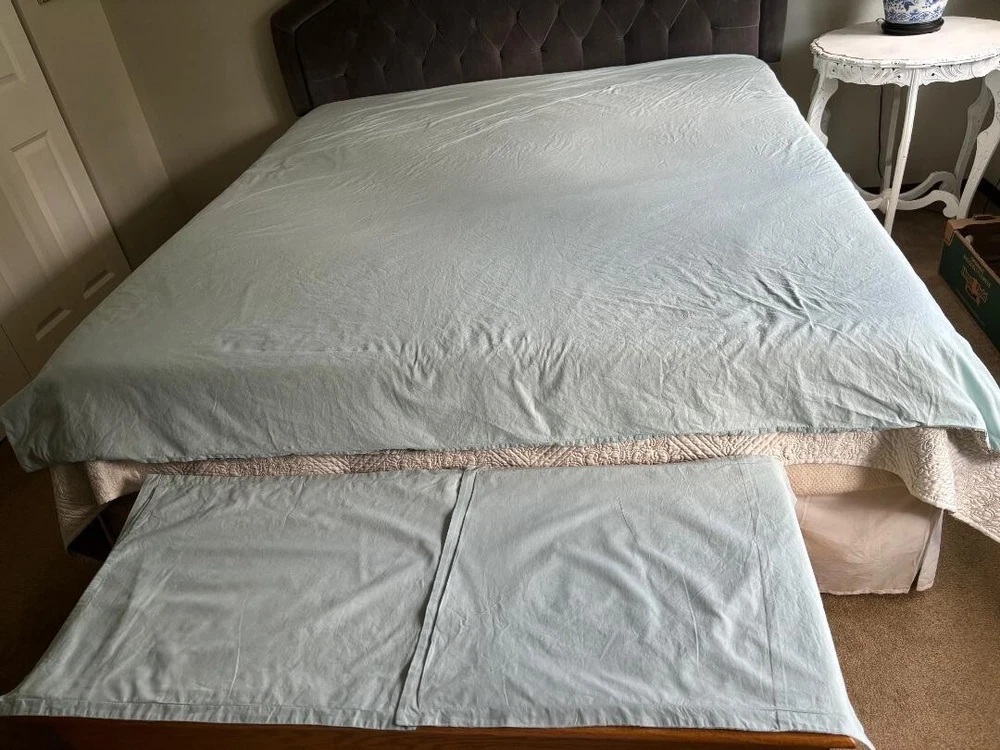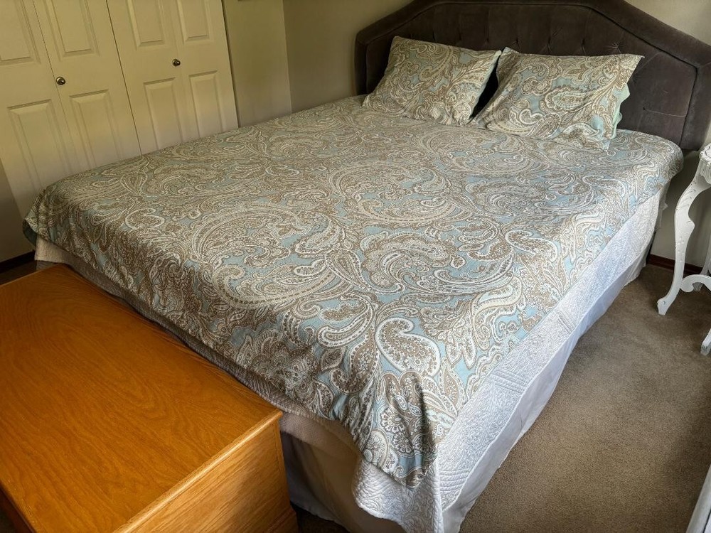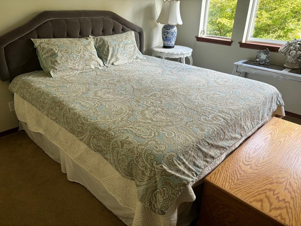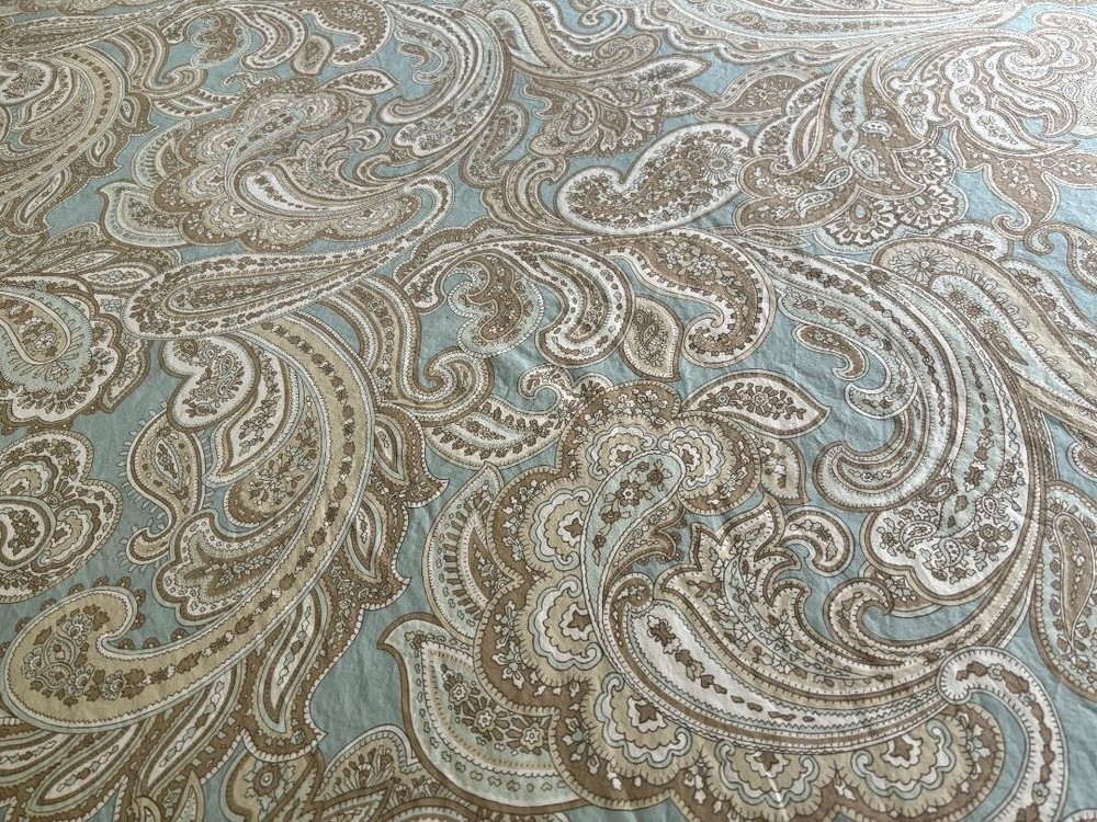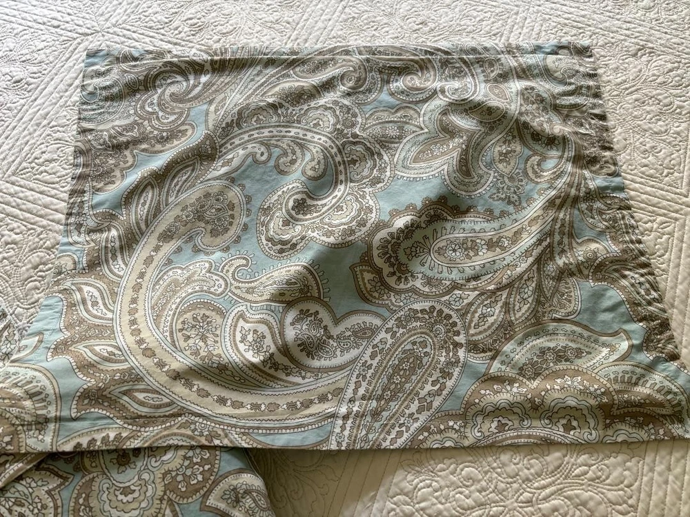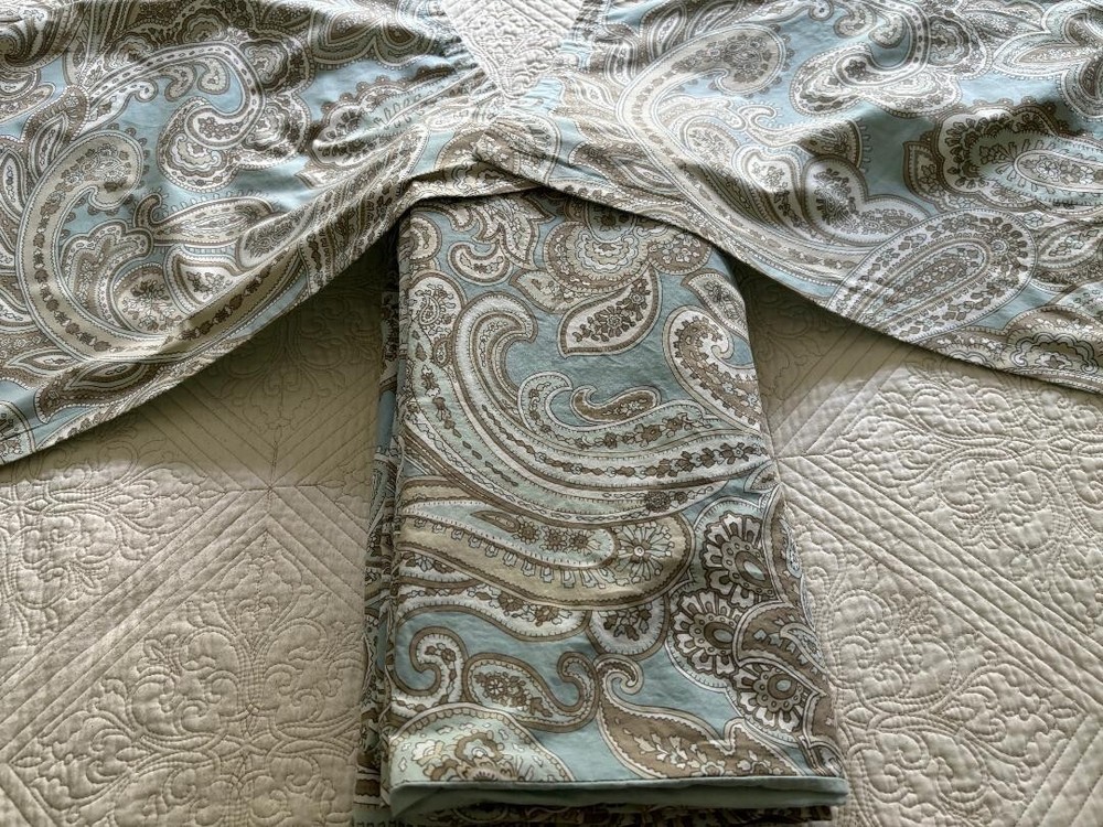 MADISON PARK PURE PAISLEY BLUE, BROWN, WHITE, QUEEN DUVET & SHAMS. HAS TIES INSIDE & HAS BIG BUTTON CLOSURE WITH TAGS ATTACHED. BEAUTIFUL PASTEL BLUE & MEASURES 88" LENGTH X 86" WIDTH. NO STAINS & WONDERFUL COLORS ARE ALL BEAUTIFUL. A LIGHTWEIGHT COTTON.
