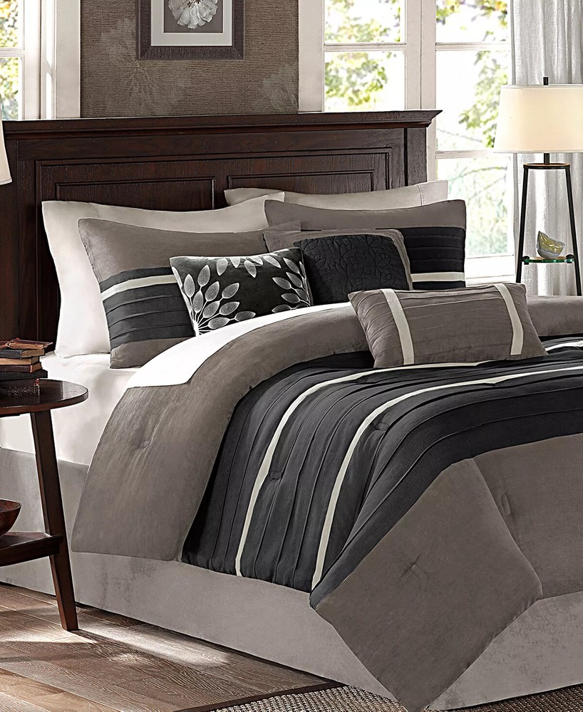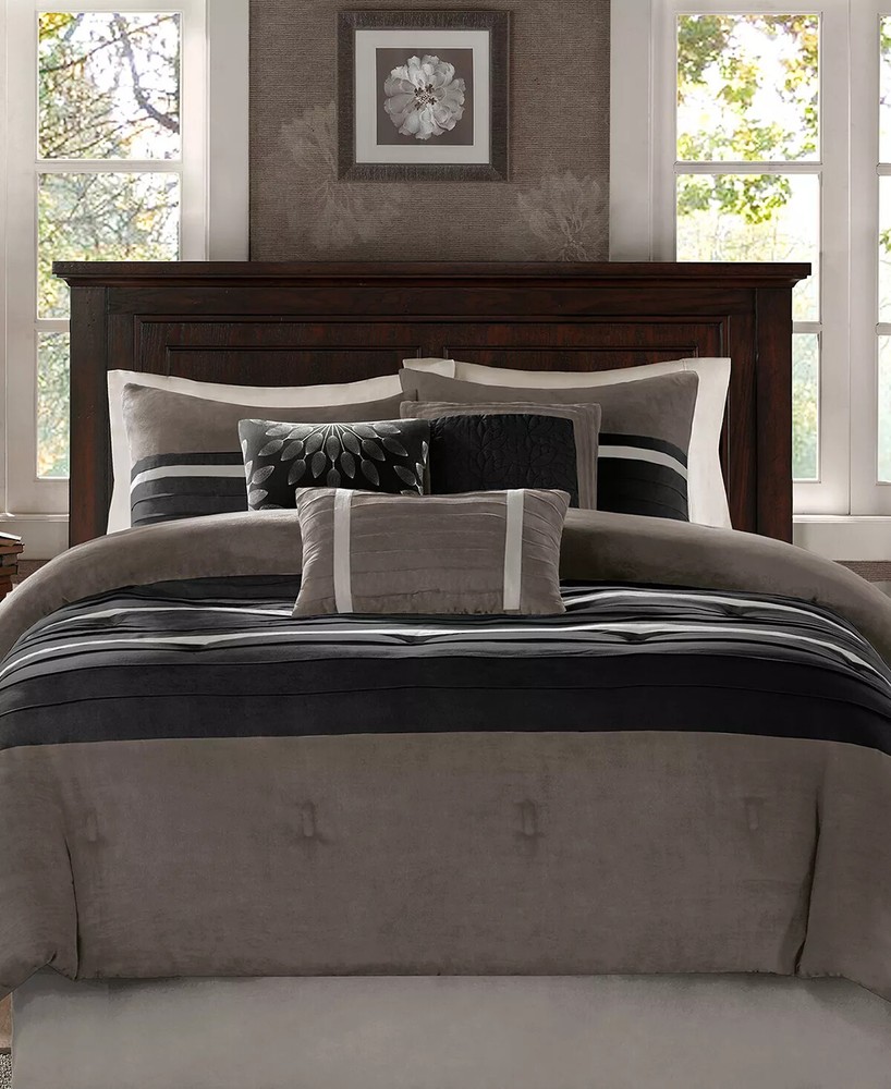 Breathe new life into your room with the exceptionally soft touch and lush tones of the Palmer microsuede comforter set from Madison Park. Set includes: comforter (104" x 92"), bed skirt (72" x 84" + 15"), two king shams (20" x 36") and three decorative pillows (18" x 18", 16" x 16", 12" x 20") Comforter and shams feature a polyester microsuede front. Comforter/sham: polyester print; reverses to brushed polyester Comforter: polyester fill Bed skirt: polyester Pillows: polyester cover and fill Comforter/sham: polyester; reverses to brushed polyester Comforter fill: polyester Bed skirt: polyester Pillows: polyester cover; fill: polyester Machine washable