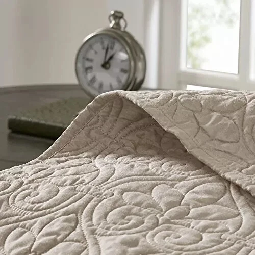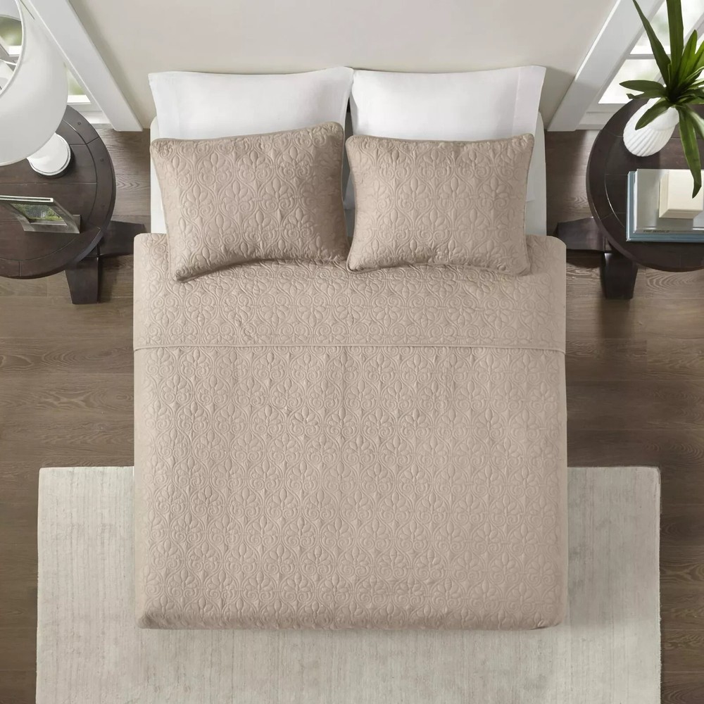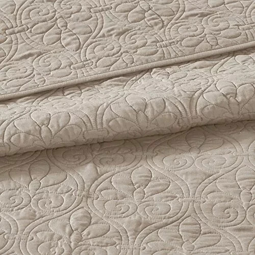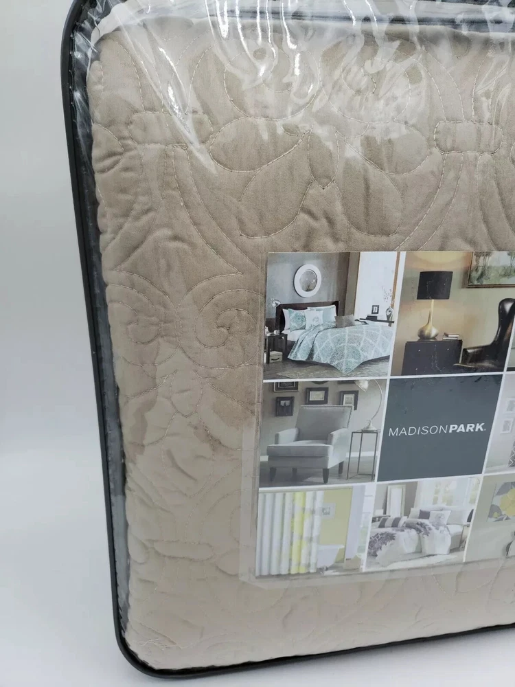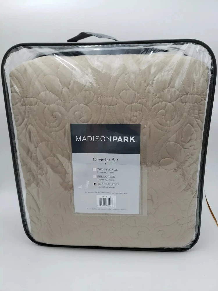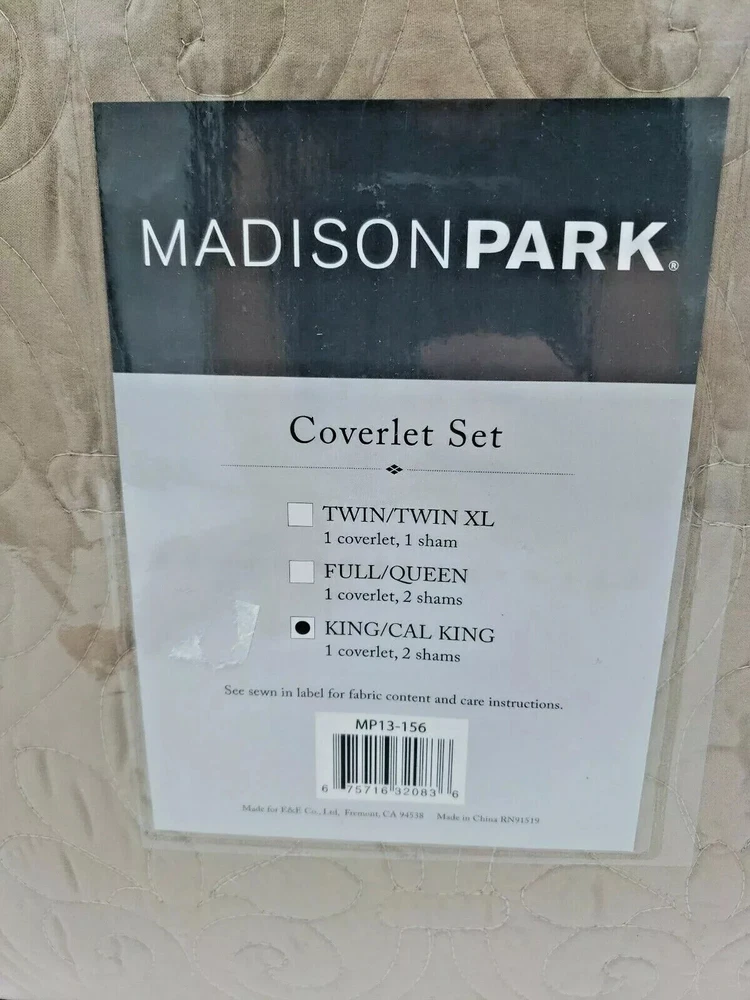 MADISON PARK QUEBEC 3 PIECES KING/CAL KING COVERLET SET COLOR KHAKI NEW INCLUDES 3 PIECES BRAND- MADISON PARK COLOR-KHAKI SIZE-KING/CAL KING NEW Set includes 1 coverlet, 2 shams Face fabric - 100% polyester, 90/10 cotton/other fiber filling for optimal comfort Measurement 104-by-94 inch coverlet, 20-by-36 inch King sham