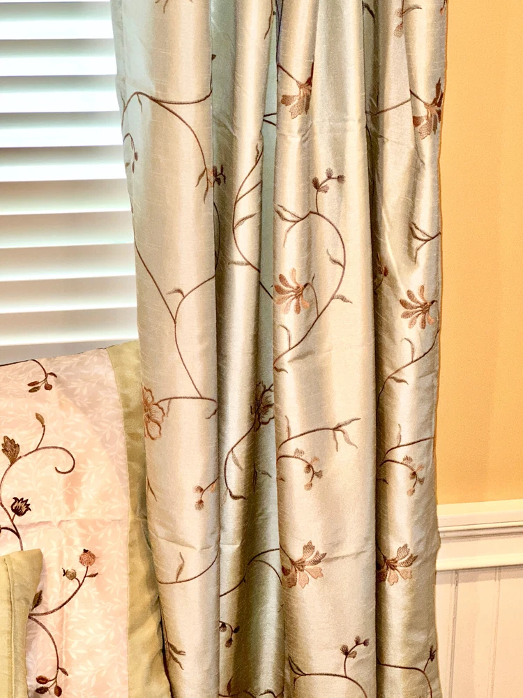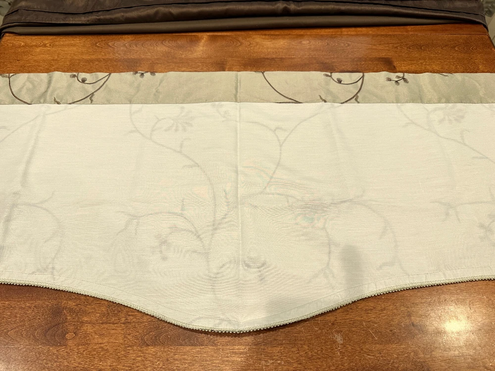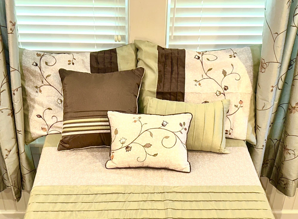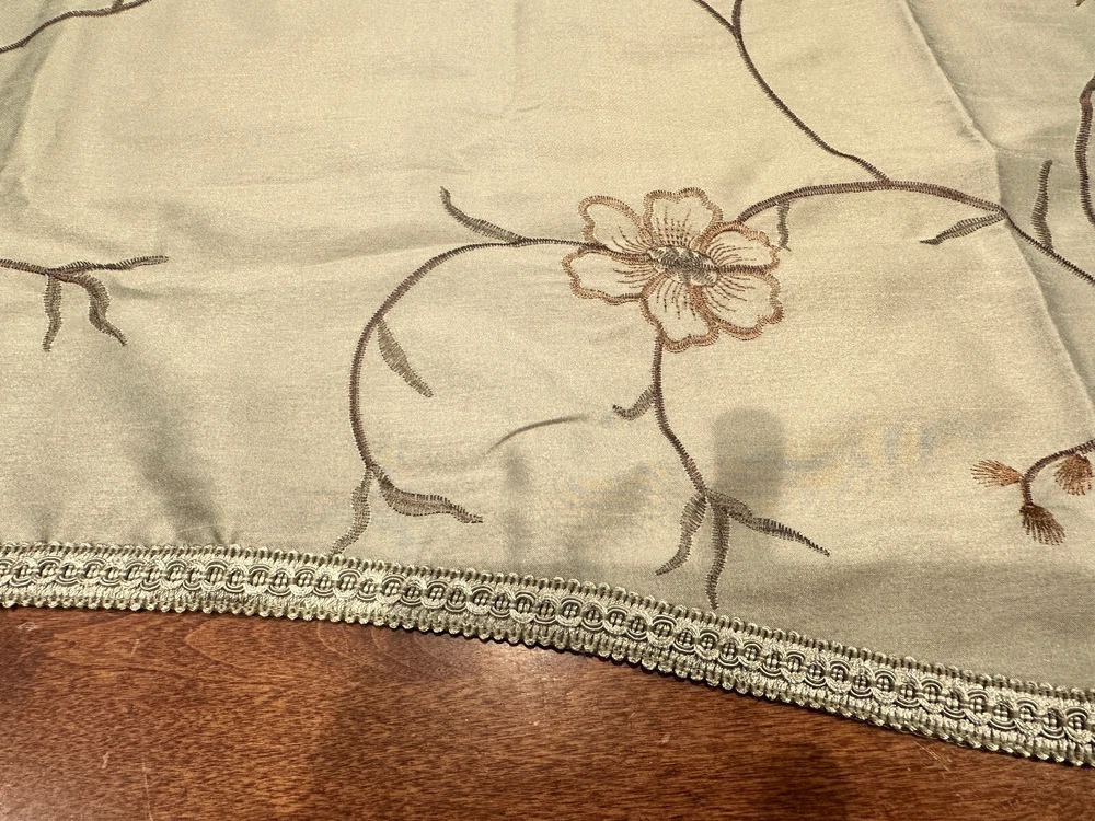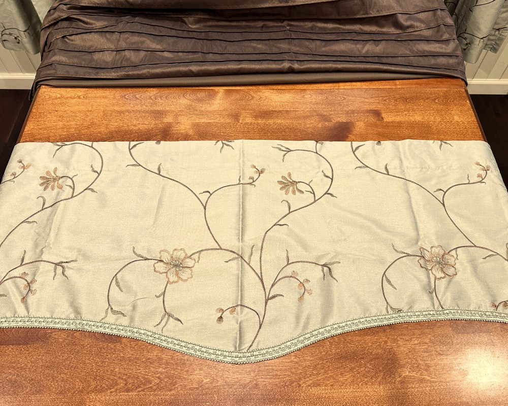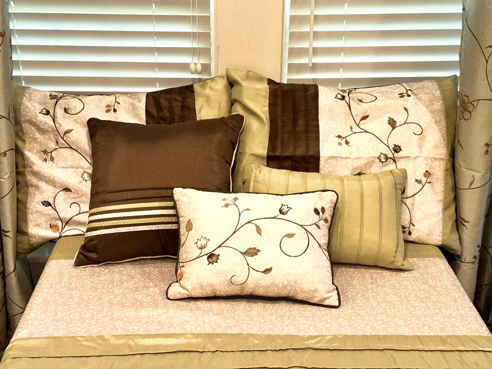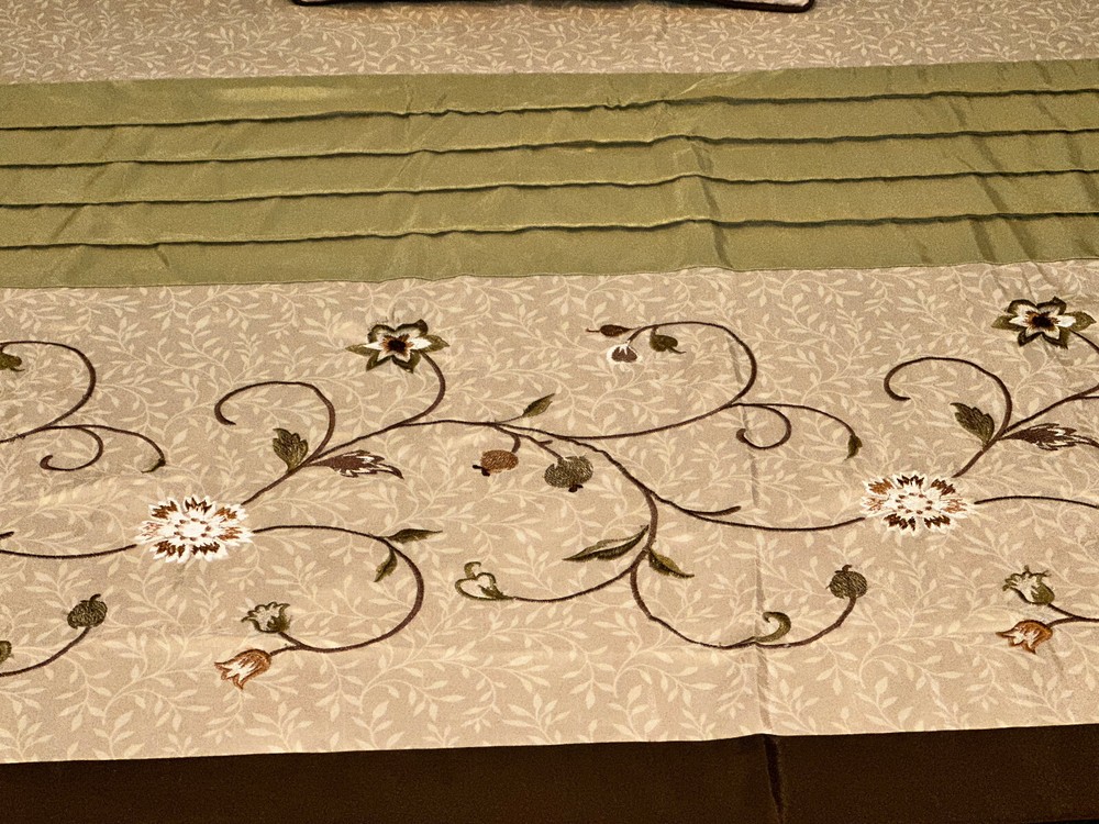 QUEEN SIZE DUVET BEDDING SET FROM MADISON PARK WITH MATCHING WINDOW TREATMENTS - This queen size duvet set is in really superb gently used condition as it was well taken care of. - It is a very nice shade of beige, brown and green with a beautiful floral vine pattern. - It comes with 3 matching decorative throw pillows and 2 standard size pillow shams. - Plus 4 matching 84" length lined rod pocket curtain panels which helps to prevent fading as well as being warmer in the winter. - Plus.....3 lined valances and 3 brown tiebacks! - This duvet opens and closes with buttons at the bottom and can be used alone or you can insert your own down comforter inside of it to fluff it up for luxurious comfort all night long. Either way it will look great in your home. You won't be disappointed by the quality! - Comes from a smoke and pet free home. I WOULD BE HAPPY TO ANSWER ANY QUESTIONS YOU MAY HAVE. THANKS FOR LOOKING!