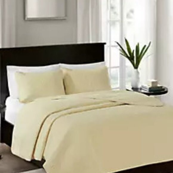 Quebec is the perfect coverlet to use as a layering piece or an alternative to your comforter for a new solid look. The classic stitch pattern pairs easily with your existing décor and will be sure to add a new decorative element to your bedroom. The coverlet has 100% cotton fill and the face and the reverse of the coverlet are a super soft brushed fabric. Dimensions: coverlet 90" x 90", standard shams 20" x 26" Set includes: 1 coverlet and 2 standard shams Polyester with cotton fill Machine washable Imported COLOR: Yellow SIZE: Queen