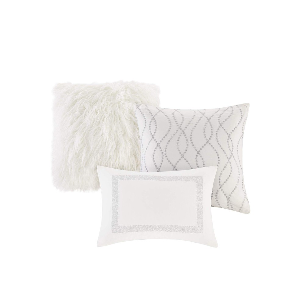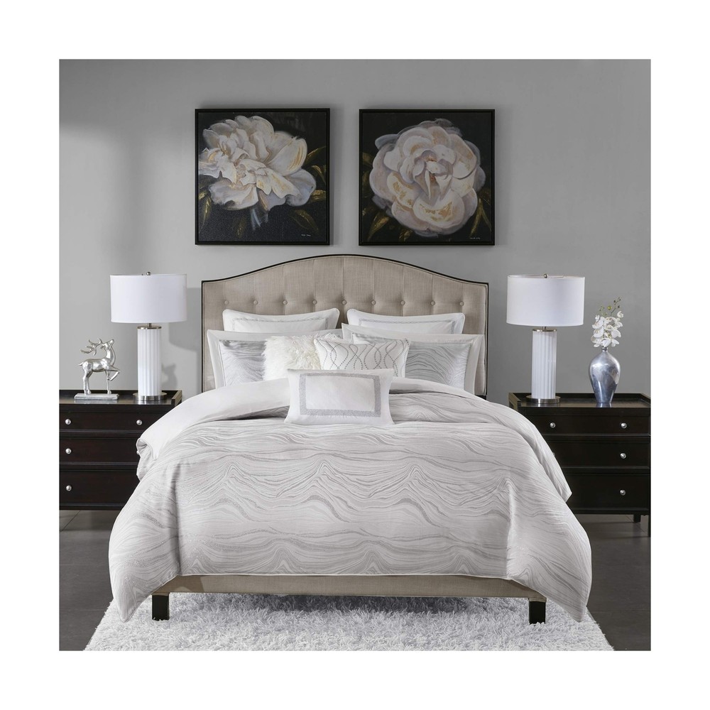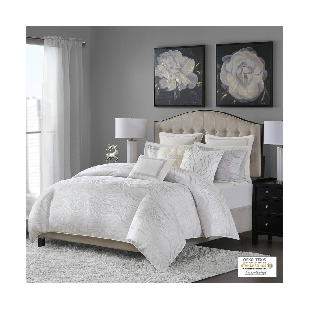 MADISON PARK SIGNATURE Hollywood Glam Cozy Comforter Set - All Season Bedding Combo Filled Insert and Removable Duvet Cover, Shams, Decorative Pillows, Metallic White King(110"x96") 10 Piece Product Details Color: White Size: King(110"x96") Brand: MADISON PARK SIGNATURE MPN: MPS10-311 UPC: 086569897077 EAN: 0086569897077 Size: King(110"x96") Included Components: 1 Comforter, 2 King Shams, 3 Euro Shams, 3 Decorative Pillows Color: White Age Range (Description): Adult Style: Luxurious style Size: King(110"x96") Included Components: 1 Comforter, 2 King Shams, 3 Euro Shams, 3 Decorative Pillows Color: White Age Range (Description): Adult Style: Luxurious style Brand: MADISON PARK SIGNATURE Theme: Modern Pattern: Striped Material: Fabric Fabric Type: 100% Polyester Number of Pieces: 10 Seasons: All Product Care Instructions: Dry Clean Only Product Dimensions: 96 x 110 x 1.5 inches Item Weight: 25.2 pounds Manufacturer: Madison Park Signature Country of Origin: China Item model number: MPS10-311 Is Discontinued By Manufacturer: No Refill: polyester Perfume: Unscented Specifications: certified frustration-free Assembly required: No Batteries required: No 100% Polyester The Madison Park Signature Hollywood Glam Comforter Set offers a modern and elegant update to the bedroom. The oversized and overfilled comforter uses and includes a removable duvet-style insert that is secured by inner ties and a hidden button closure. The comforter comes with a removable duvet cover and the decorative pillows have removable cover with hidden zipper that makes them easy to clean. MEASUREMENT - 1 Duvet Cover - 110(W) inches x 96(L) inches, 1 Comforter - 110(W) inches x 96(L) inches, 2 King Shams - 20(W) inches x 36(L) inches + 2 inch flange each, 3 Euro Shams - 26(W) inches x 26(L) inches each, 3 Decorative Pillows - 20(W) inches x 20(L) inches/ 20(W) inches x 20(L) inches/ 14(W) inches x 20(L) inches Care instructions: Machine wash cold, gentle cycle, and separately. Do not bleach. Tumble dry low, remove promptly. Do not iron. Spot clean pillow. If there is no free movement in the washer or dryer, use large capacity commercial washer/dryer. The Madison Park Signature Hollywood Glam Comforter Set offers a modern and elegant update to the bedroom. This jacquard comforter flaunts an all-over metallic detailing on the luxurious white base, for glamorous allure. Coordinating shams mirror the motif of the comforter and the Euro shams feature a rich cotton velvet face with embroidered details. Three decorative pillows are embellished with unique embroidery and texture, adding dimension and glam to this lavish comforter set. The oversized and overfilled comforter uses and includes a removable duvet-style insert that is secured by inner ties and a hidden button closure. This provides no visible bartacking lines on top of the bed to create a smooth, clean face. Dry clean comforter cover only and machine wash comforter filler. This bedding set is OEKO-TEX certified, meaning it does not contain any harmful substances or chemicals, ensuring quality comfort and wellness. Payment Back to Top We accept Paypal and All Major Credit Cards. Shipping & Handling Back to Top Item will be shipped FREE standard shipping in 1 business day after payment is received. Express Shipping services are available. Tracking number will be provided. Return Policy Back to Top Items can be returned for exchange or full refund within 30 days from the date you receive your merchandise. Please contact us before starting a return request, so we can resolve any issues and provide free returns if needed. Return shipping is the responsibility of buyer unless the return is a result of our mistake (i.e., your receive the wrong item). Contact Us Back to Top If you have any questions please contact us. We will respond within 1 business day or less.