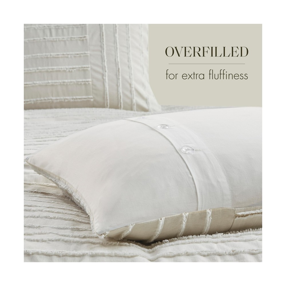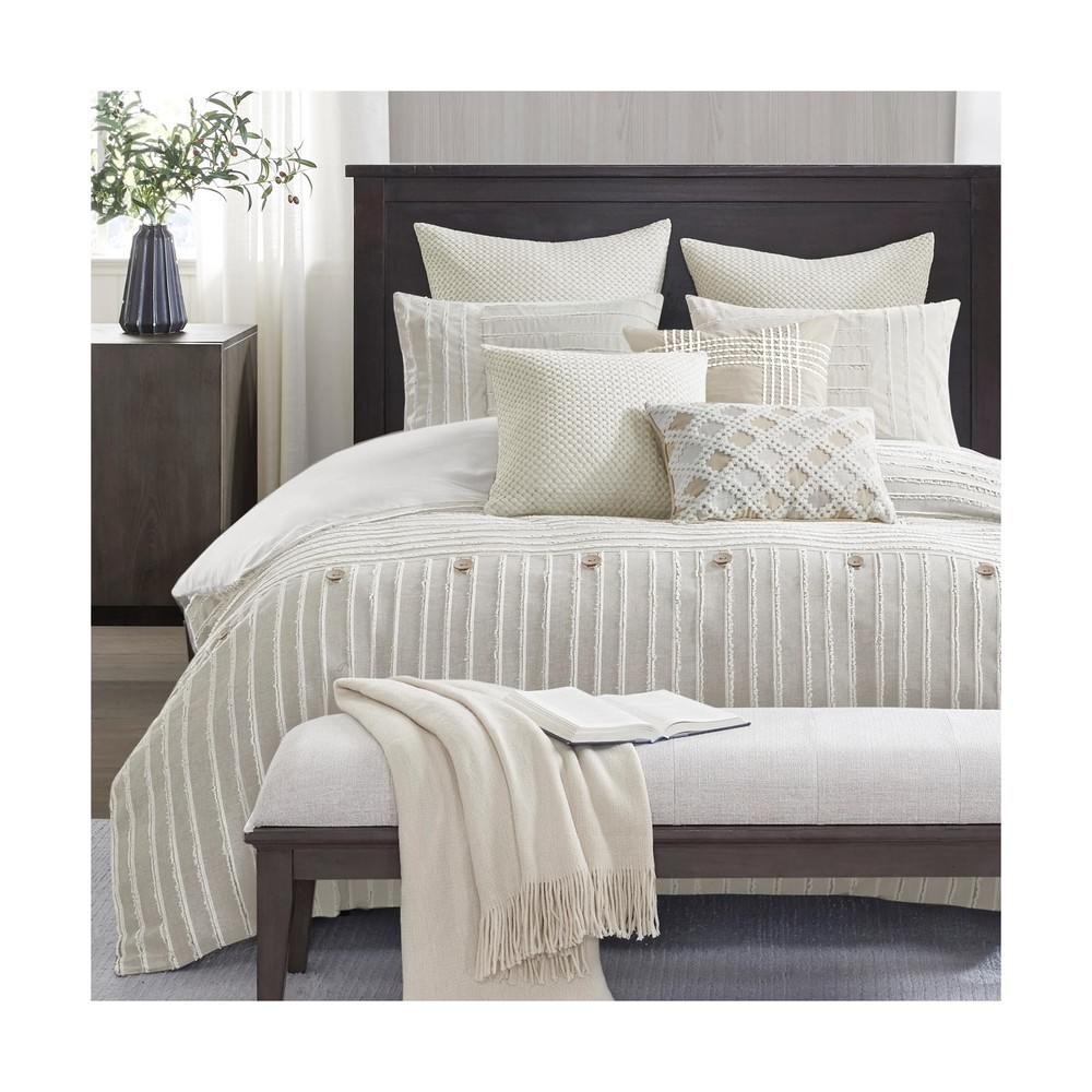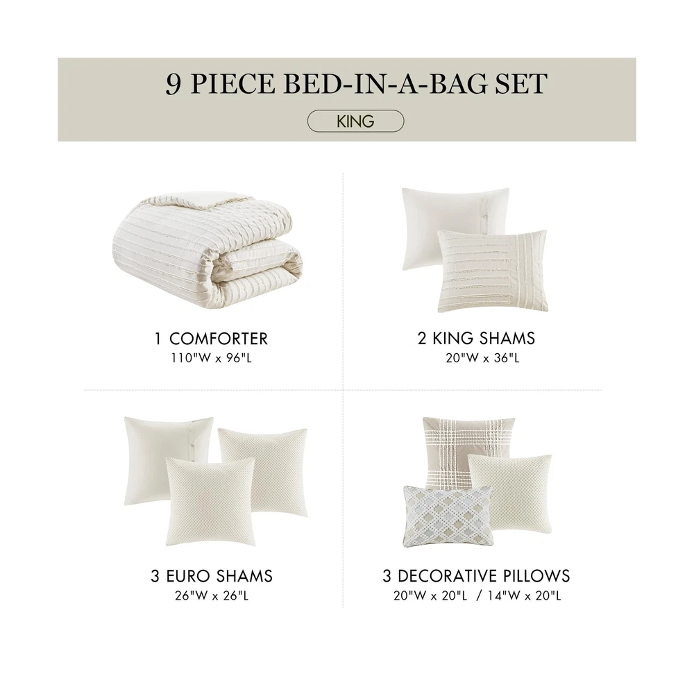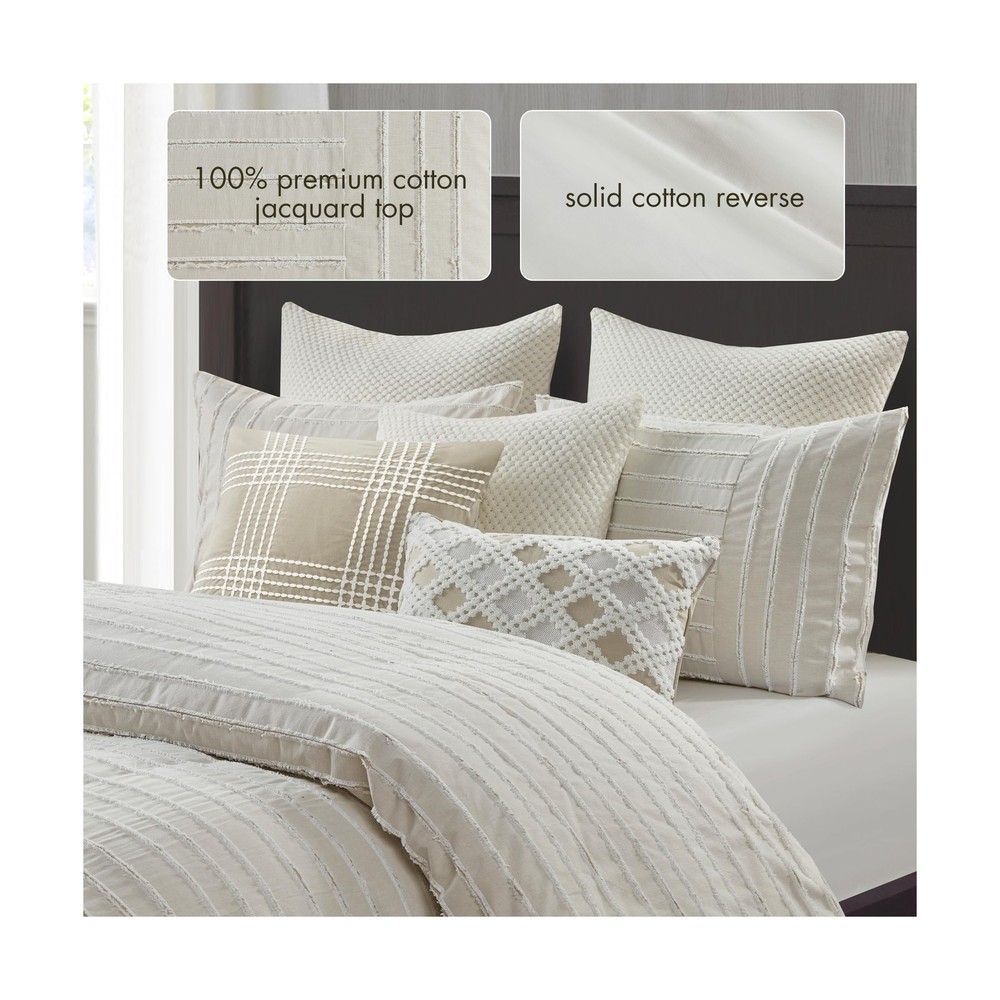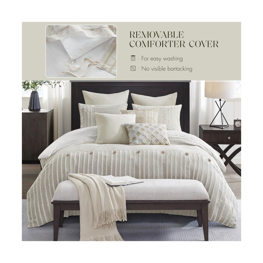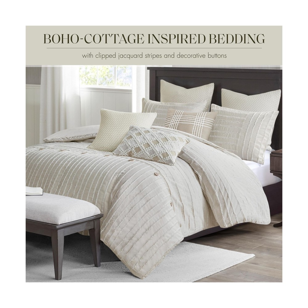 MADISON PARK SIGNATURE King Comforter Set Clipped Jacquard Stripes with Buttons Boho Comforter for a King-Size Bed, Cotton Oversized Comforters with Removable Cover Boho Bedding, King Ivory 9 Piece Product Details Size: King Color: Ivory Brand: MADISON PARK SIGNATURE MPN: MPS10-497 UPC: 022164252019 EAN: 0022164252019 Size: King Included Components: 1 Comforter 2 King Shams 3 Euro Shams 2 Decorative Pillows 1 Decorative Pillow Color: Ivory Style: Comforter Set Brand: MADISON PARK SIGNATURE Size: King Included Components: 1 Comforter 2 King Shams 3 Euro Shams 2 Decorative Pillows 1 Decorative Pillow Color: Ivory Style: Comforter Set Brand: MADISON PARK SIGNATURE Theme: Love Pattern: Striped Material: Cotton Fabric Type: Comforter/Sham Face: 100% Cotton Clip Jacquard Pieced With Decorative Button; Back: 100% Cotton; Removable Seperate Polyester Filler Insert Euro Sham Face: 100% Arylic Knitted Fabric, Back: 100% Cotton Faux Linen Square Pillow 1 Cover: 100% Acrylic Knitted Fabric Square Pillow 2 Cover: 100% Cotton Faux Linen With Embroidery Oblong Pillow Cover: 100% Cotton Faux Line With Embroidery All Pillows With Hidden Zipper and 100% Polyester Filling Number of Pieces: 9 Seasons: All Thread Count: 180 Product Care Instructions: Dry Clean Only Manufacturer: E&E Co. Ltd DBA JLA Home UPC: 022164252019 Product Dimensions: 96 x 110 x 1.5 inches Item Weight: 22.5 pounds Country of Origin: China Item model number: MPS10-497 Refill: cotton Batteries required: No Comforter/Sham Face: 100% Cotton Clip Jacquard Pieced With Decorative Button; Back: 100% Cotton; Removable Seperate Polyester Filler Insert Euro Sham Face: 100% Arylic Knitted Fabric, Back: 100% Cotton Faux Linen Square Pillow 1 Cover: 100% Acrylic Knitted Fabric Square Pillow 2 Cover: 100% Cotton Faux Linen With Embroidery Oblong Pillow Cover: 100% Cotton Faux Line With Embroidery All Pillows With Hidden Zipper and 100% Polyester Filling Cottage Inspired Boho Bed Set - Boho-cottage bedding with clipped jacquard stripes and decorative buttons, offering casual elegance. The comforter's removable cover adds sophistication with non-visible bartack and allows for easy care Cotton Comforter Set - Crafted from breathable cotton, this generously-sized comforter offers enhanced coverage for a cozy night's sleep. Overfilled with skin-friendly down alternative filling for fluffiness ensuring year-round comfort Oversized - Offering enhanced comfort with its oversized coverage and overfilled for extra fluffiness, providing perfect warmth and cloudlike comfort. Conveniently comes with removable cover featuring hidden button closure & inner ties for easy care 9 piece King comforter set - 1 Comforter 110"W x 96"L, 2 King Shams 20"W x 36"L (2), 3 Euro Shams 26"W x 26"L (3), 2 Decorative Pillows 20"W x 20"L (2), 1 Decorative Pillow 14"W x 20"L Easy Care - Duvet cover is conveniently removable. Dry clean duvet cover and machine washable comforter filler. Spot clean pillows (see wash label) This farmhouse styled cotton clip jacquard comforter features a pieced design with striped pattern and decorative buttons, for a casual look. Two matching shams and two coordinating Euro knit shams (3 in King size) complement the top of the bed. Also included are three decorative pillows: one knit square, one trimmed square with embroidery details, and one carpet stitch oblong with decorative embroidery details that add the finishing touches to this set. This oversized and overfilled comforter uses a removable duvet-style insert that is secured by inner ties and a hidden button closure. Dry clean for comforter cover and machine wash for inserts. Payment Back to Top We accept Paypal and All Major Credit Cards. Shipping & Handling Back to Top Item will be shipped FREE standard shipping in 1 business day after payment is received. Express Shipping services are available. Tracking number will be provided. Return Policy Back to Top Items can be returned for exchange or full refund within 30 days from the date you receive your merchandise. Please contact us before starting a return request, so we can resolve any issues and provide free returns if needed. Return shipping is the responsibility of buyer unless the return is a result of our mistake (i.e., your receive the wrong item). Contact Us Back to Top If you have any questions please contact us. We will respond within 1 business day or less.