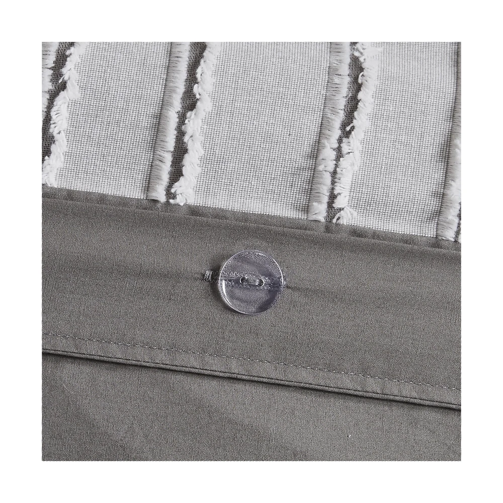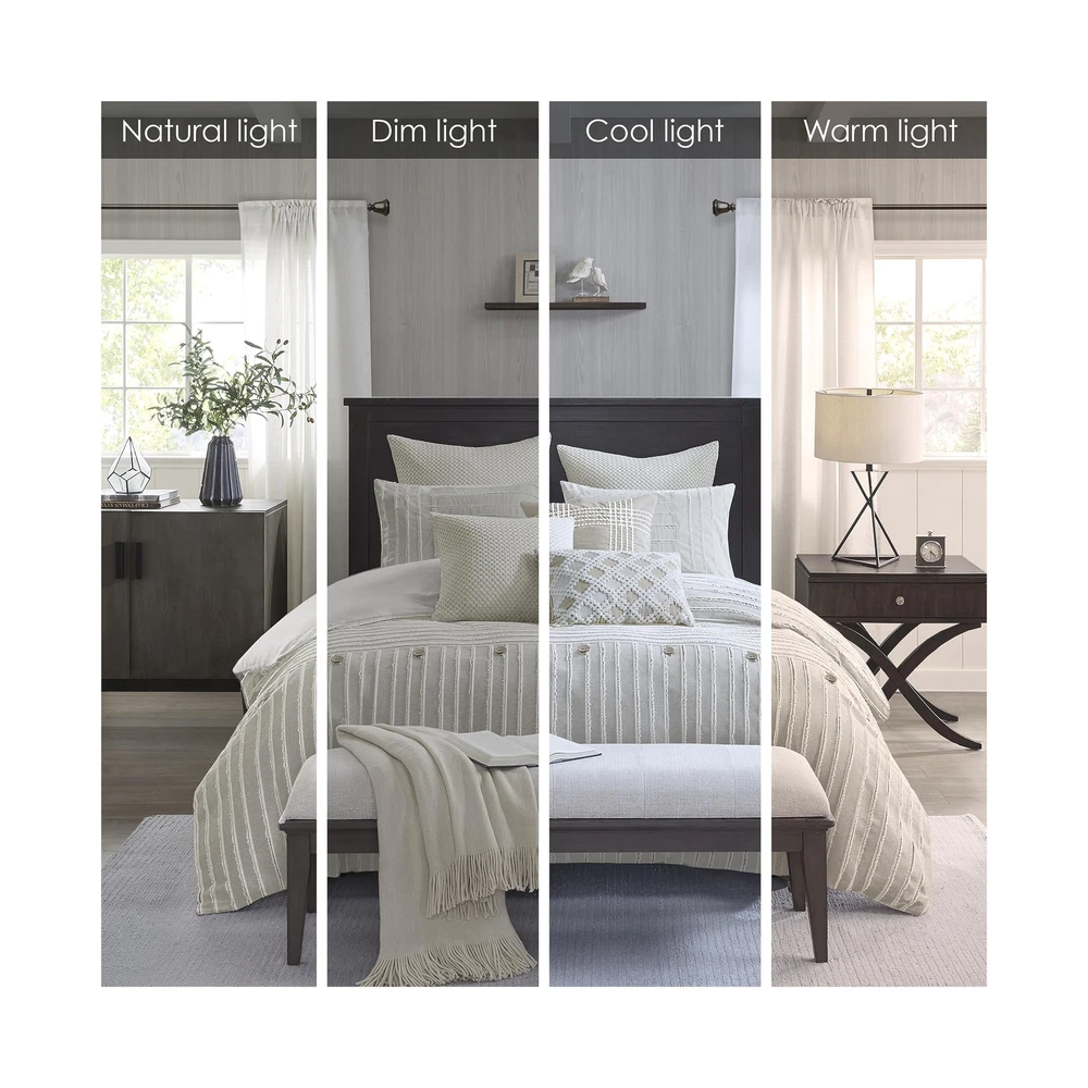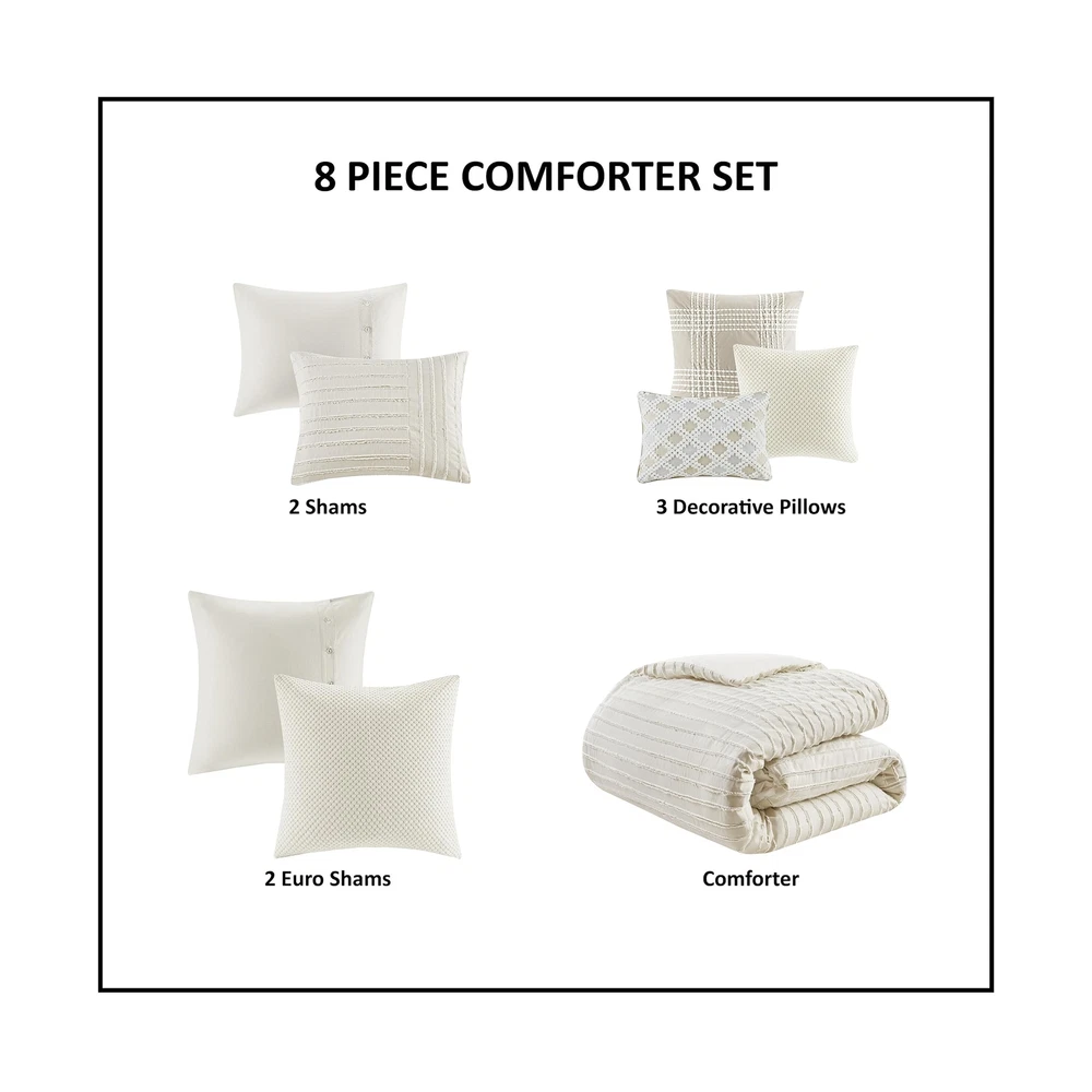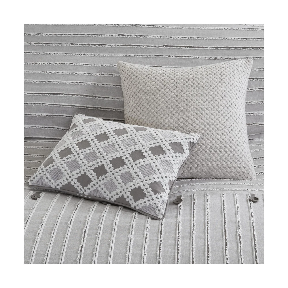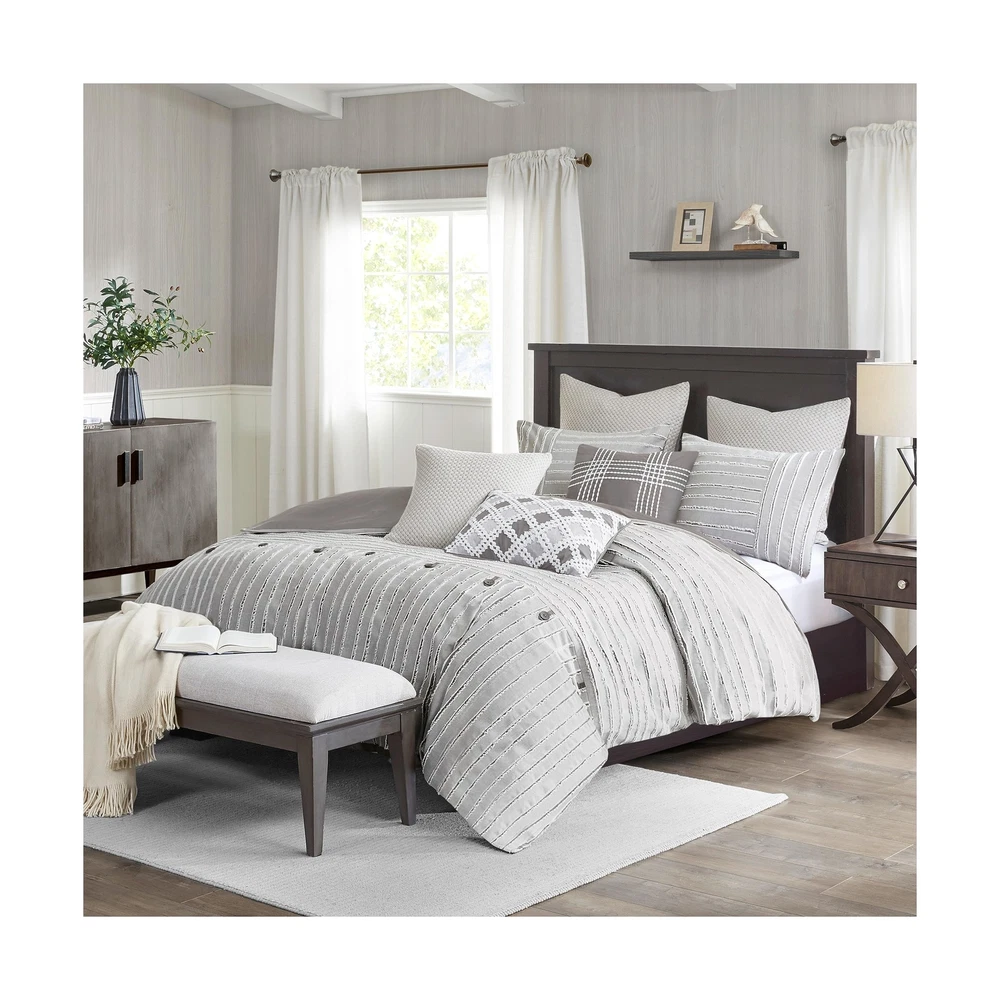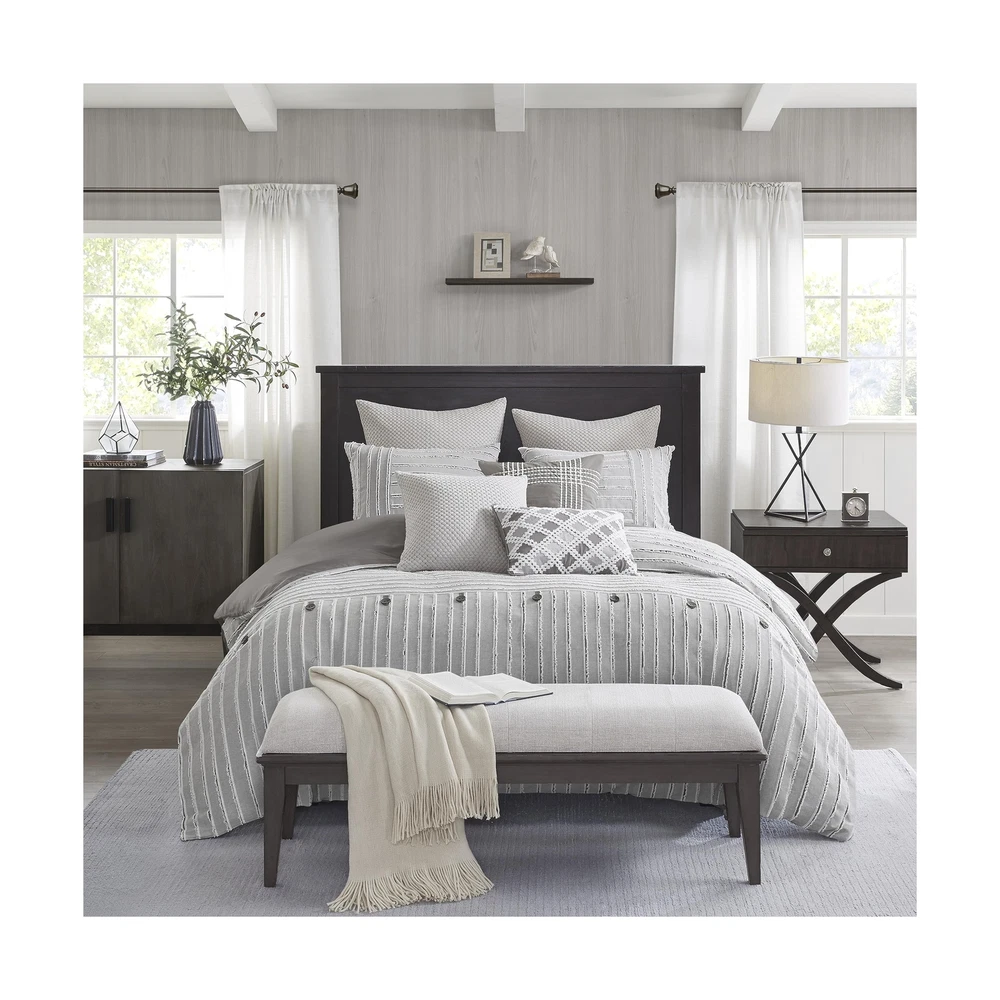 MADISON PARK SIGNATURE Queen Comforter Set, Removable 100% Cotton Duvet Cover Queen Size with Insert, Farmhouse Bedding, Textured Stripe Clipped Jacquard Accent, Queen, Grey 8 Piece Product Details Size: Queen Color: Grey Brand: MADISON PARK SIGNATURE MPN: MPS10-463 UPC: 086569406491 EAN: 0086569406491 Size: Queen Included Components: 1 Comforter, 2 Standard Shams, 2 Euro Shams, 2 Decorative Pillows, 1 Decorative Pillow Color: Grey Style: Comforter Set Brand: MADISON PARK SIGNATURE Size: Queen Included Components: 1 Comforter, 2 Standard Shams, 2 Euro Shams, 2 Decorative Pillows, 1 Decorative Pillow Color: Grey Style: Comforter Set Brand: MADISON PARK SIGNATURE Theme: Love Pattern: Striped Material: Cotton Fabric Type: 100% Cotton Number of Pieces: 8 Seasons: All Product Care Instructions: Machine Wash Manufacturer: E&E Co. Ltd DBA JLA Home UPC: 086569406491 Item dimensions L x W x H: 96 x 92 x 1.5 inches Product Dimensions: 96 x 92 x 1.5 inches Item Weight: 20.9 pounds Country of Origin: China Item model number: MPS10-463 Refill: fiber, polyester, cotton Batteries required: No 100% Cotton FARMHOUSE DECOR - Modern farmhouse decor features a pieced design with striped pattern and decorative buttons, for a casual look. REMOVABLE duvet insert design makes it easier to wash OVERSIZED & OVERFILLED - Introducing Essence, the oversized comforter for Queen size bed with a breathable and soft cotton cover, ensuring a cozy and comfortable sleep experience DUVET STYLE - Comforter features clean "duvet style" with no bartack stitching. Duvet insert is removable for easy wash. Equipped with inner ties and a hidden button closure to keep it secured in place Set include: 1 Comforter: 92"W x 96"L, 2 Standard Shams: 20"W x 26"L, 2 Euro Shams: 26"W x 26"L, 2 Decorative Pillows: 20"W x 20"L, 1 Decorative Pillow: 14"W x 20"L CARE - Duvet cover is dry clean only; insert is machine washable. Use large capacity washer and dryer for best results. Cold/delicate cycle, low/no heat dry. Comes in compressed packaging, fluff up items as needed. Steam iron for wrinkles This farmhouse styled cotton clip jacquard comforter features a pieced design with striped pattern and decorative buttons, for a casual look. Two matching shams and two coordinating Euro knit shams (3 in King size) complement the top of the bed. Also included are three decorative pillows: one knit square, one trimmed square with embroidery details, and one carpet stitch oblong with decorative embroidery details that add the finishing touches to this set. This oversized and overfilled comforter uses a removable duvet-style insert that is secured by inner ties and a hidden button closure. This provides no visible bartacking lines on top of the bed to create a smooth, clean face. It comes in 2 colors including an ivory on natural light taupe ground or a white on grey ground. Dry clean comforter cover only and machine wash comforter filler. Payment Back to Top We accept Paypal and All Major Credit Cards. Shipping & Handling Back to Top Item will be shipped FREE standard shipping in 1 business day after payment is received. Express Shipping services are available. Tracking number will be provided. Return Policy Back to Top Items can be returned for exchange or full refund within 30 days from the date you receive your merchandise. Please contact us before starting a return request, so we can resolve any issues and provide free returns if needed. Return shipping is the responsibility of buyer unless the return is a result of our mistake (i.e., your receive the wrong item). Contact Us Back to Top If you have any questions please contact us. We will respond within 1 business day or less.