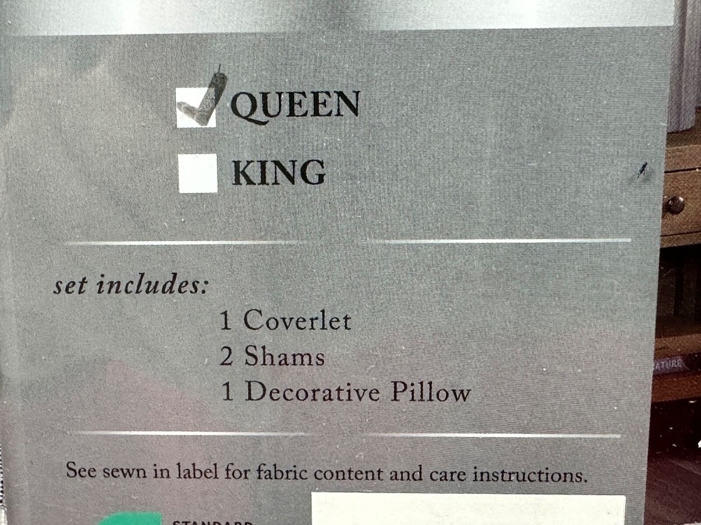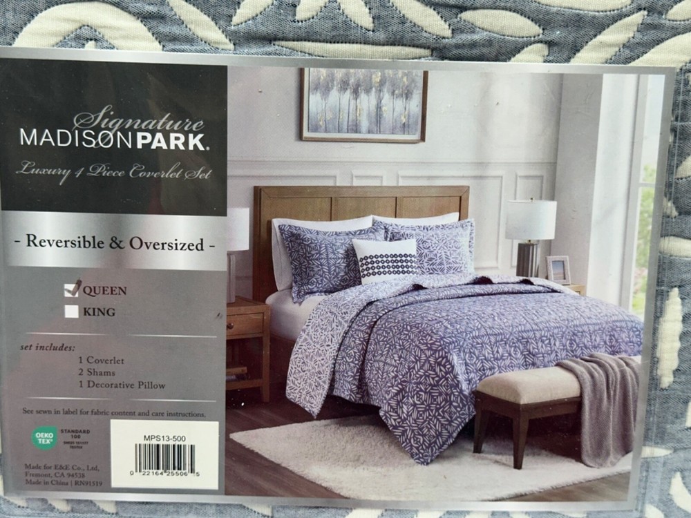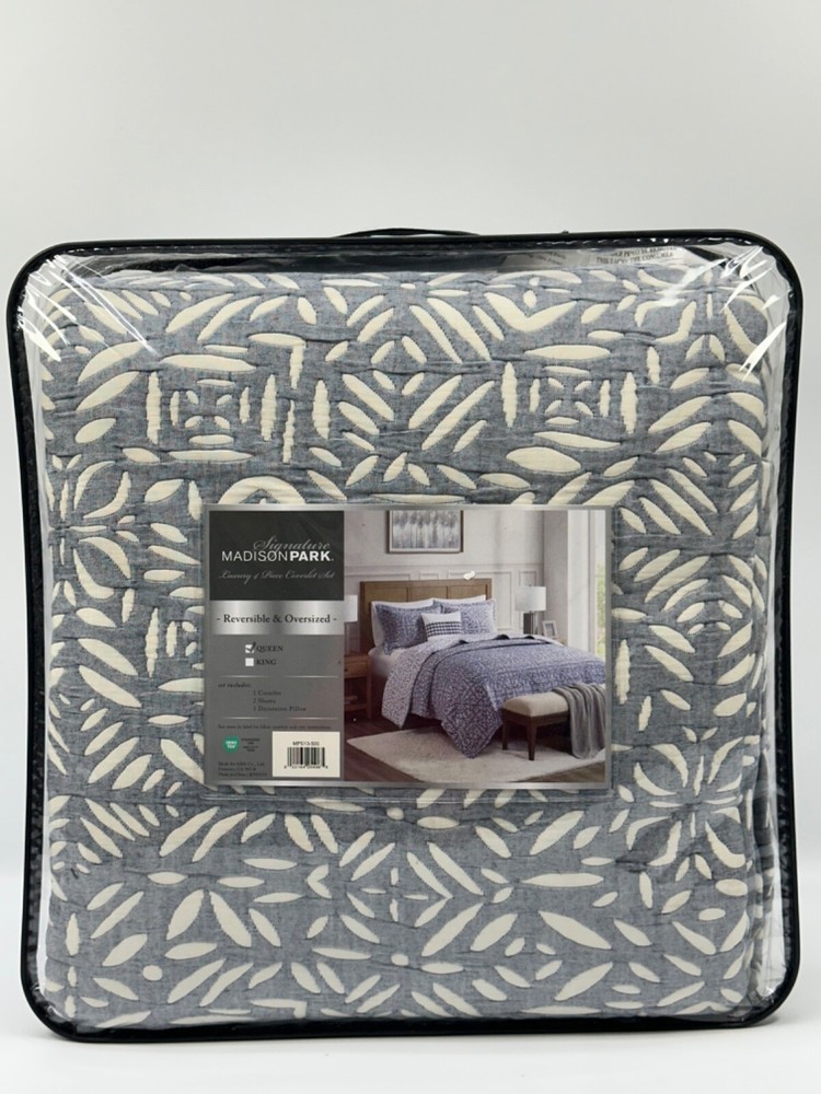 MADISON PARK SIGNATURE Queen Quilt Set Metelasse Reversible Coverlet Set Queen Size, Soft Summer Quilt, All Season Lightweight Botannical Bedding Queen, Shams, Harmony, Full/Queen, Gray About this item Microfiber Cozy Charming Bedding Set - Elevate your bedroom décor with our Harmony coverlet set, featuring a charming botanical reversible matelasse design for a sophisticated visual interest and dimension offering a stylish update to your bedroom décor All Season Comfort - Enhance your bedding comfort with our soft matelasse coverlet set, providing year-round comfort. Lightweight and breathable, it's perfect for staying cozy in the summer or adding an extra layer of warmth in winter Reversible - Our reversible quilt set features a charming botanical motif in two subtle colors scheme on each side, offering a quick bedding refresh with just a flip. OEKO-TEX certified for exceptional quality, comfort, and wellness ensuring cozy comfort Oversized Coverlet Set - 1 Full/Queen Quilt Set: 92"W X 96"L, 2 Standard Shams: 20"W X 26"L +2"D. Includes 1 Decor Throw Pillow 18"W x 18"L DURABLE & EASY CARE: Our matelasse quilt offers durability to withstand daily wear and tear. Simply machine wash cold. Gently and separately. Do not bleach, Tumble dry low. Iron on medium temperature if needed