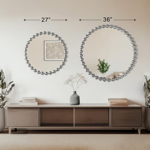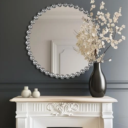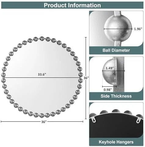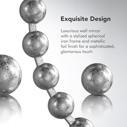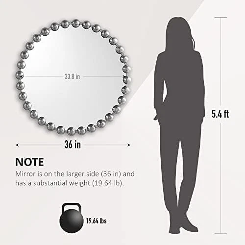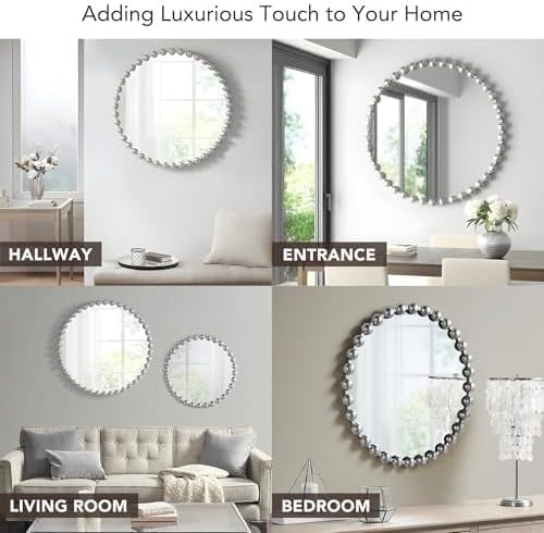 This is an OpenBoxed Item. Our Opened Box items are in great condition. Typically the item is 100% brand new in a replaced box. A great way to get a lot more for your money. All our items are 100% guaranteed! So buy worry free! MADISON PARK SIGNATURE Wall Décor Marlowe Metal 27"L x 27"W, Silver Product Details Brand: MADISON PARK SIGNATURE Room Type: Bathroom, Living Room, Bedroom, Hallway Shape: Round Product Dimensions: 27"L x 27"W Frame Material: Metal Style: Modern/Contemporary Mounting Type: Wall Mount Finish Type: Antique Surface Recommendation: Wall Special Feature: Antique, Spherical Frame Color: Silver Theme: Contemporary,Modern Specific Uses For Product: Home Decor Number of Pieces: 1 Number of Items: 1 Material: Iron: 45%, Mirror: 45%, MDF: 10%, Iron, Mirror, MDF Frame Type: Framed Item Weight: 11.66 Pounds Assembly Required: No Frame Color: Silver Manufacturer: E&E Co. Ltd DBA JLA Home Frame Size: 27 inches Size: 27"L x 27"W Item Weight: 11.66 pounds Country of Origin: China Item model number: MPS95F-0035 Fabric Type: Iron: 45%, Mirror: 45%, Mdf: 10% Finish types: Antique Care instructions: Spot clean Batteries required: No Included Components: 1 Decor Mirror Iron: 45%, Mirror: 45%, Mdf: 10% Reimagine your space with our Madison Park Signature Marlowe Decor Mirror. This round mirror features a stylized spherical iron frame finished with metallic foil, creating a bold and glamorous allure Elevate your space with the unmatched beauty and refined aesthetic of our premium wall mirror For your convenience it's ready to hang featuring keyhole fixtures on the back make it easy to hang on any wall. Please note this mirror is on the larger side (27") in diameter, and has a substantial weight (11.66 lbs.) Please make sure you have the required wall space for hanging before purchase. CARE - Spot clean only do not use bleach or any harsh chemical solution to maintain original color quality Elevate your home decor with the Madison Park Signature Marlowe Round Silver Wall Mirror. This large 27" decorative mirror features a vintage-inspired beaded frame with a hand-applied antique silver finish, perfect for adding luxury and charm to any room. Crafted with high-definition glass, this generously sized round wall mirror offers a clear, distortion-free reflection and comes ready to hang with pre-installed hangers, making it an ideal wall decor statement piece for your vanity, living room, bedroom, or entryway. Shop now to bring a touch of timeless elegance to your home.