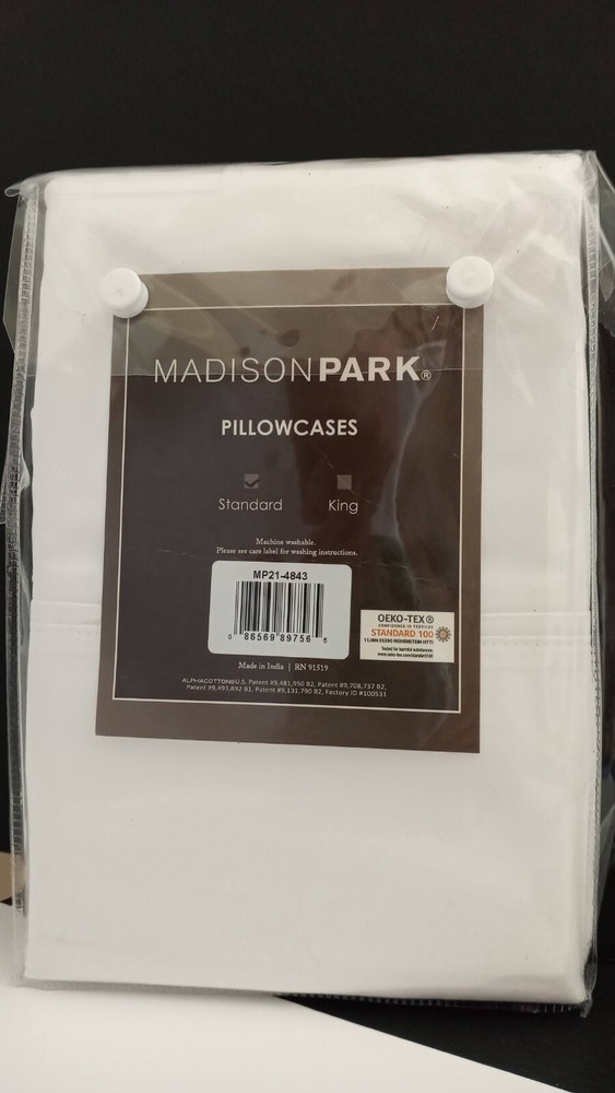 Please Note: The plastic packaging for these pillowcases is torn on the sides only, however, the pillowcases are brand new (never used), clean and in excellent condition. Indulge in the ultimate luxury of Madison Park's 1500 Thread Count Cotton Rich Pillowcases. The rich, soft feel of the cotton rich fabric provides the ultimate comfort. Cotton Rich fabric reduces shrinkage and is wrinkle resistant. The fine yarns create a lighter, softer, smoother feel for sleeping comfort. Machine washable for easy care. Quantity: 2 Pillowcases Size: 30" L x 20" W Fabric: Plain Weave - Cotton 51%, Polyester 49% Features: Vegan, Cruelty-Free + Eco-Friendly Thread Count: 1500 Certification: OEKO TEX Certified Standard 100 by OEKO-TEX - Includes no harmful substances or chemicals Color: White Disposal: After use, Upcycle or donate to textile recycling center near you. e.g. Goodwill, American Recyclers or TerraCycle Origin: India RETAIL PRICE: $50.00 ~~~ We aim to show you accurate product information. Manufacturers, suppliers and others provide what you see here, and we have not verified it. Vegans On Sale LLC does not represent or warrant that the nutrition, ingredient, allergen and other product information here are accurate or complete, since this information comes from the product manufacturers. On occasion, manufacturers many improve or change their product formulas and update their labels. We recommend that you do not rely solely on the information presented on here and that you review the product's labels, warnings and directions before using or consuming a product or contact the manufacturer directly if you have specific product concerns or questions. If you have specific healthcare concerns or questions about the products displayed, please contact your licensed healthcare professional for advice or answers. Contact your health-care provider immediately if you suspect that you have a medical problem . INFORMATION AND STATEMENTS regarding dietary supplements HAVE NOT BEEN EVALUATED BY THE FOOD AND DRUG ADMINISTRATION (FDA) and are not INTENDED TO DIAGNOSE, TREAT, CURE, OR PREVENT ANY DISEASE or HEALTH CONDITION. You should not use this information as self-diagnosis or for treating a health problem or disease. CONTENT ON THIS SITE IS FOR REFERENCE PURPOSES ONLY and is not intended to substitute for advice given by a physician, pharmacist, or other licensed health-care professional. Vegans On Sale LLC assumes no liability for inaccuracies or misstatements about products. UPC: 086569897565