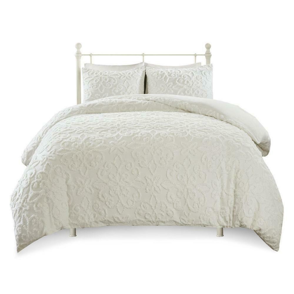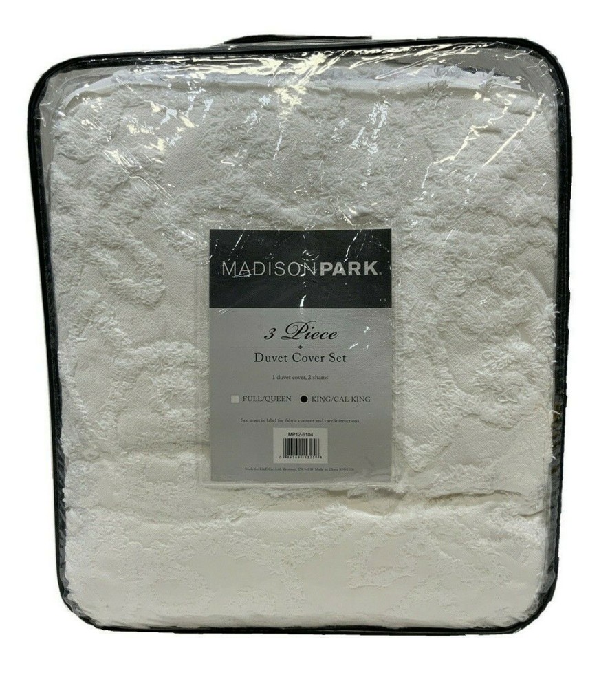 MADISON PARK - DUVET SET DUVET SET Color: WHITE Retail: 180 Description MADISON PARK White 3-Piece Tufted Cotton Chenille Duvet Cover Set KING/CAL KING NEW IN PACKAGE Give your bedroom a cozy shabby chic look with the Madison Park Sabrina 3 Piece Tufted Cotton Chenille Duvet Cover Set. The cotton chenille duvet cover and 2 shams flaunt a tufted floral medallion motif, creating a charming farmhouse look. Made with a 100% cotton face and reverse, this tufted cotton duvet cover set offers a shabby chic update for your bedroom. This bedding set is also OEKO-TEX certified, meaning it does not contain any harmful substances or chemicals to ensure quality comfort and wellness. A button closure helps secure a comforter insert within the duvet cover and inside ties in the corners help prevent it from shifting (insert is NOT included). Due to the nature of the chenille fabric, some shedding will occur naturally in the first 3-4 washes. King/Cal King Size include: 1 Duvet Cover:104"W x 92"L 2 King Shams:20"W x 36"L (2) Care Instruction: Machine Washable Material Details: Duvet/Sham: 100% tufted cotton chenille face and cotton reverse; button closure Materials: COTTON Shipping to Hawaii, Puerto Rico and Alaska is not free. We offer a 30 days refund policy only if the items sold are found to be incorrectly described. We are not responsible for pictures showing incorrectly on your monitor. The refunds will only be made if the following return guidelines are followed: The item must be returned in all the original packaging, including cartons, boxes and must not have been cleaned or laundered. All returns must be boxed and packed securely for shipping. Refunds are within 30 days from the day the customer received the original item. We will send you a prepaid label to send the item back. If the item is found to be as described you will receive a refund of your winning bid minus shipping both ways and a 20% restocking fee. We may except returns that do not qualify under our return policy. These returns will only be accepted at our discretion and a restocking fee may apply. Refund will be made within 5 days of getting the item back.