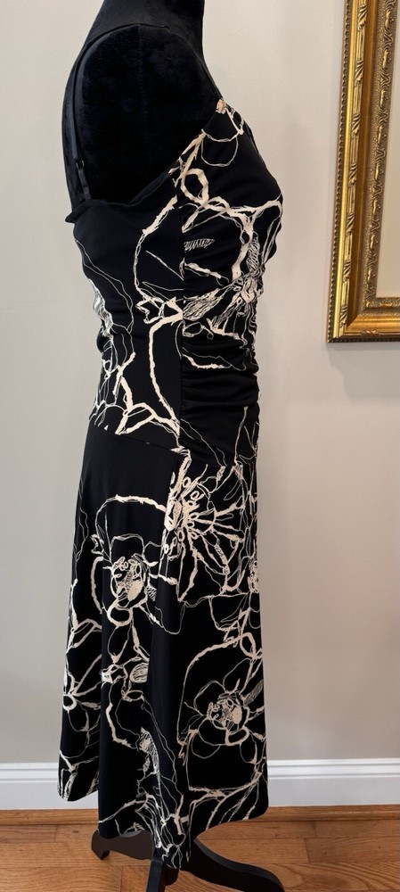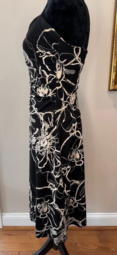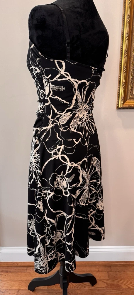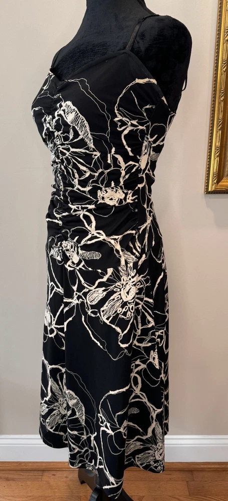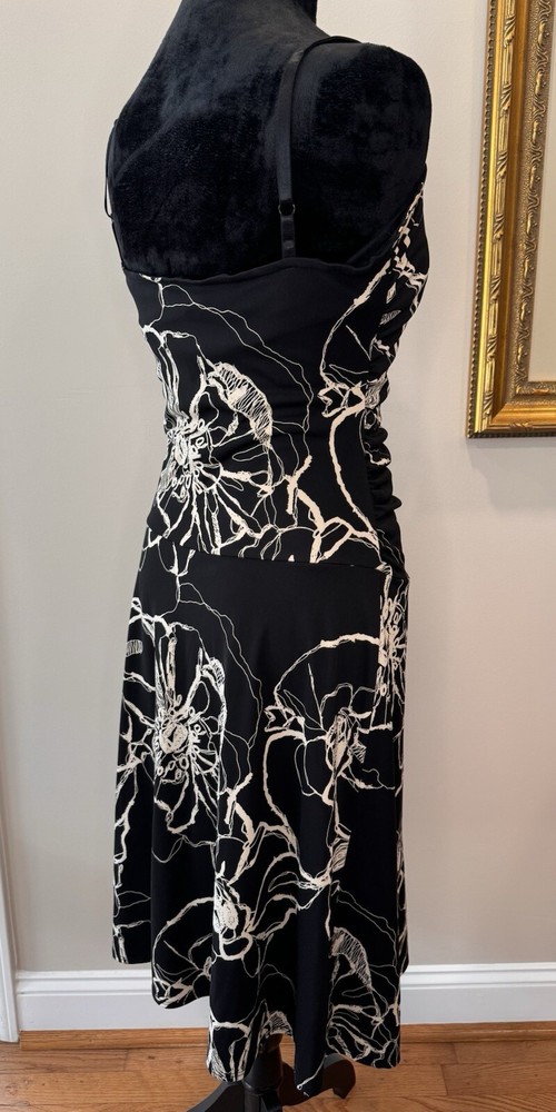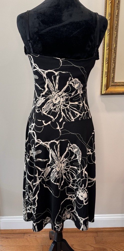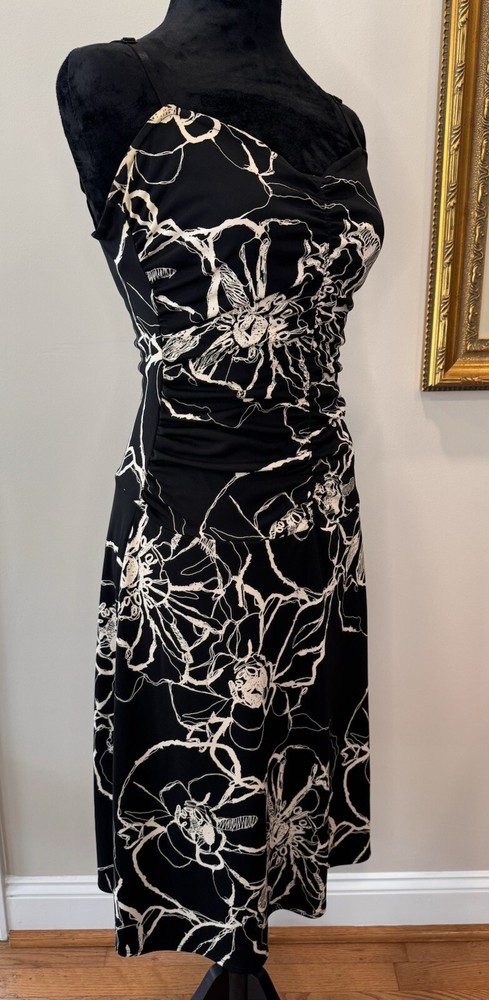 This beautiful black and white floral dress from Max Studio is perfect for any occasion. The sleeveless design and elastic spaghetti straps make it ideal for summer, fall, or spring events, whether you're traveling, attending a party or cocktail event, or just going casual. The sweetheart neckline and pullover closure add to its stylish and comfortable fit, while the floral pattern and collarless, lightweight fabric make it a vintage-inspired piece that's sure to turn heads. The dress is made from high-quality polyester material that is easy to care for and machine washable. It features a fit and flare style, with adjustable and open straps for added comfort and flexibility. This dress is a must-have for any woman who wants to look her best, without compromising on style or comfort. Excellent preloved condition! Max Studio Ladies size Small 100% Polyester Made in USA Lay flat measurements Pit to pit 14” Shoulder to Shoulder 12” Shoulder to hem 39” Waist 13” Hips 16” Sleeves spaghetti strap Hemline 30.5”