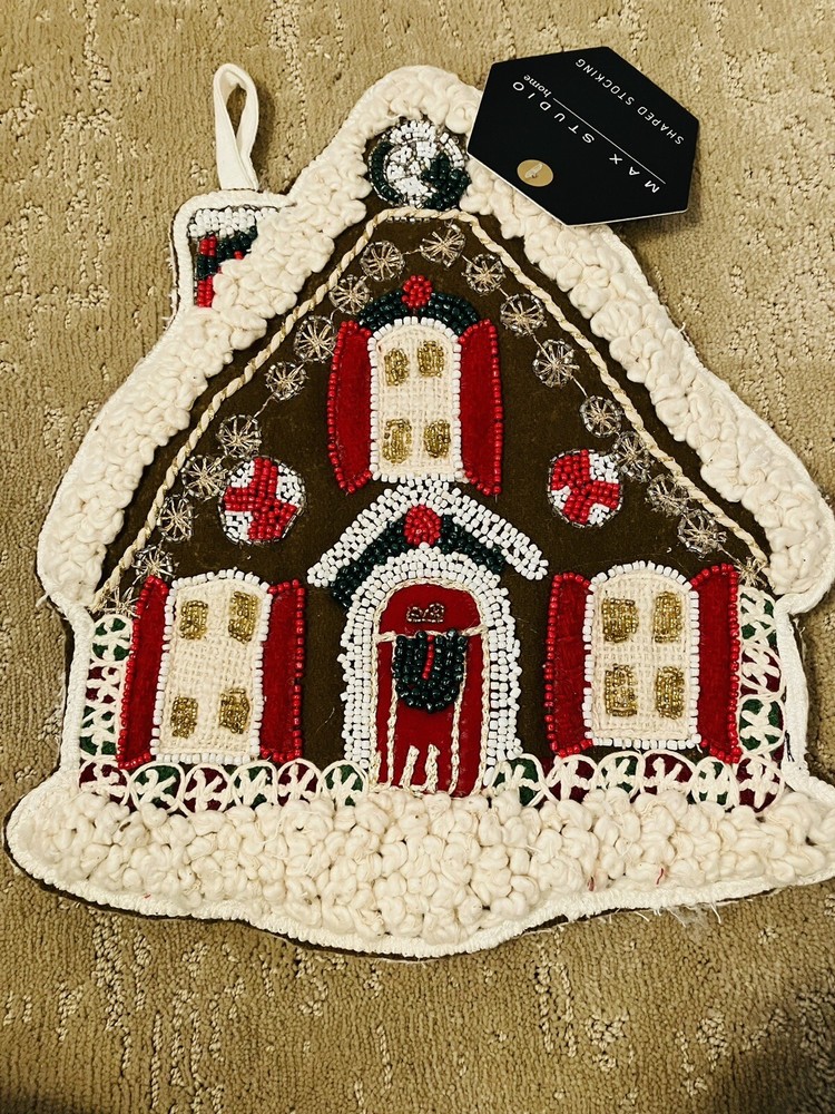 MAX STUDIO SHAPED CHRISTMAS STOCKING GINGERBREAD HOUSE BEADED WOOL BLEND 12 X 14 NWT...