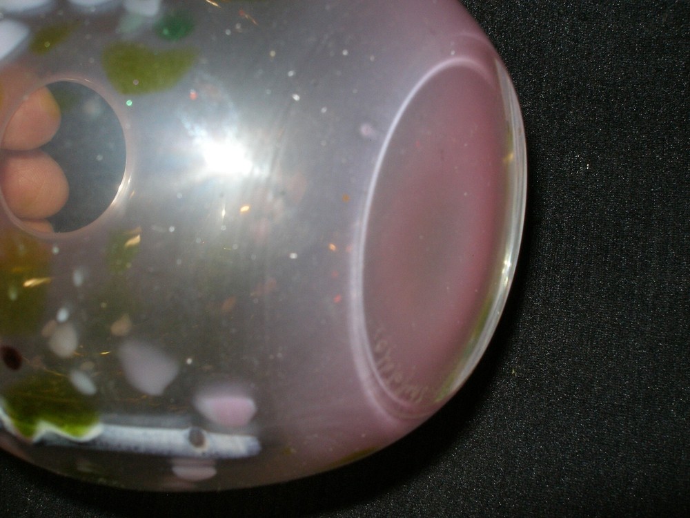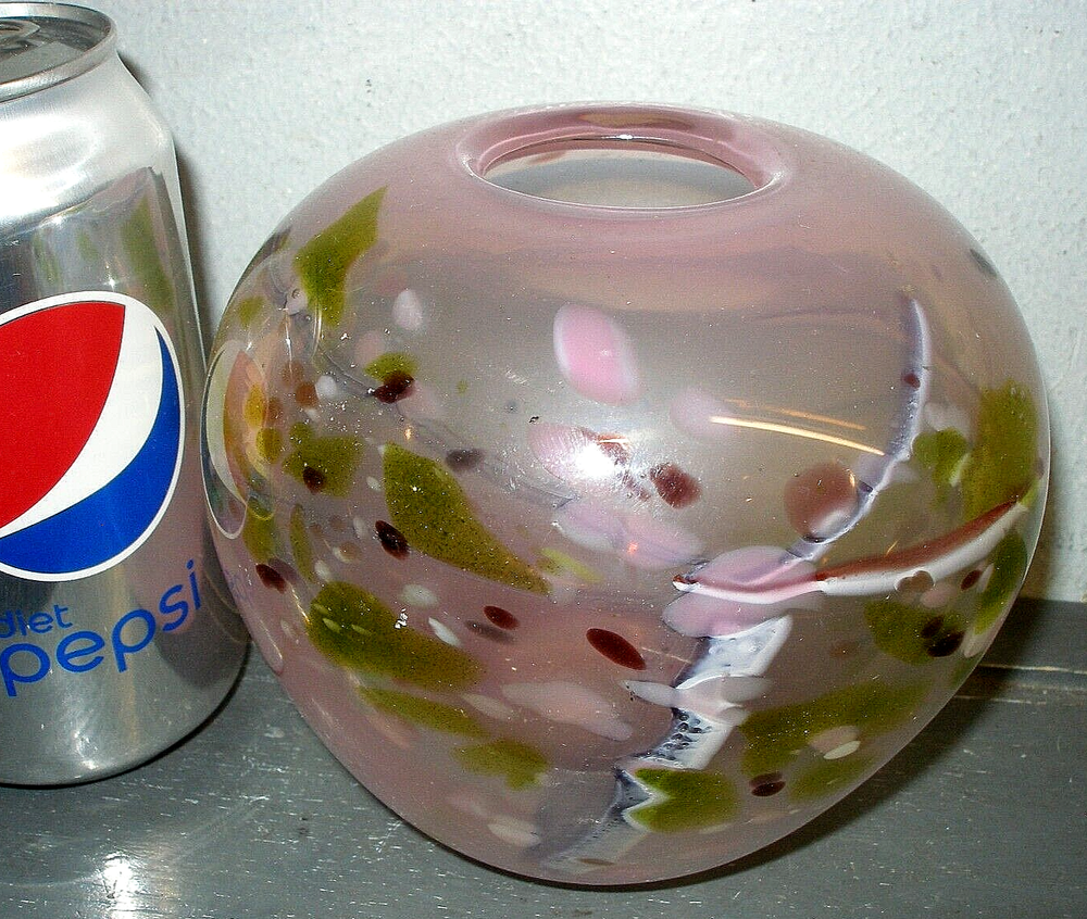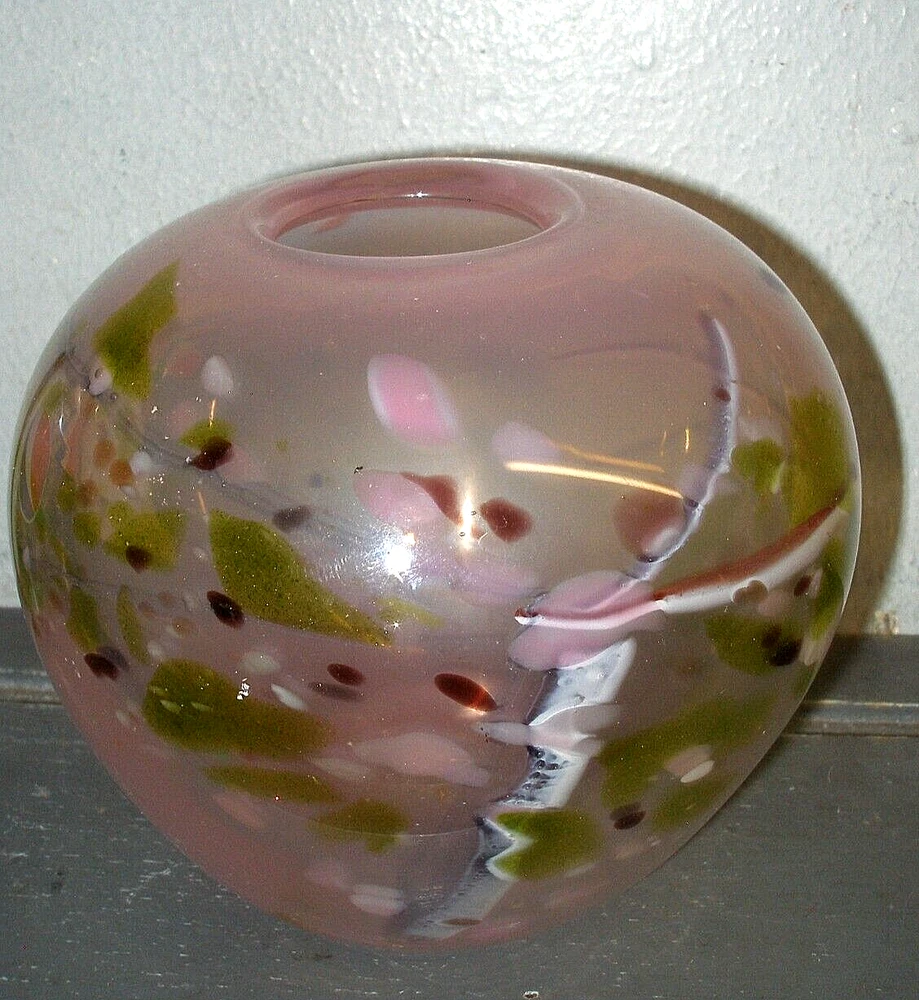 ESTATE FIND, A MID-CENTURY STUDIO BLOWN ART GLASS ROUND BALL VASE. BASE COLOR IS PINK WITH MULTI-COLOR INFUSIONS OF BLOTCHES OF COLOR, PONTIL BASE IS POLISHED FLAT.. 4.5" TALL X 5" WIDE. WEIGHS ALMOST 2 POUNDS. IT IS ARTIST SIGNED ,,,,,,,,,,,,,,APPEARS TO BE " SHAFFETALLOS" .....SEE PHOTO................PLEASE CORRECT ME IF I AM WRONG !!!!!!!!!!!!!!!! NO DAMAGE. STUNNING PIECE. BUYER PAYS SHIPPING