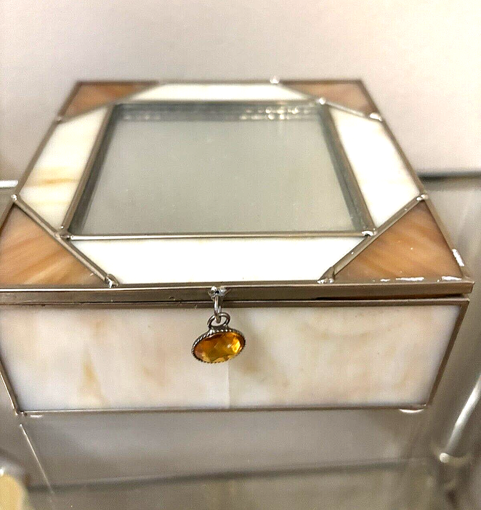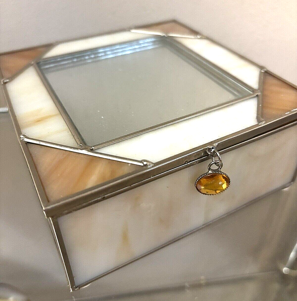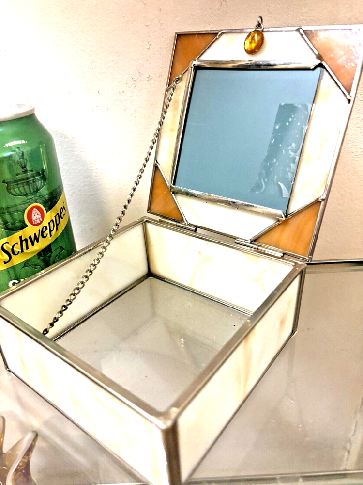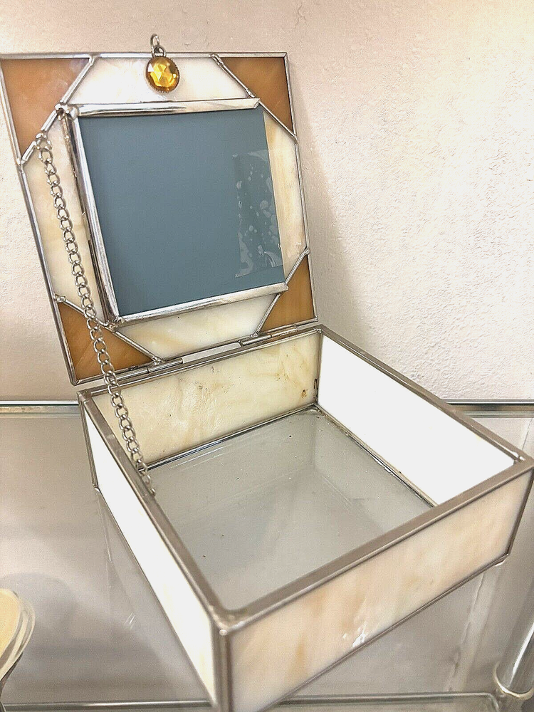 Discover a touch of mid-century charm with this MCM Leaded Stained Studio Art Glass Trinket Box, complete with a mirror on lid and a sophisticated chain lid catch. The square shape and 4.5-inch size make it a versatile piece for your vanity or desk, while the abstract art pattern and multicolor beige tone design add a pop of creativity to any space. Handcrafted with care in the United States during the 1970s, this original piece boasts a unique stained finish that enhances its handmade craftsmanship. This trinket box is not just a functional item but also a small piece of art, reflecting the abstract aesthetic of the era and the artisan's attention to detail. No damage. Buyer to pay shipping