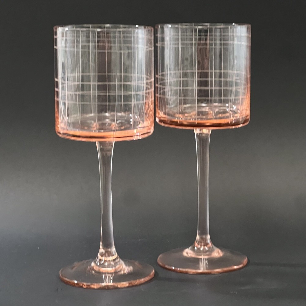 Set of 2 Studio Nova PARK AVENUE GRID PINK White Wine Glasses 7" HEIGHT Squarish Bowl ~ MCM Very Good Condition No Cracks or Chips or Hard Water Damage Hand Wash Only DISCONTINUED PATTERN