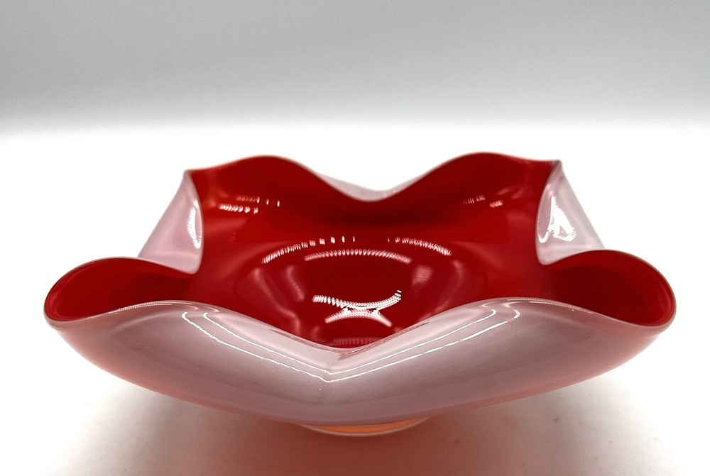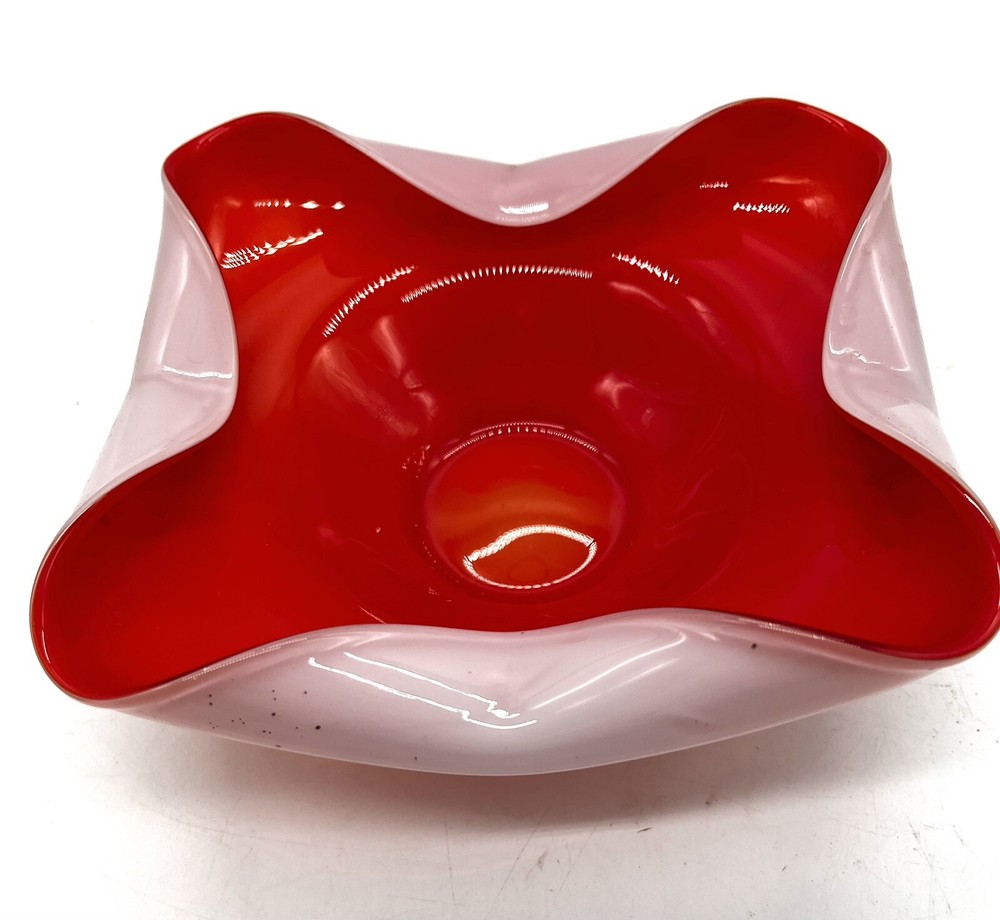 A bright, pretty hand blown art glass bowl. Red with hints of orange. It is square with rolled edges. 5.5” wide. No chips, cracks or repairs. A great piece to use for your holiday candy!!