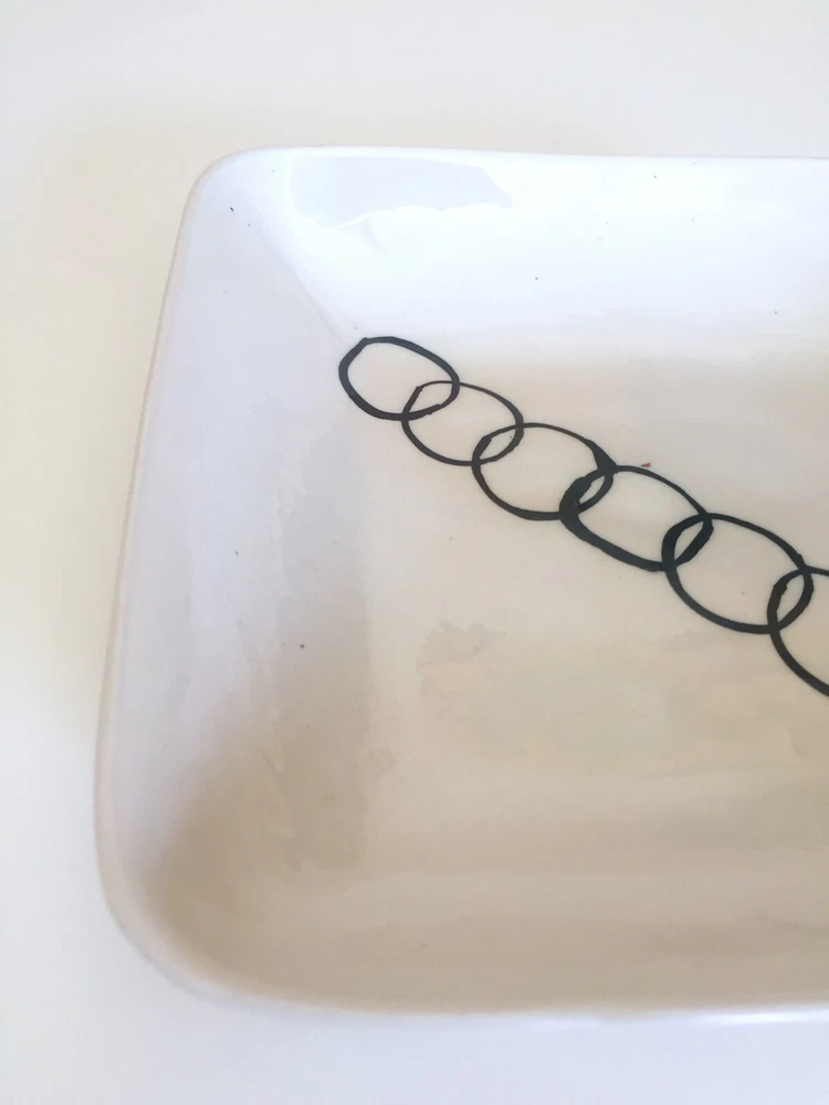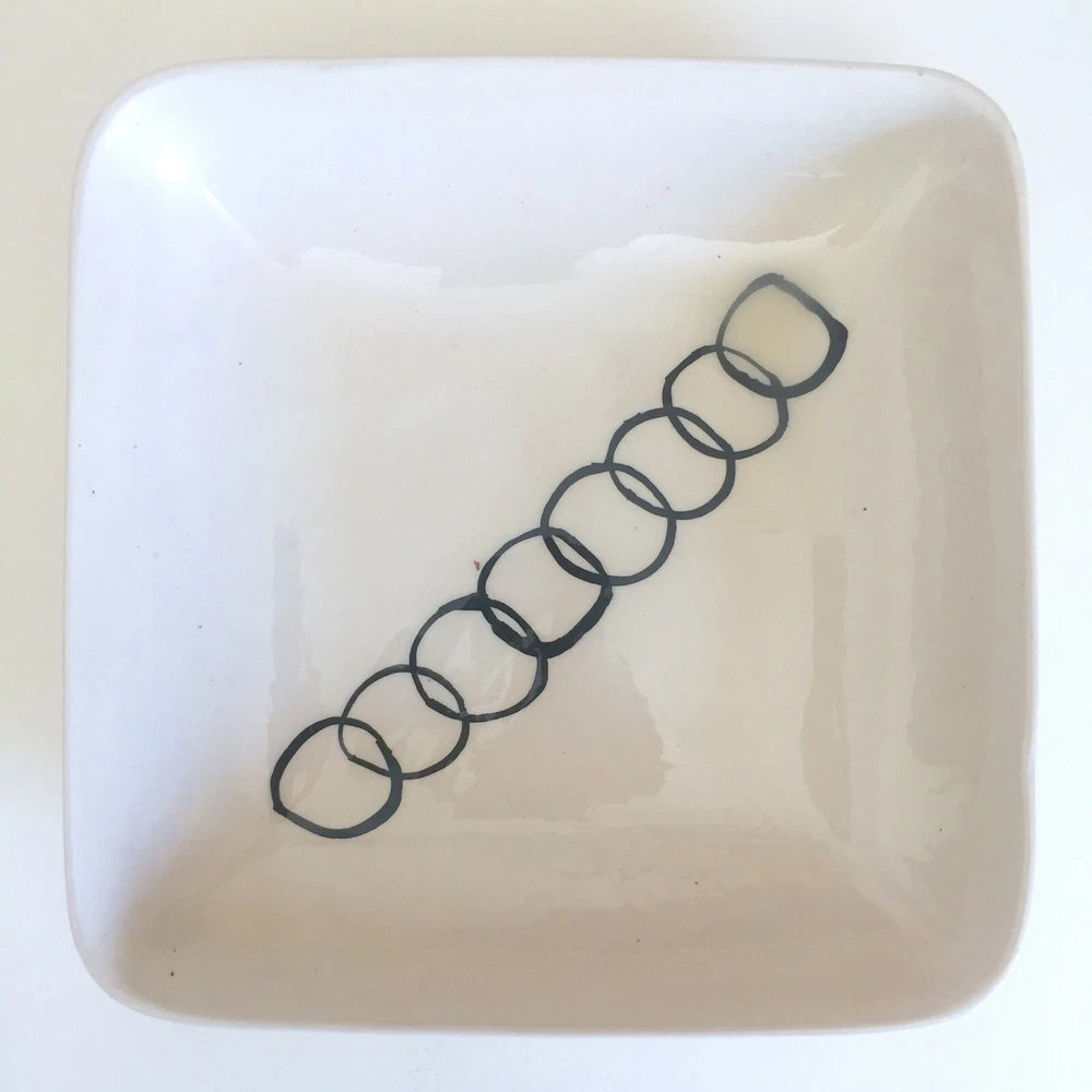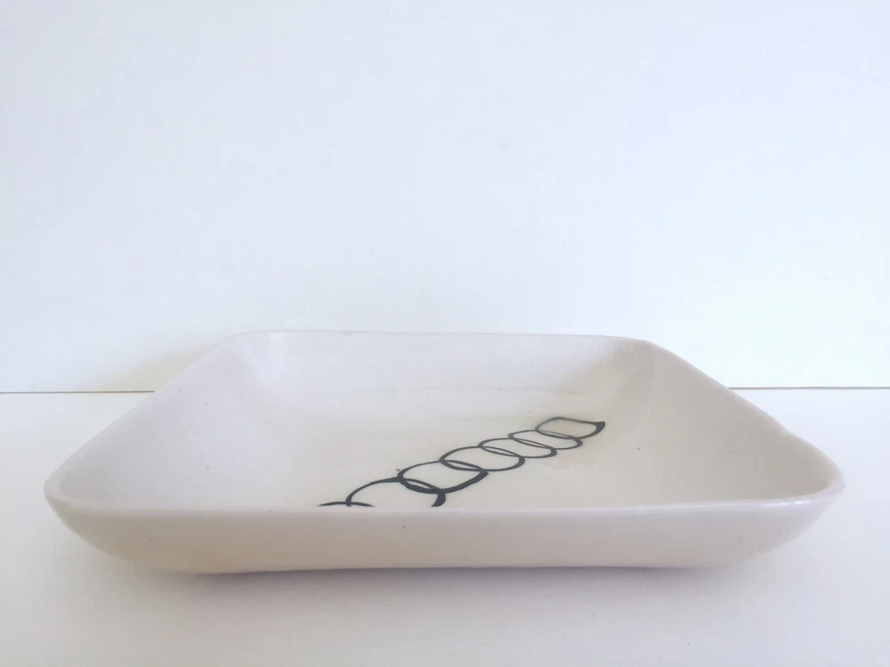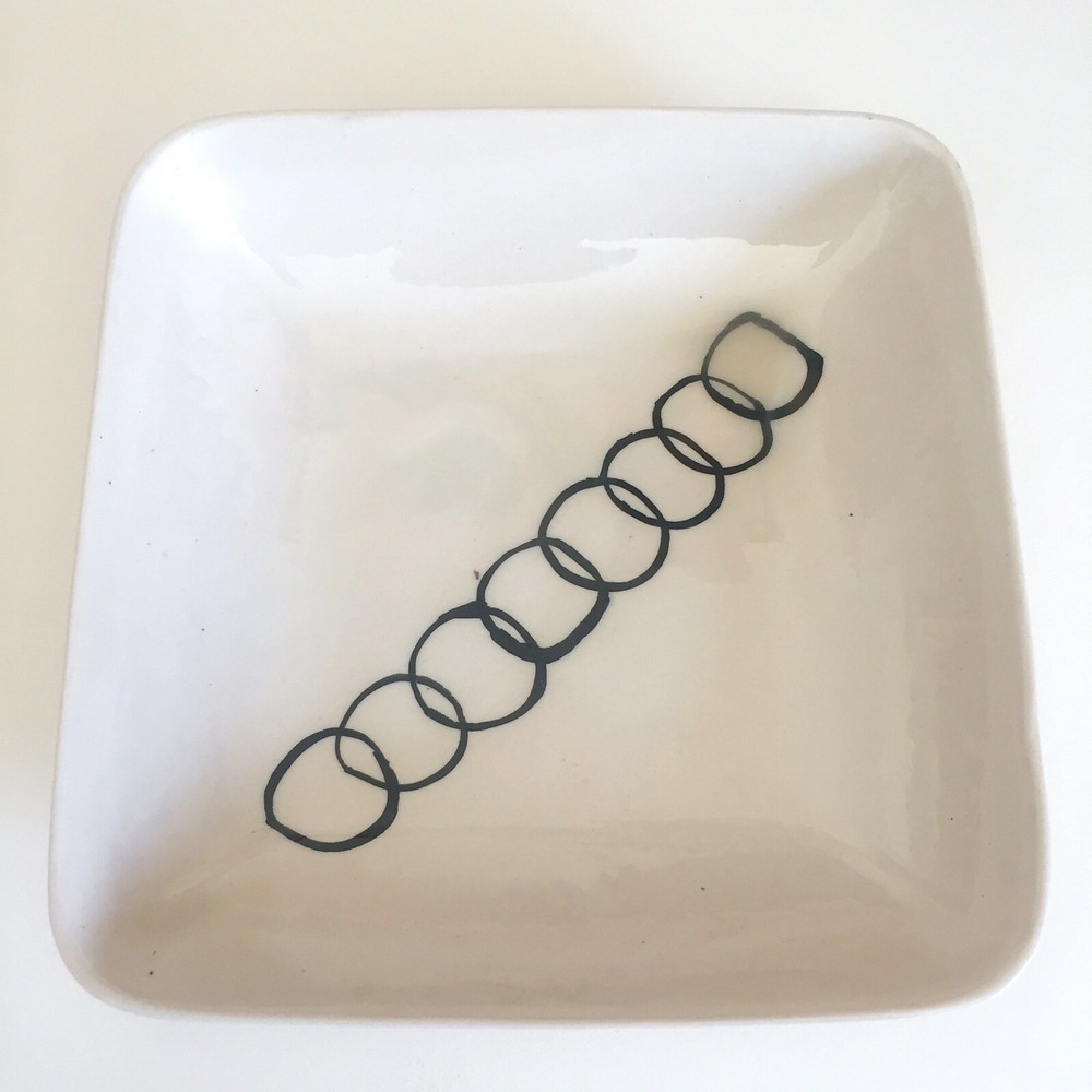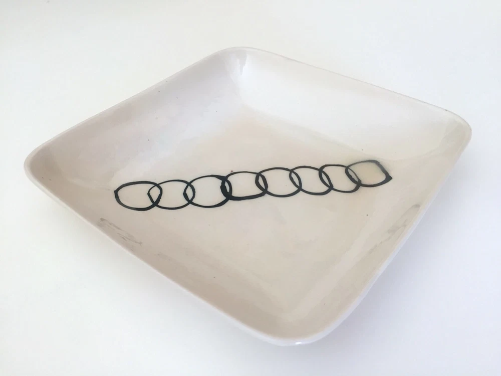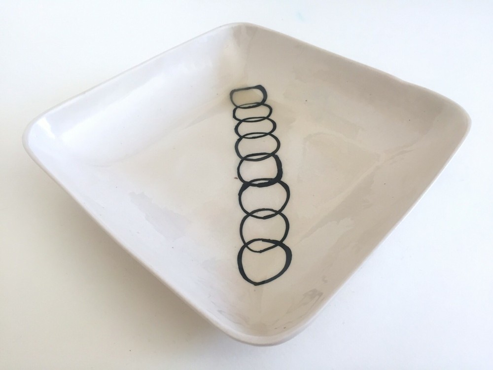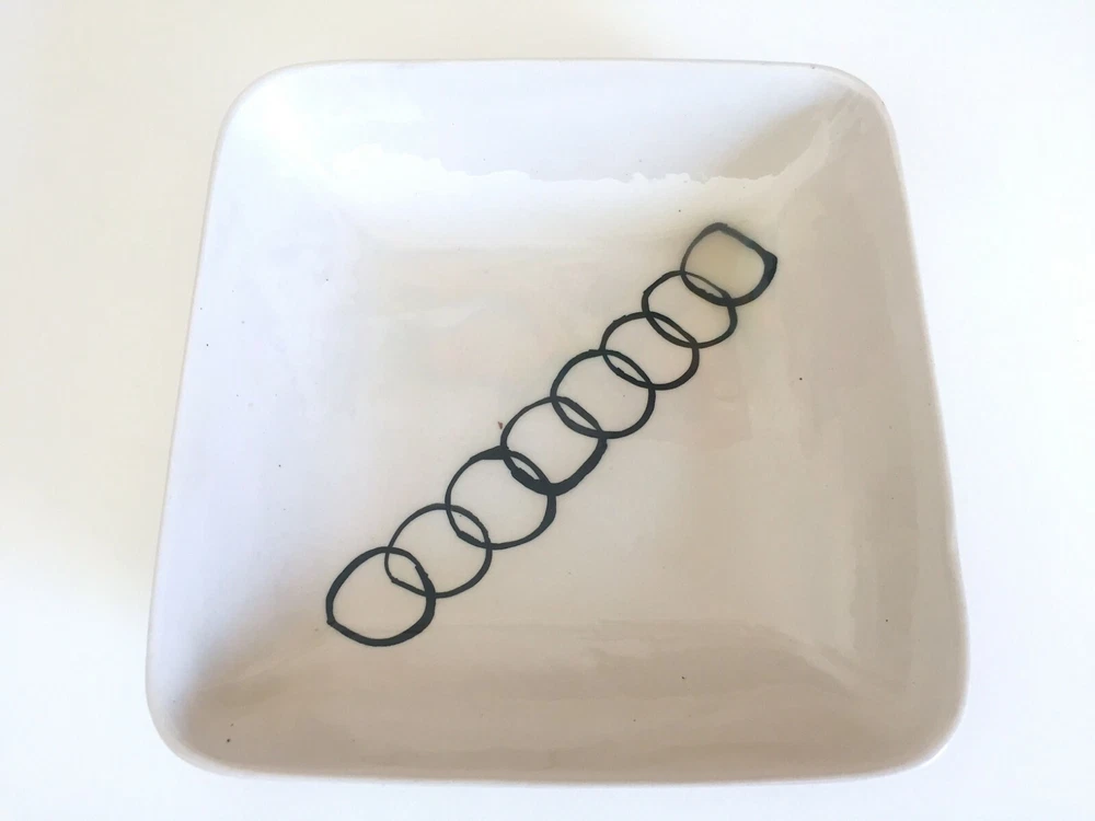 THIS VINTAGE MID CENTURY MODERN STUDIO POTTERY MINIMALIST SQUARE BLACK & WHITE SIGNED CERAMIC BOWL IS A VERY SPECIAL AND UNIQUE PIECE TO ADD TO YOUR COLLECTION. THE OFF WHITE IVORY COLOR SQUARE SHAPED LOW CERAMIC BOWL FEATURES BEAUTIFUL HAND PAINTED AND GLAZED CONCENTRIC LINKED BLACK CIRCLES DESIGN DETAILS IN THE BOWL CENTER. THE BOWL IS SINGED ON THE REVERSE UNDERSIDE BY THE STUDIO POTTER ARTISAN " PERTH ". THE MID CENTURY MODERN LOW SQUARE STUDIO POTTERY CERAMIC BOWL MEASURES 7 1/2" W X 7 1/2" H X 1 1/4" D. IT IS IN EXCELLENT VINTAGE CONDITION CONSISTENT WITH AGE, USE, AND LIGHT SIGNS OF HANDLING. PLEASE SEE PHOTOS FOR CONDITION REFERENCE. IT IS NOW BEING OFFERED HERE FOR AN EXCELLENT PRICE.
