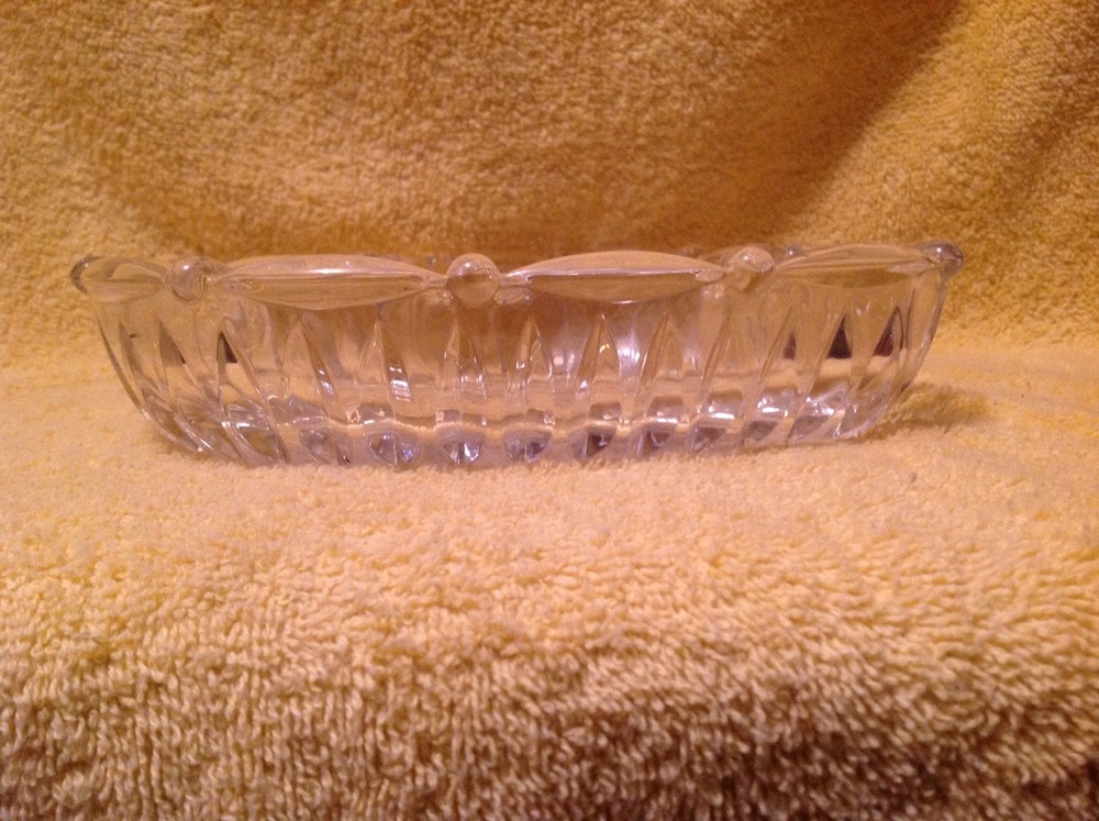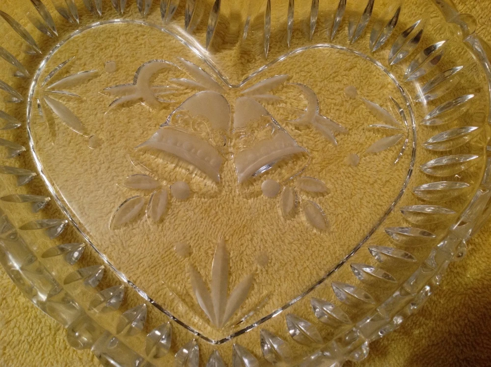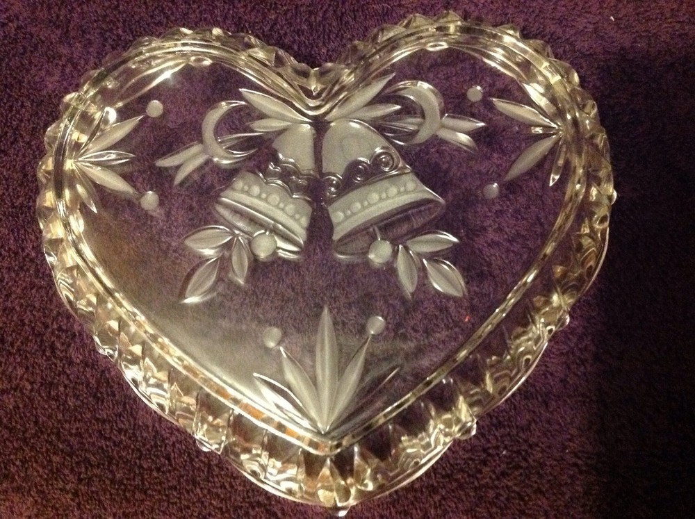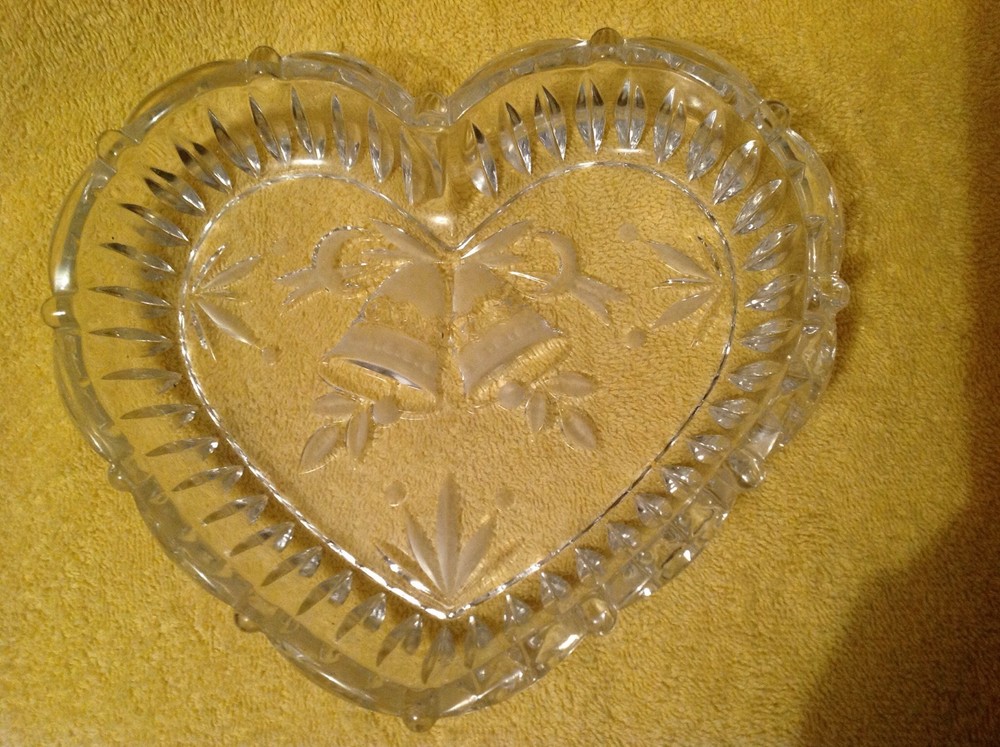 Mikasa Studio Nova heart-shaped clear crystal bowl. It has 2 bells etched with a ribbon, other decor & has ribbed sides. There are no chips, cracks or scratches noted. It looks to be unused. Very heavy. No box included. It measures 8-1/2" across. Please view all pictures provided & use the zoom in option as the pictures were taken in HD. Please feel free to ask any questions prior to bidding. Please pay promptly after sale, otherwise contact me & let me know if you need a few days before you pay. Good feedback is my goal! If you are unsatisfied with your item(s), please contact me first before leaving negative feedback. I will do my best to resolve the issue to satisfy my buyers! International customers are responsible for your countries duties, taxes, custom fees & any other fees their country charges for shipping & bringing it in to their country. These expenses are not included in the price of this item. I use global shipping only.