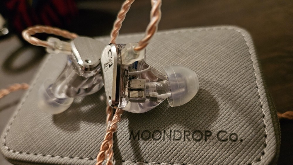 The MOONDROP x Crinacle Blessing 2: Dusk in-ear headphone bundle features a silver and clear color design with a double earpiece configuration. Suitable for studio monitoring, DJ, and live monitoring, it offers noise isolation and a detachable cable. The unit includes 1 dynamic driver and 4 balanced armatures for high-quality sound. It has a 3.5mm jack connectivity and is designed in China.