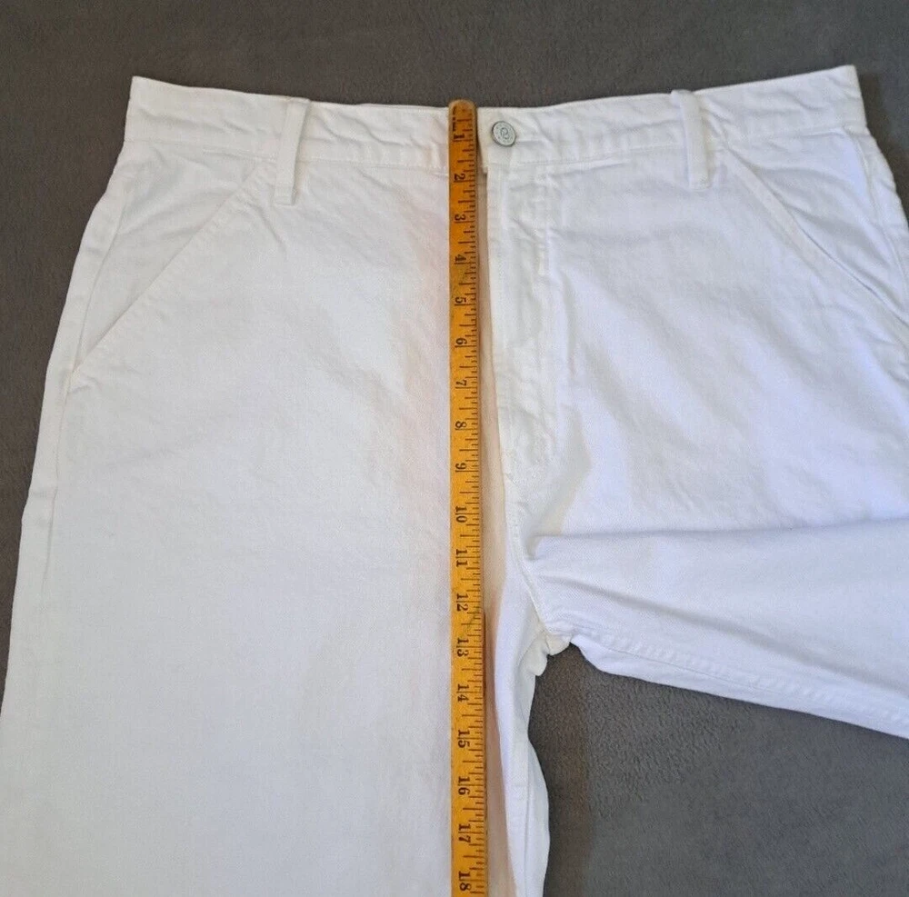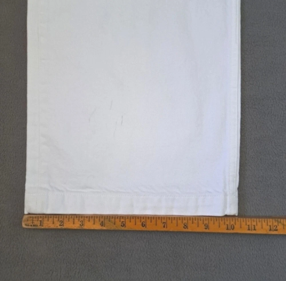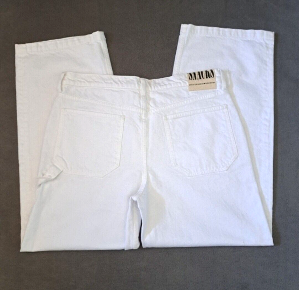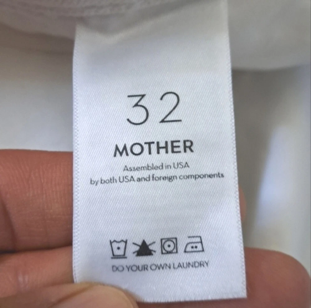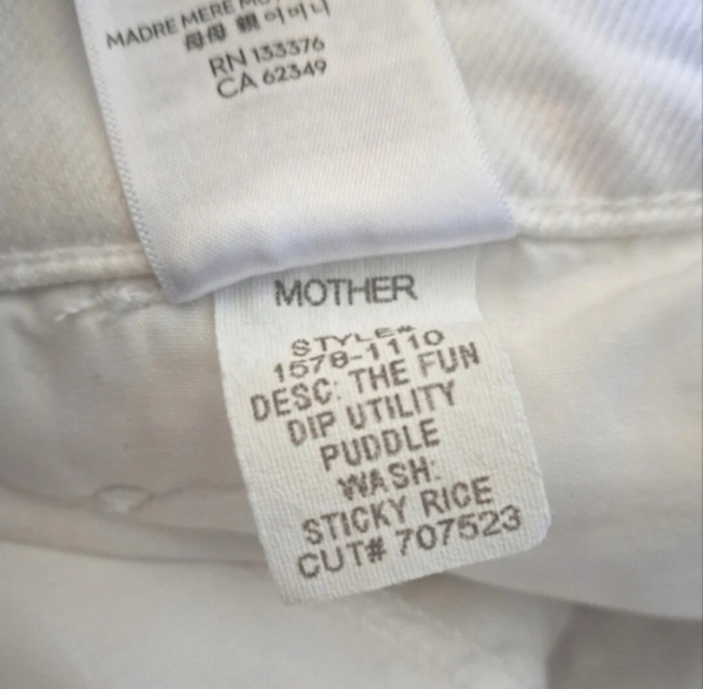 size fits 34 *tagged 32, but measures bigger Please see measurements Pants measure 36" laying flat Size chart added for reference Snacks from Mother Fun dip utility puddle sticky rice wash wide leg style 100% cotton denim USA made beautiful jeans in excellent condition smoke free home