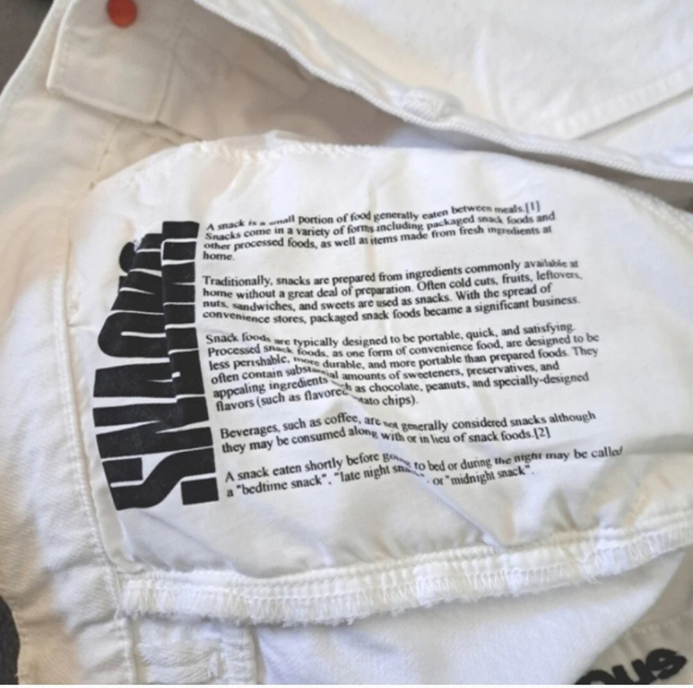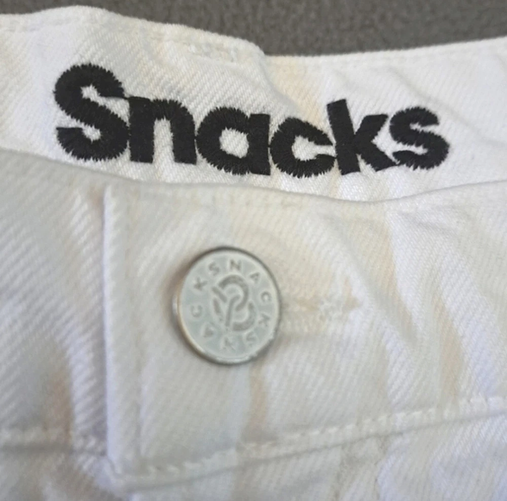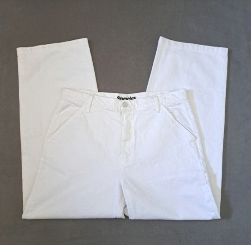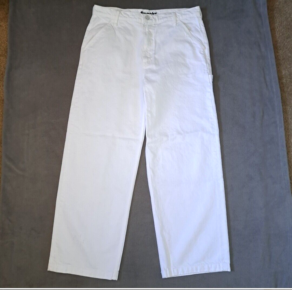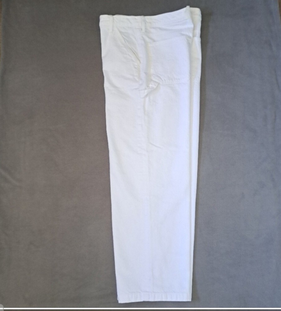 size fits 34 *tagged 32, but measures bigger Please see measurements Pants measure 36" laying flat Size chart added for reference Snacks from Mother Fun dip utility puddle sticky rice wash wide leg style 100% cotton denim USA made beautiful jeans in excellent condition smoke free home