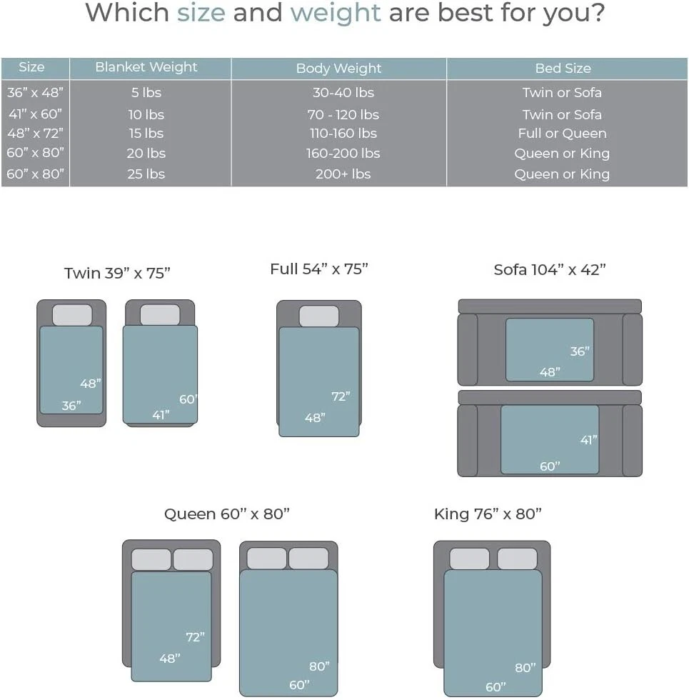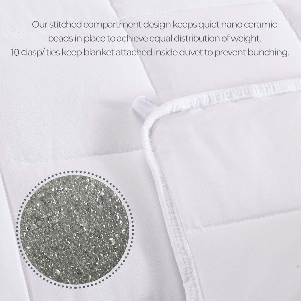 Microfiber and Fleece THE BEST WEIGHTED BLANKET - Occupational Therapists discovered the unique calming abilities of DPS (Deep Pressure Stimulation). A heavy blanket filling with nano-ceramic beads, Ideal for people who suffer from sensory issues and lack of deep sleep : adults and kids, or husband and wives with restless spouses. NANO-CERAMIC BEAD TECHNOLOGY - Created using a special forging method, the nano-ceramic beads are not only more durable than plastic beads but are more comfortable than glass variety. They're finer and denser, the same weight is achieved with fewer beads. They seamlessly blend together, the positioned weighted pockets evenly distribute pressure over your entire body. 10 internal clasps also make sure weight is even all throughout the blanket. You won't have to worry about them shifting around. WARM AND COOL FABRIC COVER - Comes with one reversible duvet cover: One side is made from fleece flannel fabric which soft and makes you warm; reverse side is coolmax material, great for summer sweaty nights. Breathable, comfortable and skin-friendly fabric, you can use it year-round. HOW TO CHOOSE SIZE AND WEIGHT - This heavy blanket is 60" x 80" which suitable for a queen or king size bed, 20lbs is suitable for 190 - 220lbs person. The weighted blanket dimension is smaller than the same size regular blanket, because the blanket should lay on top of the bed without hanging over the sides. Otherwise, the weight would tend to pull the blanket over the edge as you shifted during the night.
