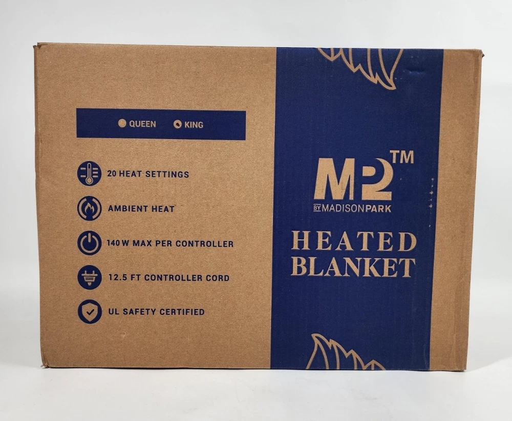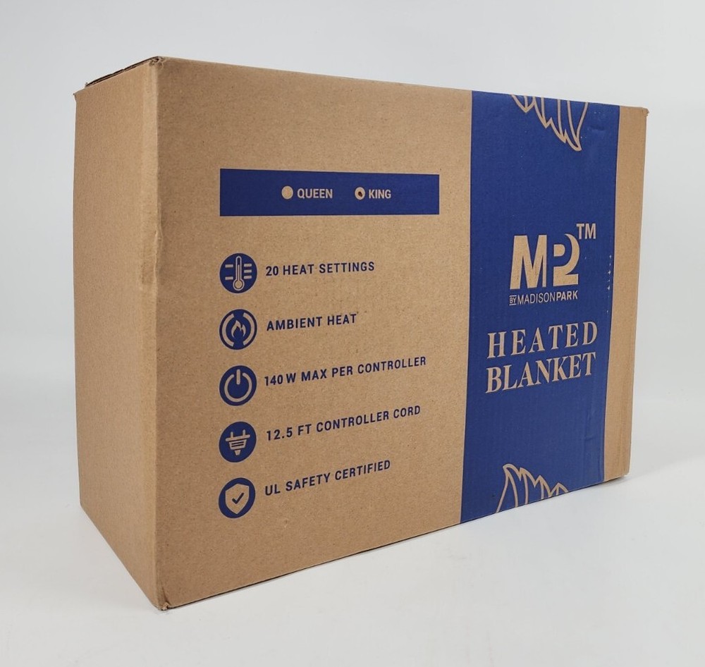 M2 Madison Park King Size Electric Heated Blanket with Dual Control. Condition is New. Box has some wear. Excluded Shipping Locations: Alaska, Hawaii, Puerto Rico, US Protectorates, APO/FPO, P.O Box.