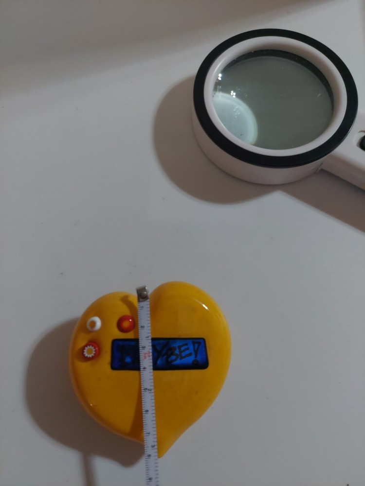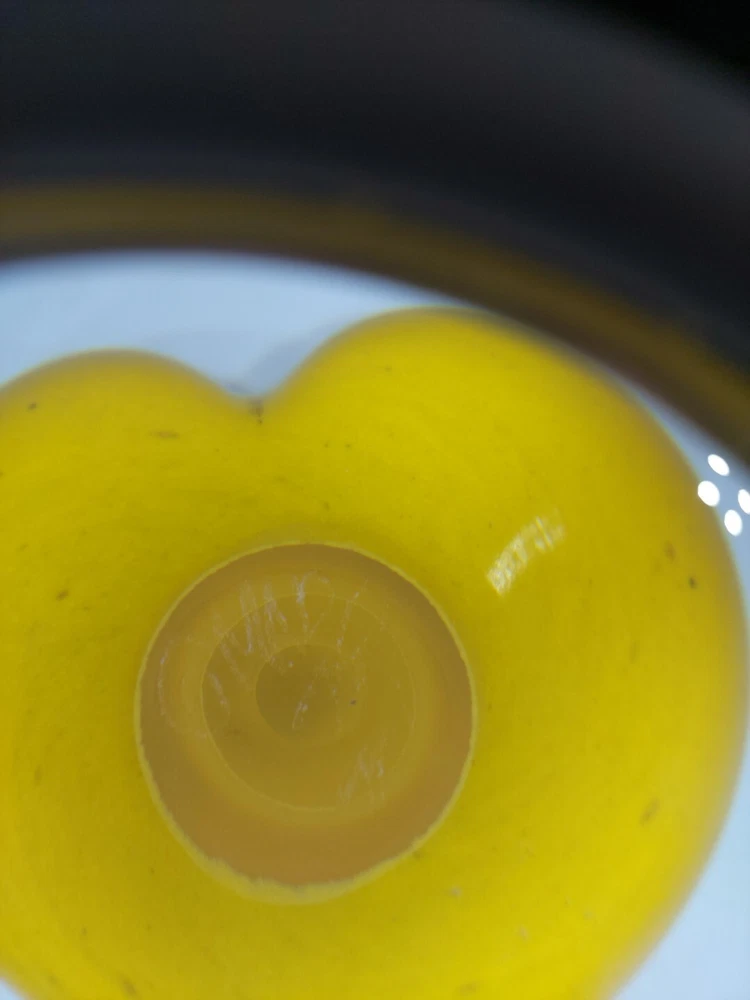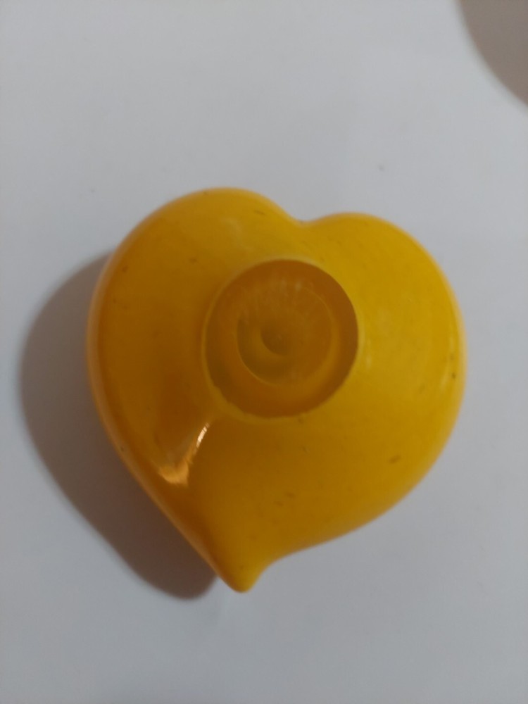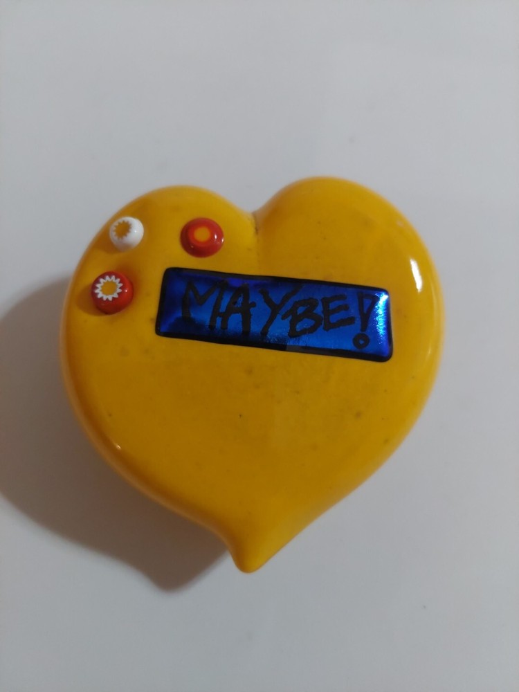 This unique and beautiful paperweight from Mad Art Studio is sure to impress any collector. The heart shape and vibrant yellow color make it a standout piece. Crafted from high-quality glass, this handmade item has been created with the utmost care and attention to detail. The production style is art glass, adding to its value and uniqueness. The paperweight features the word "MAYBE" in black, adding a touch of whimsy and intrigue. Perfect for display or use, this Mad Art Glass paperweight is a must-have for any art glass lover. Last photo is signature