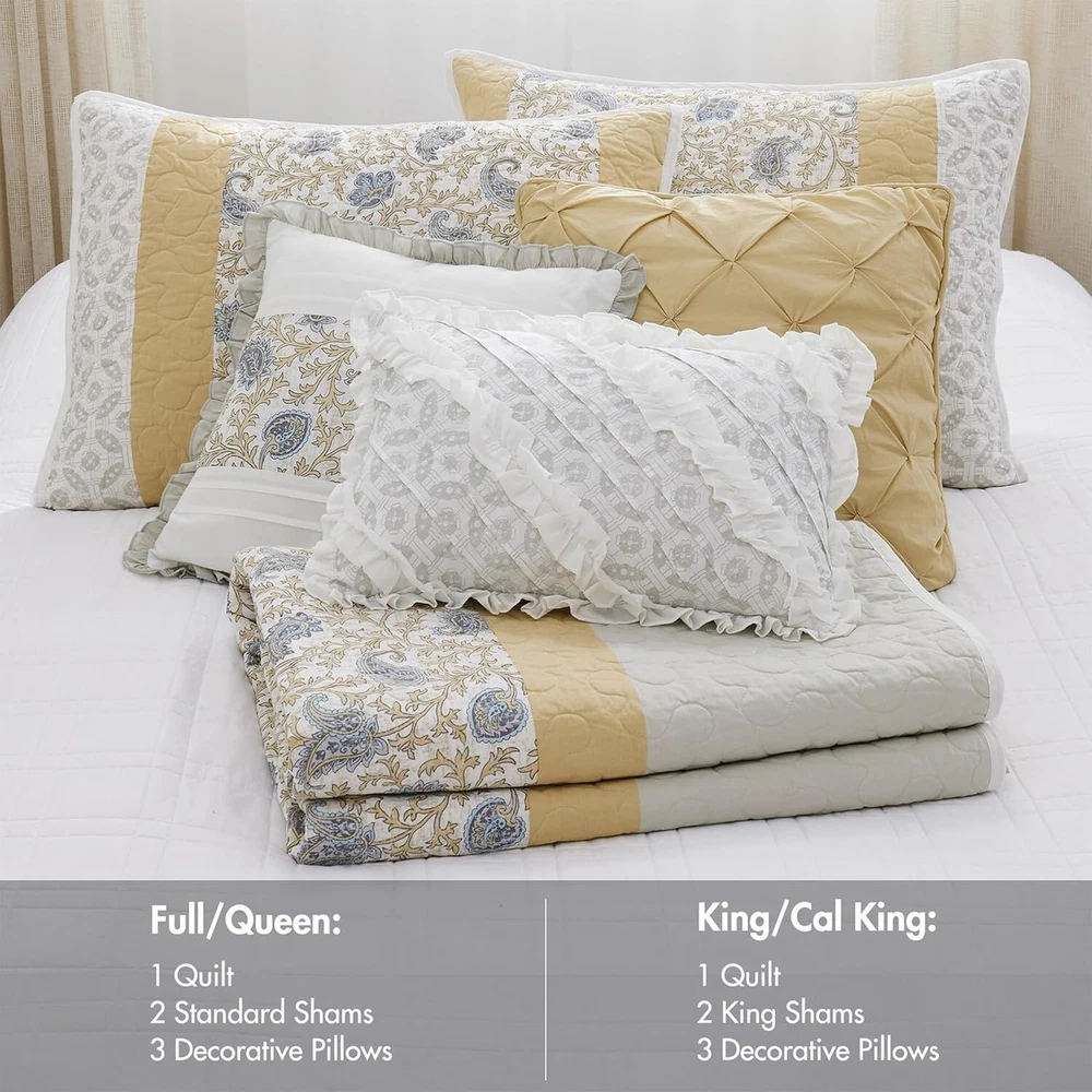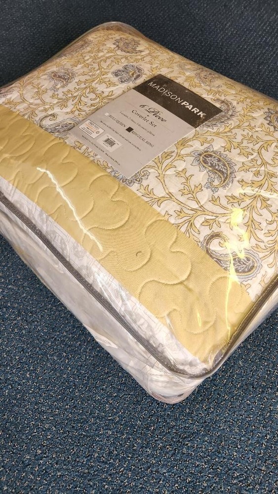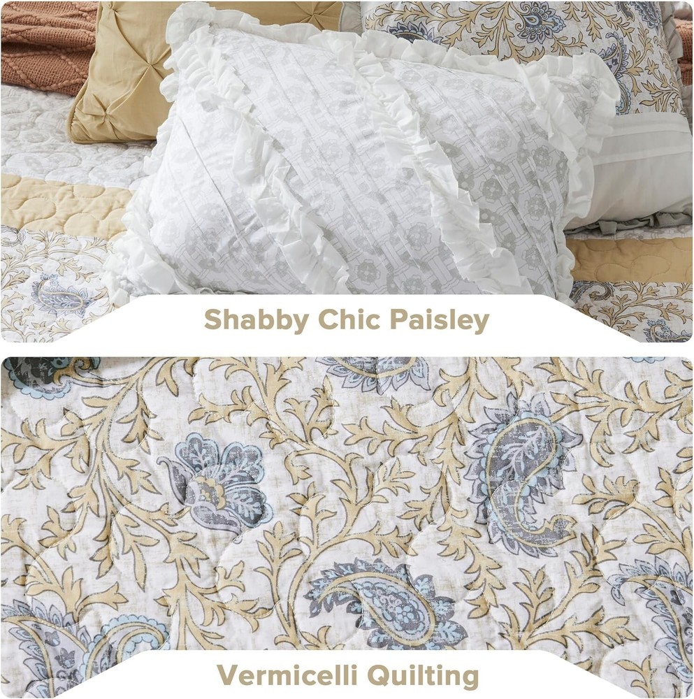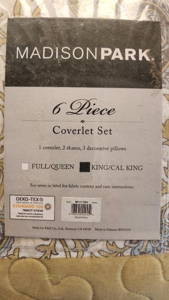 Cover: 100% Cotton Filling: 90% Cotton &10% Other Fiber Imported Dawn 6 Piece Cotton Percale Reversible Coverlet Set offers a shabby chic update to your bedroom decor. A paisley print is featured on the cotton coverlet with pintucked fabric separated by lace taping embellishments. OEKO-TEX Standard 100 ( 7995CIT), certified to be free of any chemicals and harmful substance giving you a peace of mind for better sleep and comfort Set includes: 1 Coverlet: 104"W x 94"L, 2 King shams: 20"W x 36""L, 3 Decorative pillows: 16"W x 16"L & 12"W x 18"L & 18"W x 18"L Care instructions: Machine wash cold, gentle cycle, and separately. Do not bleach. Tumble dry low, remove promptly. Do not iron. Spot clean pillows. If there is no free movement in the washer or dryer, use large capacity commercial washer & dryer. This was a return. Machine wash Retail 129.00 free shipping