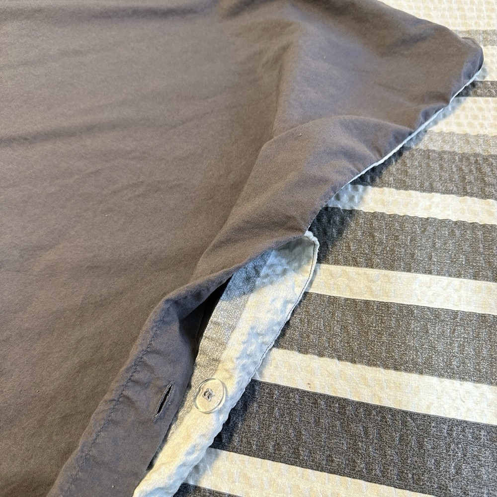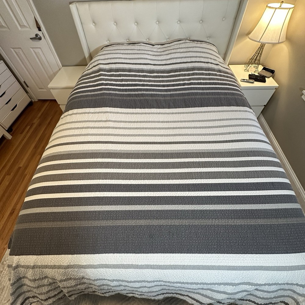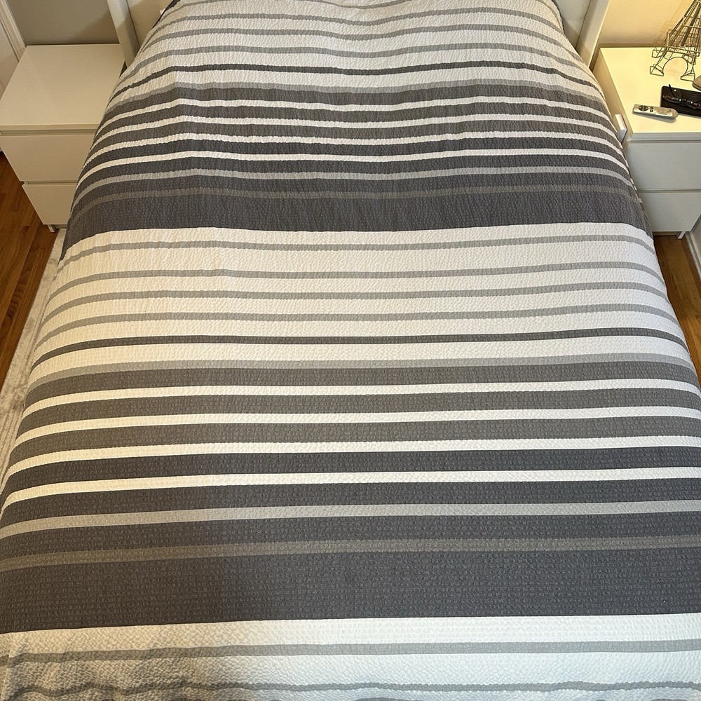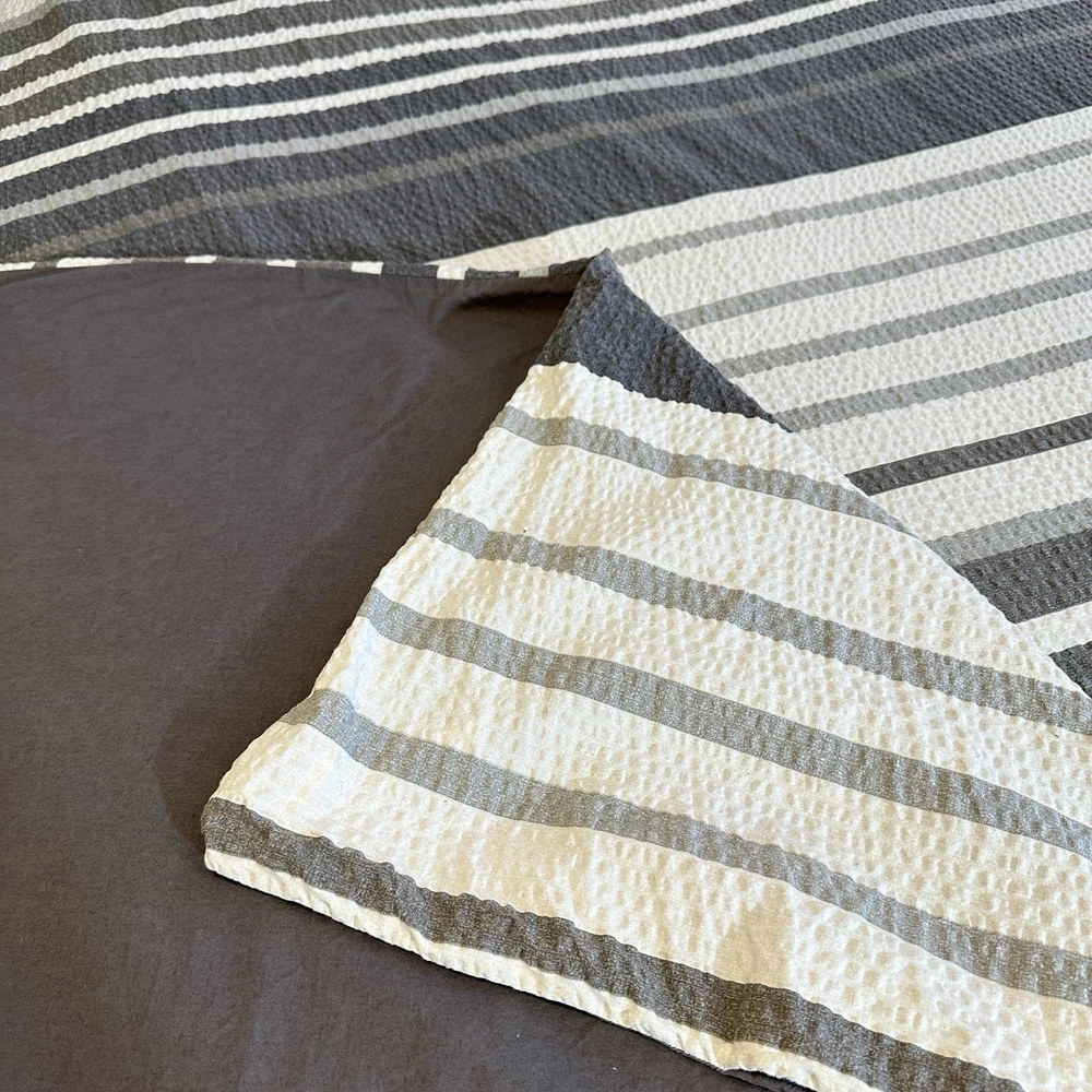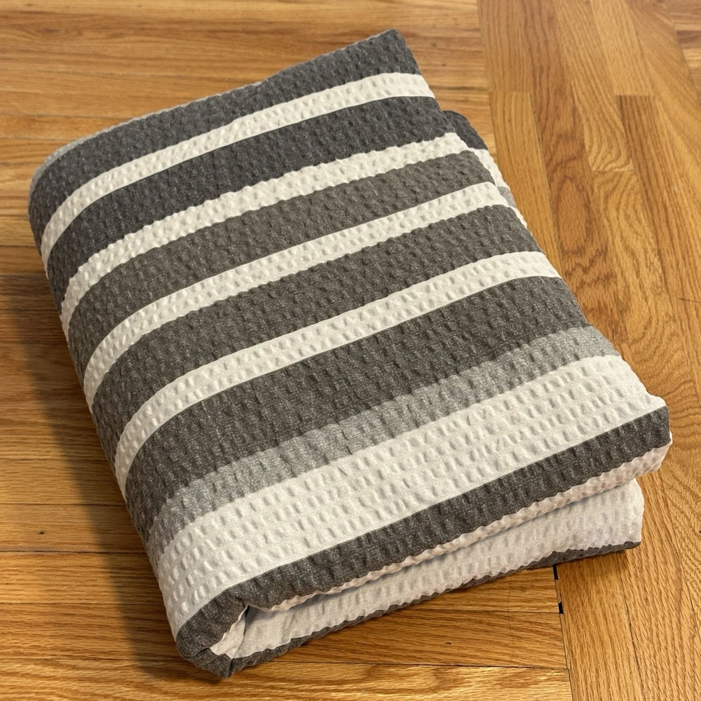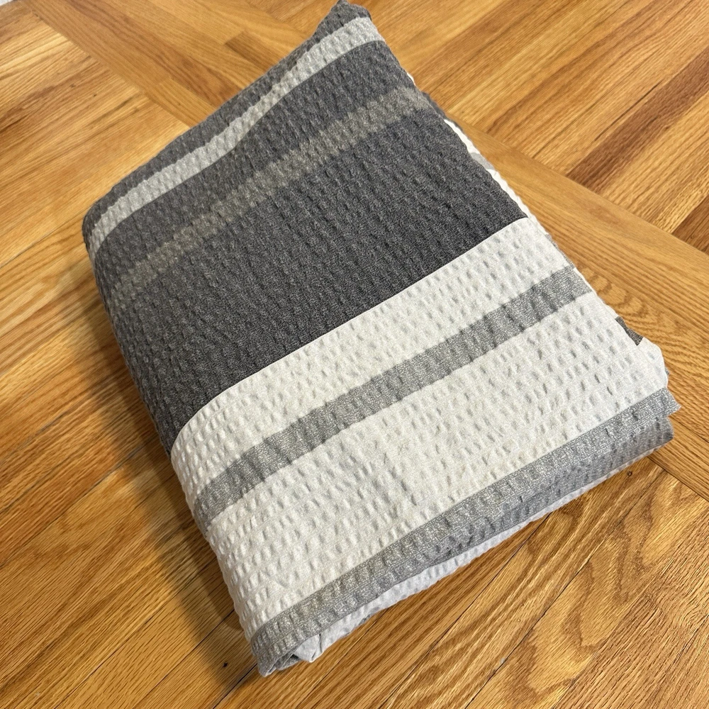 Madison Park 100% Cotton Seersucker Gray Stripes Duvet Cover Size King 100"x92" Madison Park 100% Cotton Seersucker Gray Stripes Duvet Cover is in Excellent preowned condition. It has been very gently used with NO stains, tears or flaws. Please view all photos to verify the condition. Features: Coastal, Cottage, Comfort, Nautical Dimensions Length - 92" Width - 100"