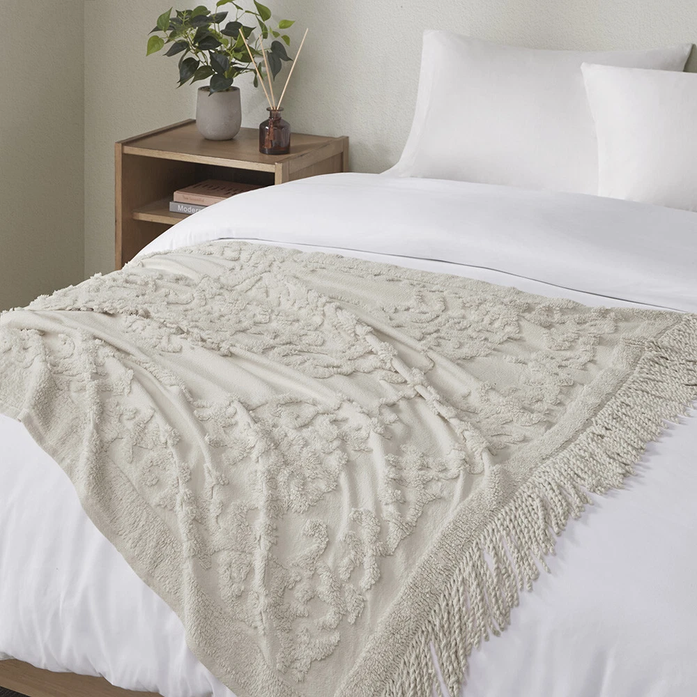 DESCRIPTION The Madison Park Chloe Cotton Tufted Throw provides a luxurious addition to your home decor. This grey throw flaunts an elegant tufted chenille design with a 4-inch fringe on each end, for a beautiful bohemian look. The ultra-soft 100% cotton construction creates a light natural feel that’s perfect for all seasons. Machine washable, this cotton tufted throw is great for layering across your bed or for simply bundling up in to stay warm and cozy. FEATURES • 100% cotton tufted chenille throw, lightweight and breathable • 4-inch fringe on each end, adding texture and dimension • Perfect luxe cottage room decor and summer blanket • 1 throw: 50"W x 60"L + 4" x 2" • Oeko-Tex Certified, includes no harmful substances or chemicals • Machine washable for easy care • Due to the nature of the chenille fabric, some shedding will occur naturally in the first 3-4 washes MATERIAL 100% Cotton Available Size: 50x60" Throw: 50"W x 60"L + 4" x 2"