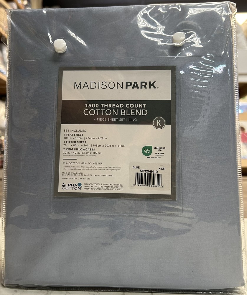 Indulge in the luxurious feel of the Madison Park 1500 Thread Count Cotton 4 PC Sheet Set, designed to bring comfort and style to your bedroom. Crafted from a premium cotton blend, this king-size sheet set boasts a solid color pattern that complements any decor. The set includes a fitted sheet, flat sheet, and two pillowcases, all fashioned in a modern, rectangular shape that fits seamlessly on your bed. Beyond its elegant appearance, the sheet set is engineered for durability and ease of care. It is hypoallergenic, machine washable, and adheres to the STANDARD 100 by OEKO-TEX, ensuring that it meets rigorous quality and safety standards. Whether you're outfitting a teenager's room or enhancing a luxurious master suite, this versatile blue sheet set, made in India, provides an all-season theme that's perfect for everyone.