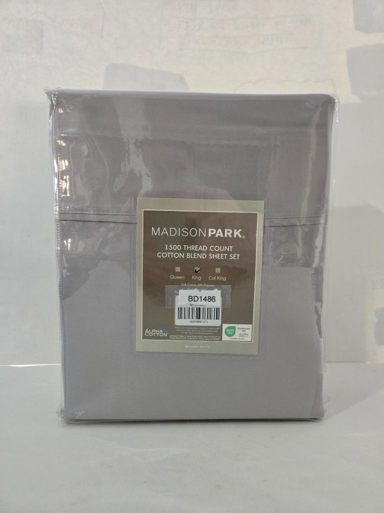 Madison Park 1500 Thread Count Gray King Sheet Set Indulge in the ultimate luxury of Madison Park 1500 Thread Count Cotton Rich sheet set. Cotton Rich fabric reduces shrinkage and is wrinkle resistant. The fine yarns create a lighter, softer, smoother feel for sleeping comfort. Brand: Madison Park Size: King Set includes: Flat Sheet: 108" W x 102" L; Fitted Sheet: 20" W x 40" L(2); 2 Pillowcases: 78" W x 80" L + 16" D Material: 52% Cotton, 48% Polyester Color: Gray Machine washable 51% Cotton / 49% Polyester 1500 thread count Stunning designs and attractive looks Care Instructions Machine washable Madison Park 1500 Thread Count Gray King Sheet Set Click images to enlarge Description Madison Park 1500 Thread Count Gray King Sheet Set Indulge in the ultimate luxury of Madison Park 1500 Thread Count Cotton Rich sheet set. Cotton Rich fabric reduces shrinkage and is wrinkle resistant. The fine yarns create a lighter, softer, smoother feel for sleeping comfort. Brand: Madison Park Size: King Set includes: Flat Sheet: 108" W x 102" L; Fitted Sheet: 20" W x 40" L(2); 2 Pillowcases: 78" W x 80" L + 16" D Material: 52% Cotton, 48% Polyester Color: Gray Machine washable 51% Cotton / 49% Polyester 1500 thread count Stunning designs and attractive looks Care Instructions Machine washable Combined Shipping We charge full shipping & handling on the item with the highest shipping rate. Each additional items shipping & handling rate will be discounted 50% off. Please insert all items in the cart to show all applicable discounts. Items must be paid together to receive full discount Images sell! Get Supersized Images & Free Image Hosting Create your brand with Auctiva's Customizable Templates. Attention Sellers - Get Templates Image Hosting, Scheduling at Auctiva.com.