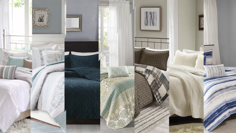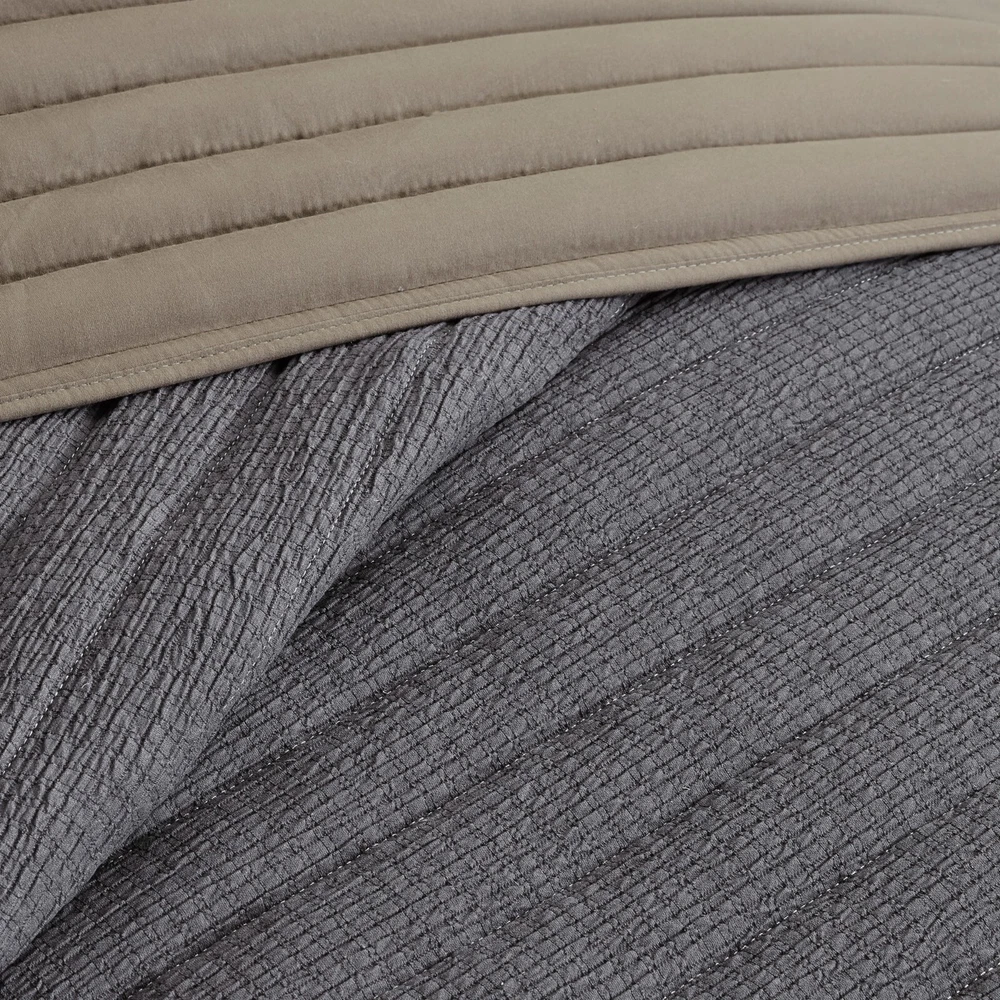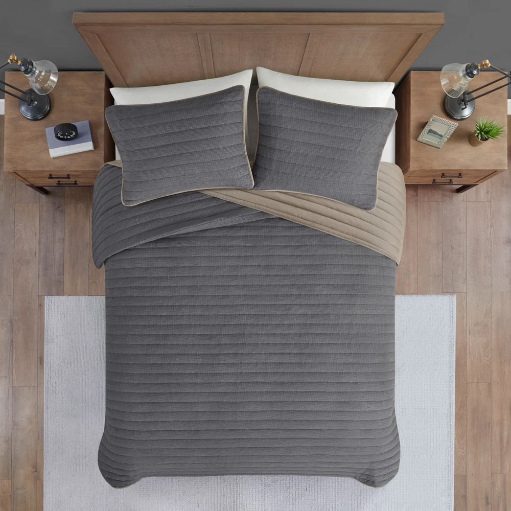 Madison Park 3 Piece Crinkled Microfiber Quilt Set Full Queen King Size DESCRIPTION Introduce a casual comfort and easily coordinating style to your bedroom with this reversible quilt set. A crinkled fabric design, in a navy color, creates texture and dimension to give this farmhouse quilt set a casual look and relaxing vibe. The solid brown reverse features channel stitching to complement the quilt’s color and style, making it easy to pair either side with your bedroom decor. With 2 matching shams included, this reversible quilt set is perfect by itself or as a layering piece for added style and warmth on those colder nights. FEATURES • Unisex casual style 3 piece quilt set in textured fabric • Crinkled fabric desing on top in navy color for a relaxed look and feel • Soft microfiber on the reverse in a solid brown color with channel stitching • Set includes 1 quilt and 2 matching shams • Machine washable and steam iron for wrinkle removal • Items in this set may come in rolled or compressed packaging and will need to be fluffed up MATERIAL Quilt/Sham: 100% Polyester face, 100% Polyester Microfiber reverse Filling: 100% Polyester Available Sizes: Full/Queen Quilt Set includes: 1 Quilt Set: 90"W x 90"L 2 Standard Shams: 20"W x 26"L King/California King Quilt Set includes: 1 Quilt Set: 104"W x 94"L 2 King Shams: 20"W x 36"L