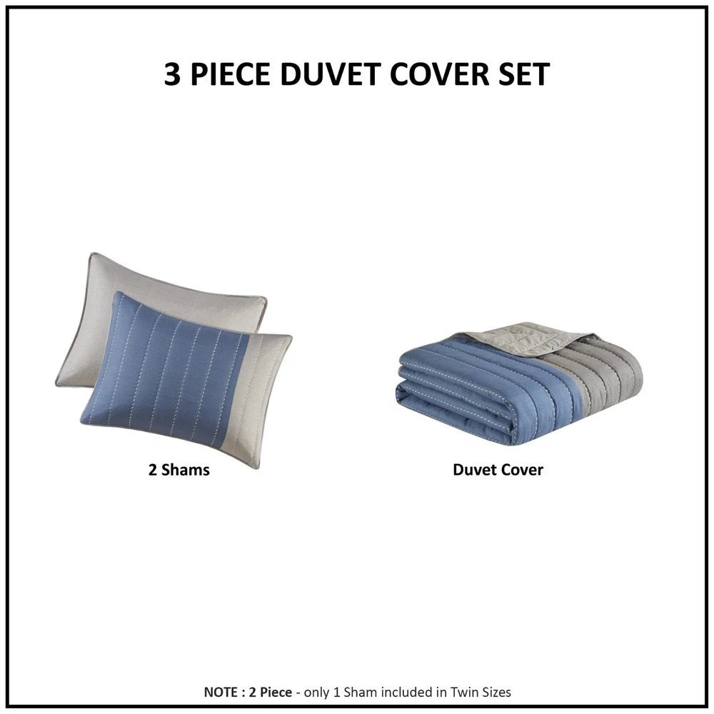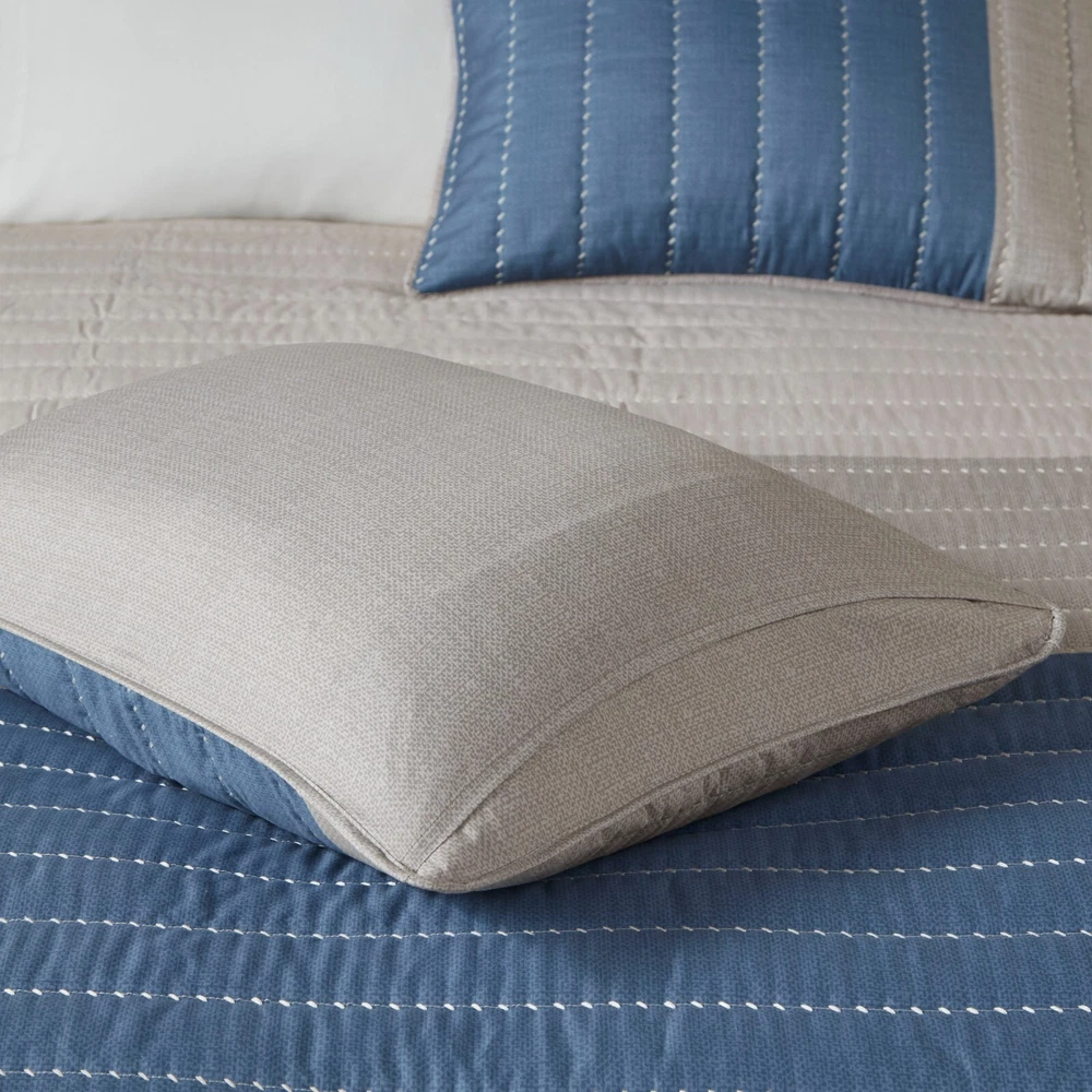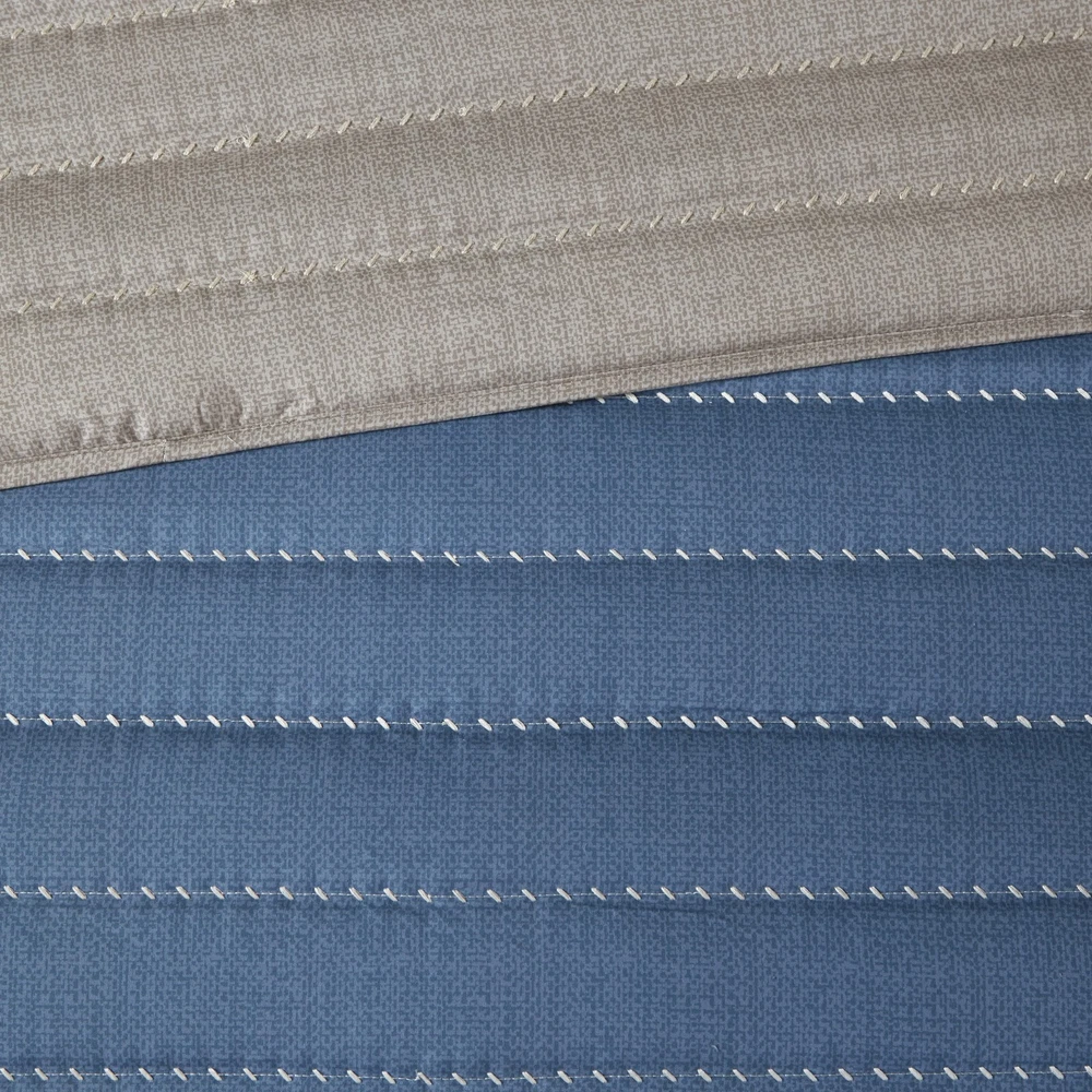 Madison Park 3 Piece Printed Color Blocking Soft Microfiber Quilt Set Queen King DESCRIPTION Bring a cozy casual vibe to your bedroom with the Madison Park Blake quilted quilt set. A color block design in soft neutral and blue colors are printed on the face of the quilt and complemented by a solid taupe reverse, for a farmhouse look. The channel quilting adds texture and the polyester filling provides plenty of warmth, making it great for single use in the summer or as an extra layer in the winter. FEATURES • Soft microfiber printed 3 piece quilt set for the cozy and casual bedrtoom • Color blocking design on top in soft taupe and blue colors with a solid deep taupe color on the reverse side • Soft microfiber with channel quilting in polyester filling, perfect for summer use or layer it on the bedding for extra warmth • Set includes 1 quilt and 2 mathcing shams • Antimicrobial treatment helps reduce the growth of odor causing bacteria and keeps fabric lasting longer • Machine washable for easy care MATERIAL Quilt/Sham: 100% Polyester printed soft Microfiber Face and Reverse; Fabric with antimicrobial treatment Fill: 100% Polyester Available Sizes: Full/Queen Quilt Set includes: 1 Quilt Set: 90"W x 90"L 2 Standard Shams: 20"W x 26"L King/California King Quilt Set includes: 1 Quilt Set: 104"W x 94"L 2 King Shams: 20"W x 36"L