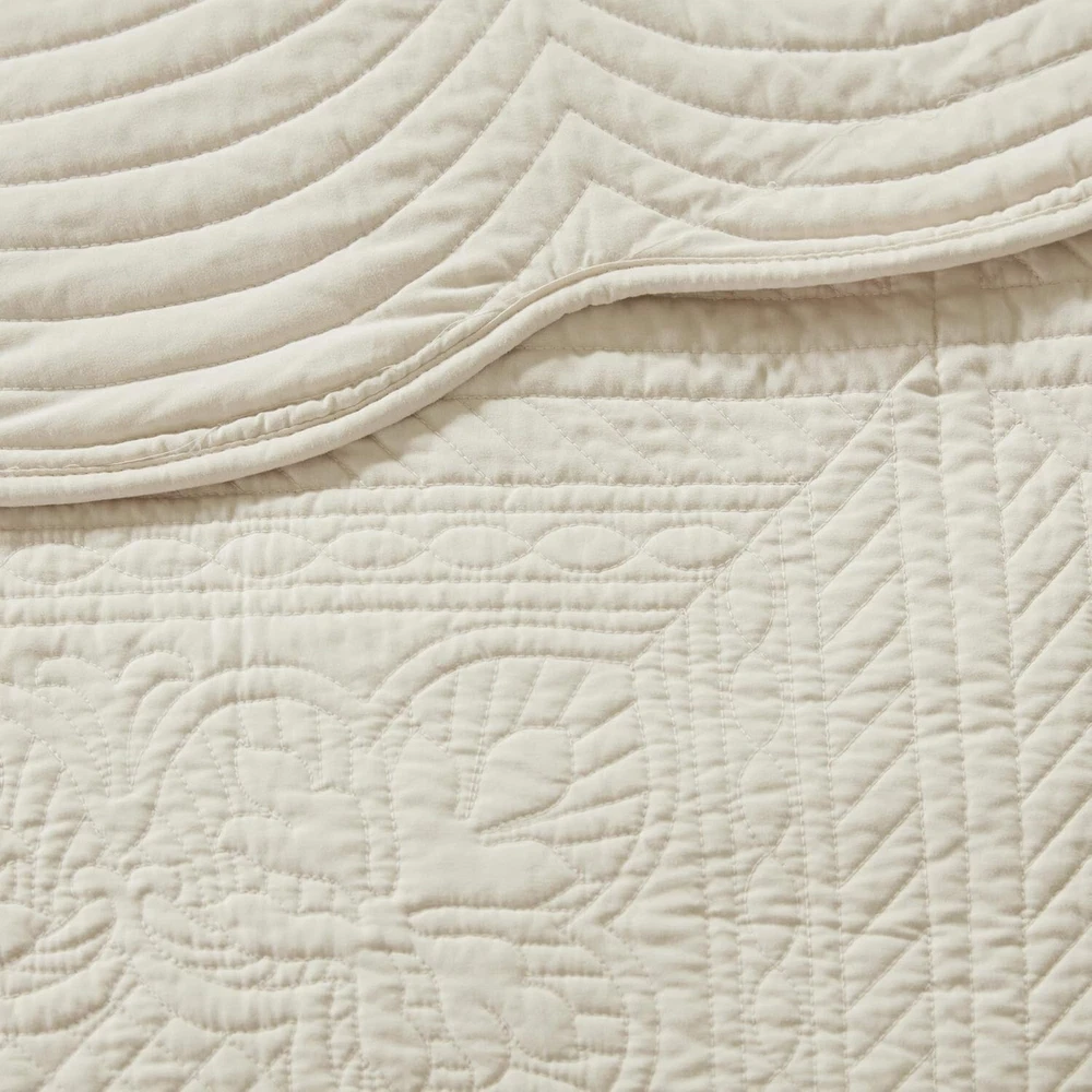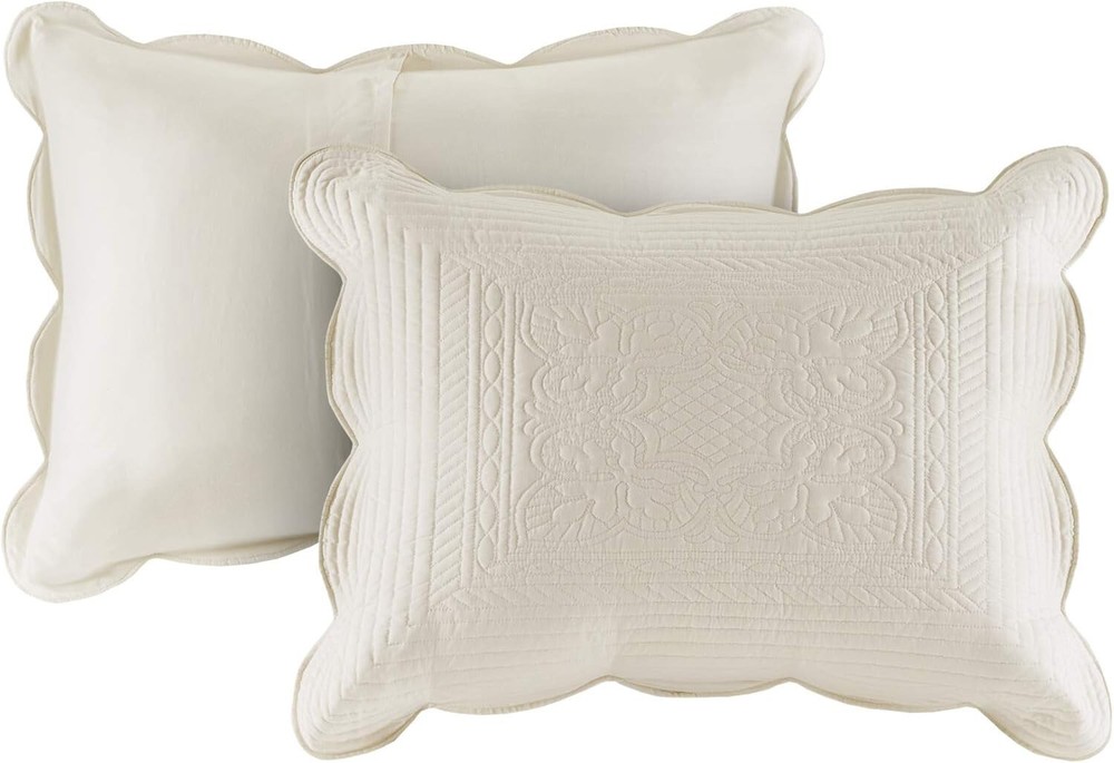 Size King/Cal King(104"x94") Material Polyester Color Medallion Cream Pattern Geometric Brand Madison Park About this item 100% Polyester Imported The Madison Park Tuscany 3 Piece Reversible Scalloped Edge Coverlet Set is perfect as a layering piece or as an alternative to your comforter for a charming country look. The coverlet and shams flaunt a classic stitch pattern with scalloped edges that add an elegant touch to your bedroom. Set includes: 1 Coverlet: 108"W x 96"L, 2 King Shams: 20"W x 36"L Care instructions: Machine wash cold, gentle cycle, and separately. Do not bleach. Tumble dry low, remove promptly. Do not iron. If there is no free movement in the washer or dryer, use large capacity commercial washer/dryer.