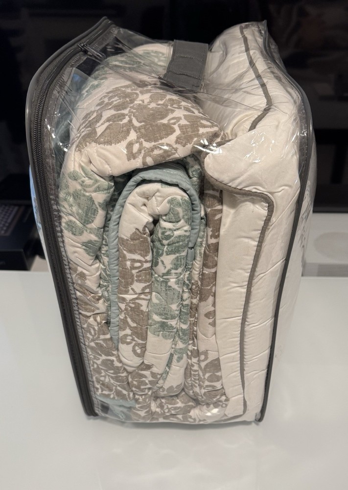 Pre-loved Madison Park Day Bed Set, a perfect blend of comfort and elegance. The set includes a luxurious comforter and two pillow shams, all in a crisp white color that brings a clean and serene atmosphere to any space. Designed to fit a day bed, this collection is an ideal choice for those who appreciate a touch of sophistication in their decor. Crafted with attention to detail, this set ensures both style and durability. The versatile design seamlessly integrates with various bedroom themes, making it a practical and stylish addition to your personal sanctuary. Enjoy the coziness of a well-made bed dressed in this exquisite cover set. Note the set includes 5 pieces: 1 day bed cover, 3 shams and 1 decorative pillow.
