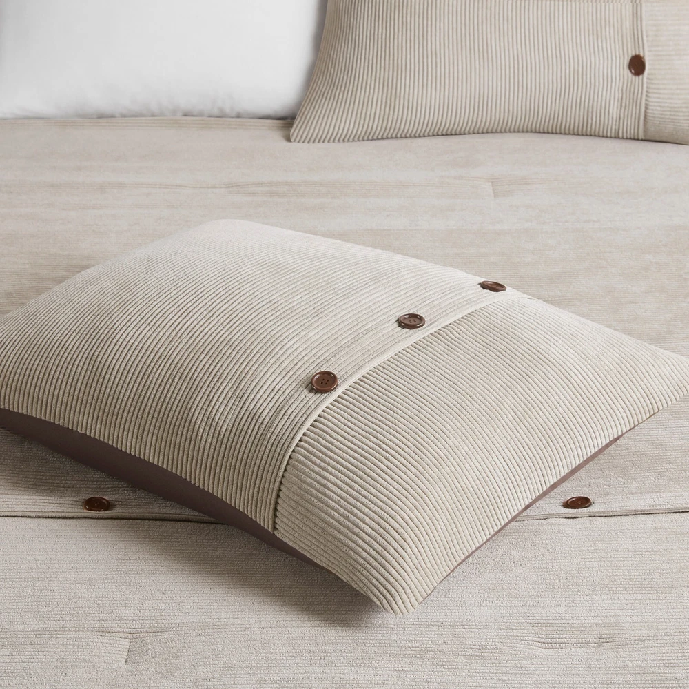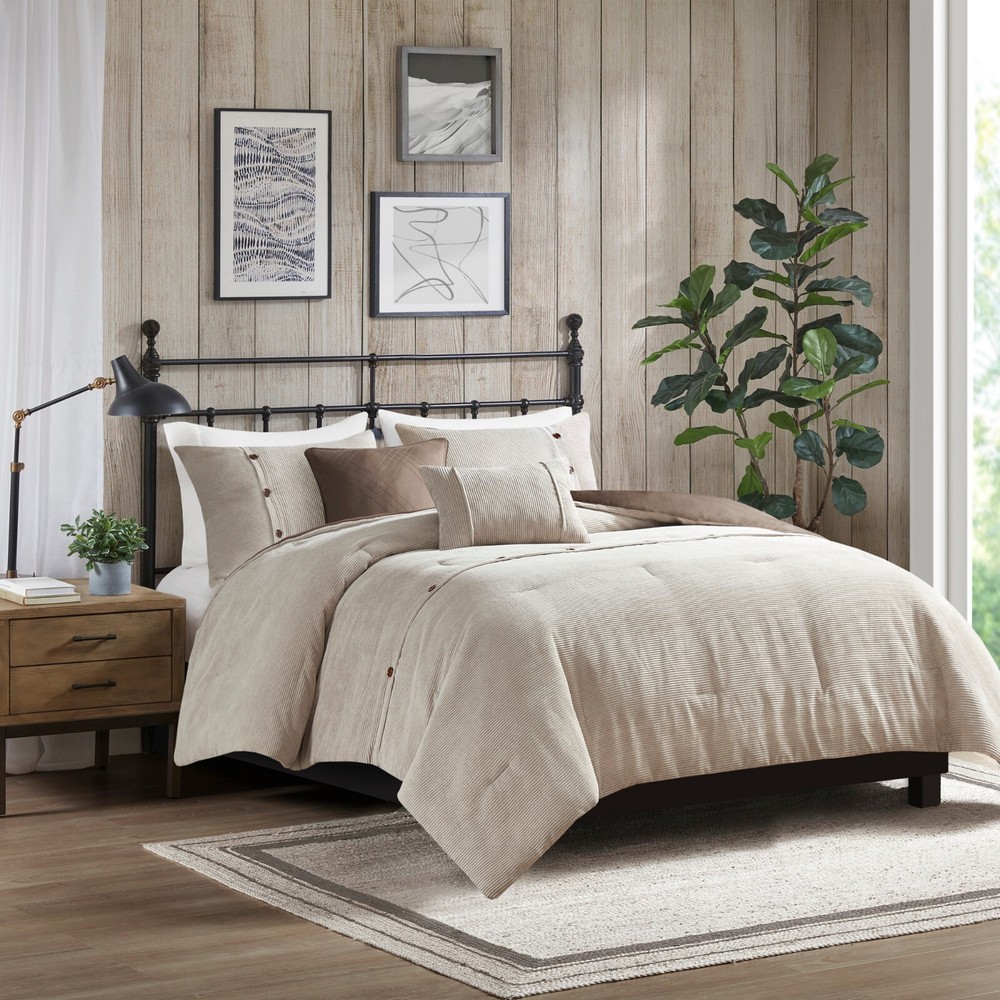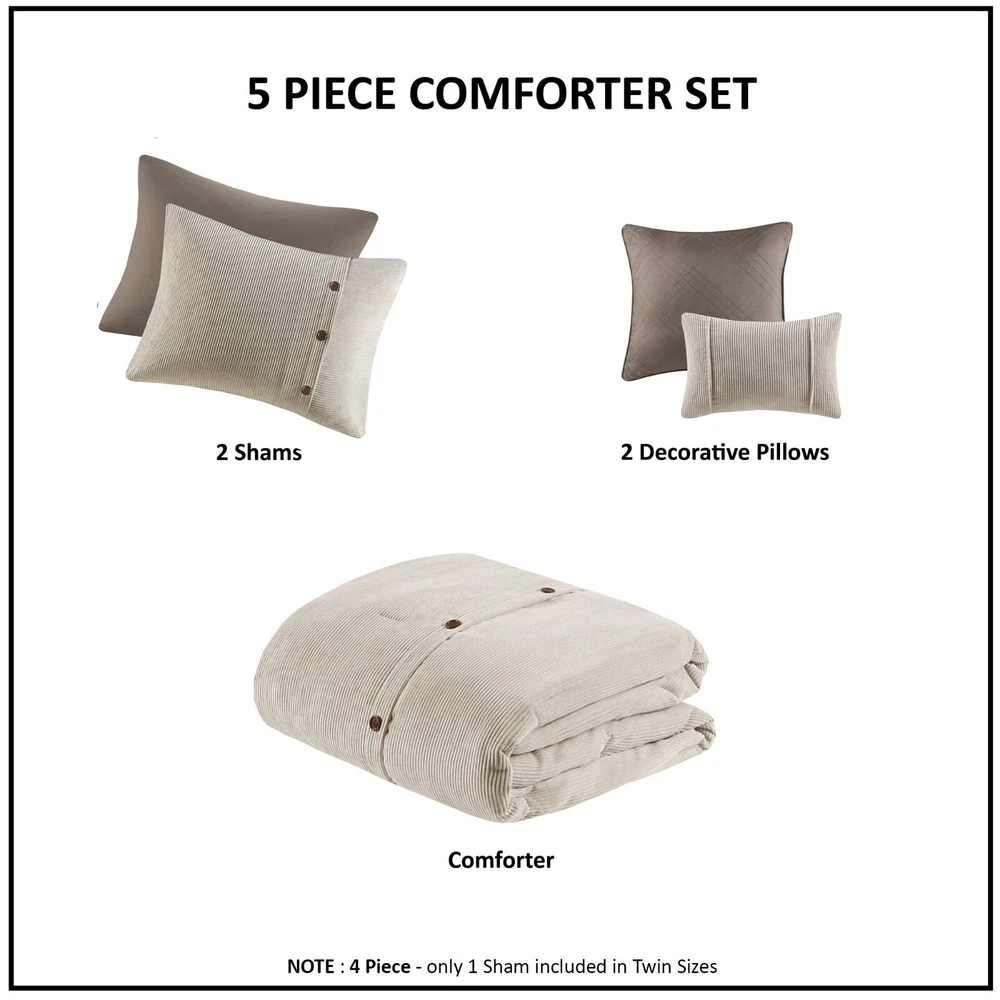 Madison Park 5 Piece Soft Corduroy Comforter Set Full Queen King Size Bedroom DESCRIPTION Rich texture, warmth, and elegance are yours when you add Madison Park’s Andes corduroy comfort set to your bed. Made from soft polyester corduroy, this tan comforter features decorative buttons that add a country style accent to the bed. A solid brown microfiber reverse provides additional softness, while also complementing the lush texture and dimension of the comforter face. Completed with 2 decorative pillows that flaunt quilting and piecing details, this plush comforter set gives your bedroom a cozy and inviting look. FEATURES • Transitional style 5 piece comforter set in polyester corduroy with decorative buttons • Soft tan color with beige buttons on comforter with a solid rich brown reverse • Brushed soft microfiber on the reverse side for added comfort • Quilting and piecing details on decorative pillows with filled piping • Set includes 1 comforter, 2 matching shams and 2 decorative pillows • Hypoallergenic polyester filling in the comforter and pillows • Antimicrobial treatment helps reduce the growth of odor causing bacteria and keeps fabric lasting longer • Machine Washable. Use large capacity washer and dryer to agitate and tumble for best results. Cold or Delicate cycle, dry on low or no heat. Steam iron for wrinkle removal • Items in this set may come in rolled or compressed packaging and will need to be fluffed up MATERIAL Comforter & Sham: 100% Polyester corduroy, with brushed microfiber reverse; Fabric with antimicrobial treatment Fill: 100% Polyester filling Pillows: 100% polyester Available Sizes: Full/Queen Comforter Set includes: 1 Comforter: 90"W x 90"L 2 Standard Shams: 20"W x 26"L 1 Decorative Pillow: 12"W x 18"L 1 Decorative Pillow: 18"W x 18"L King/California King Comforter Set includes: 1 Comforter: 104"W x 92"L 2 King Shams: 20"W x 36"L 1 Decorative Pillow: 12"W x 18"L 1 Decorative Pillow: 18"W x 18"L
