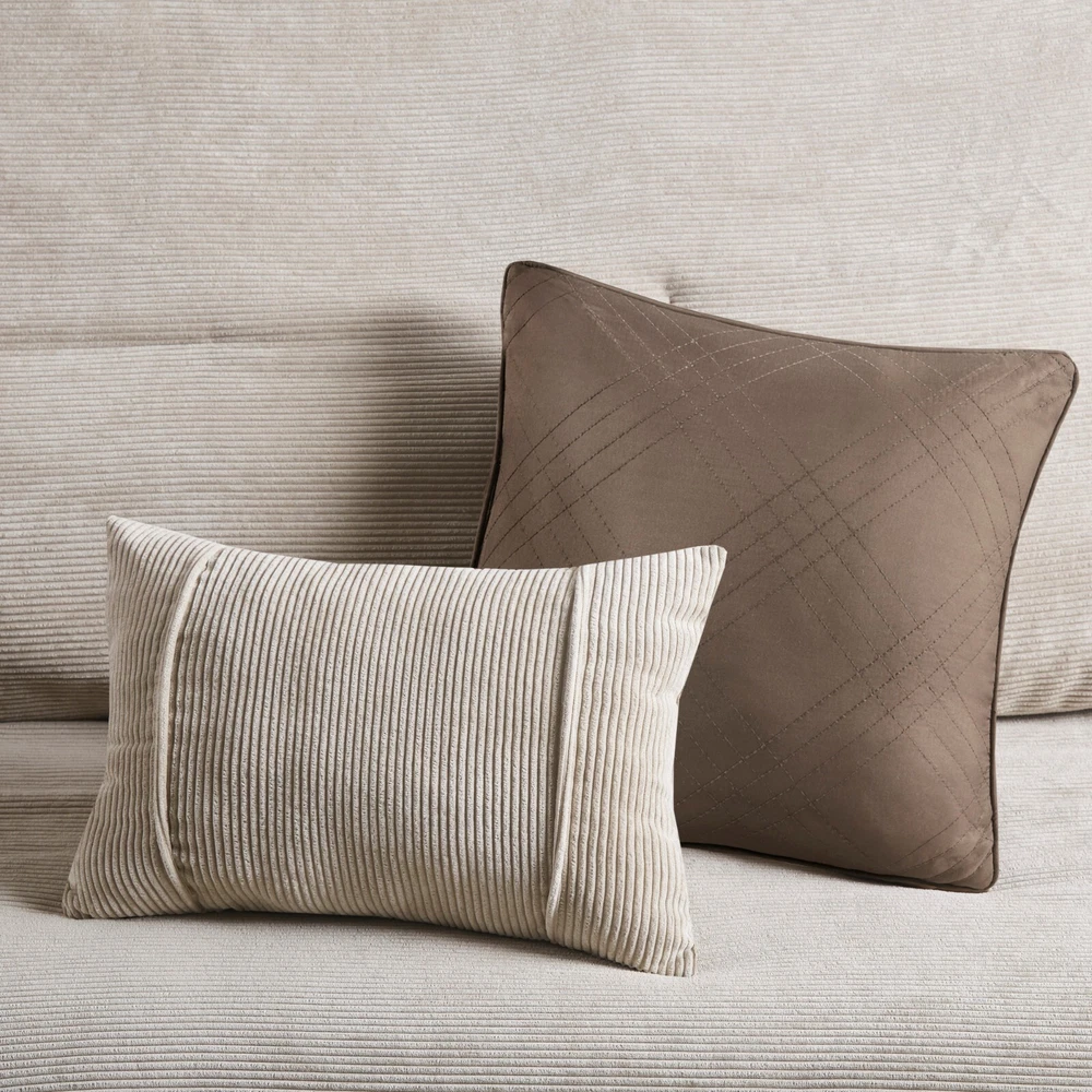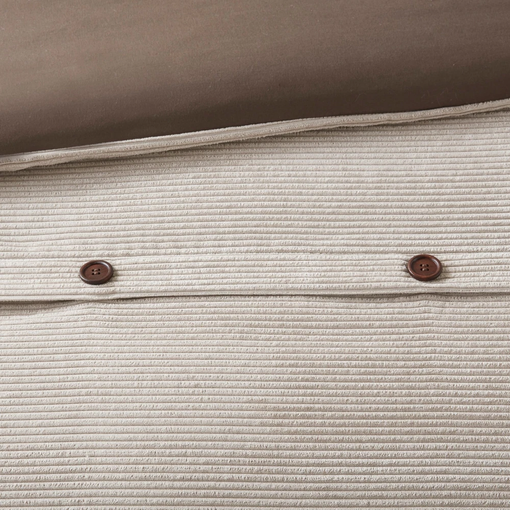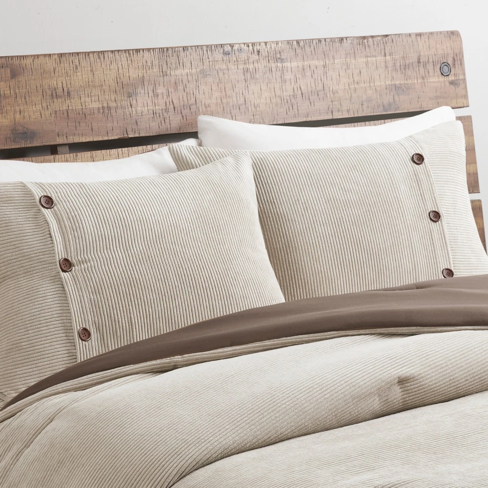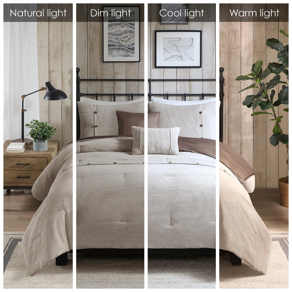 Madison Park 5 Piece Soft Corduroy Comforter Set Full Queen King Size Bedroom DESCRIPTION Rich texture, warmth, and elegance are yours when you add Madison Park’s Andes corduroy comfort set to your bed. Made from soft polyester corduroy, this tan comforter features decorative buttons that add a country style accent to the bed. A solid brown microfiber reverse provides additional softness, while also complementing the lush texture and dimension of the comforter face. Completed with 2 decorative pillows that flaunt quilting and piecing details, this plush comforter set gives your bedroom a cozy and inviting look. FEATURES • Transitional style 5 piece comforter set in polyester corduroy with decorative buttons • Soft tan color with beige buttons on comforter with a solid rich brown reverse • Brushed soft microfiber on the reverse side for added comfort • Quilting and piecing details on decorative pillows with filled piping • Set includes 1 comforter, 2 matching shams and 2 decorative pillows • Hypoallergenic polyester filling in the comforter and pillows • Antimicrobial treatment helps reduce the growth of odor causing bacteria and keeps fabric lasting longer • Machine Washable. Use large capacity washer and dryer to agitate and tumble for best results. Cold or Delicate cycle, dry on low or no heat. Steam iron for wrinkle removal • Items in this set may come in rolled or compressed packaging and will need to be fluffed up MATERIAL Comforter & Sham: 100% Polyester corduroy, with brushed microfiber reverse; Fabric with antimicrobial treatment Fill: 100% Polyester filling Pillows: 100% polyester Available Sizes: Full/Queen Comforter Set includes: 1 Comforter: 90"W x 90"L 2 Standard Shams: 20"W x 26"L 1 Decorative Pillow: 12"W x 18"L 1 Decorative Pillow: 18"W x 18"L King/California King Comforter Set includes: 1 Comforter: 104"W x 92"L 2 King Shams: 20"W x 36"L 1 Decorative Pillow: 12"W x 18"L 1 Decorative Pillow: 18"W x 18"L