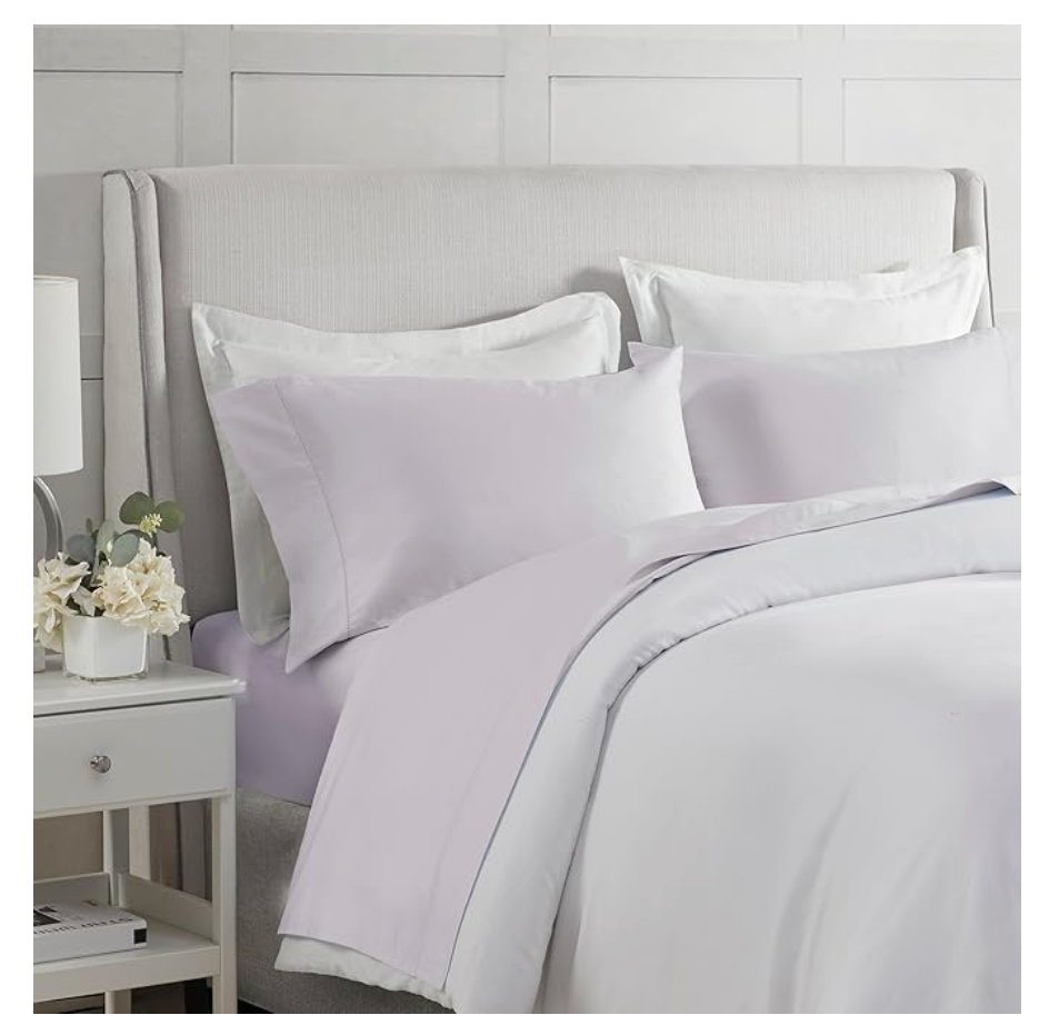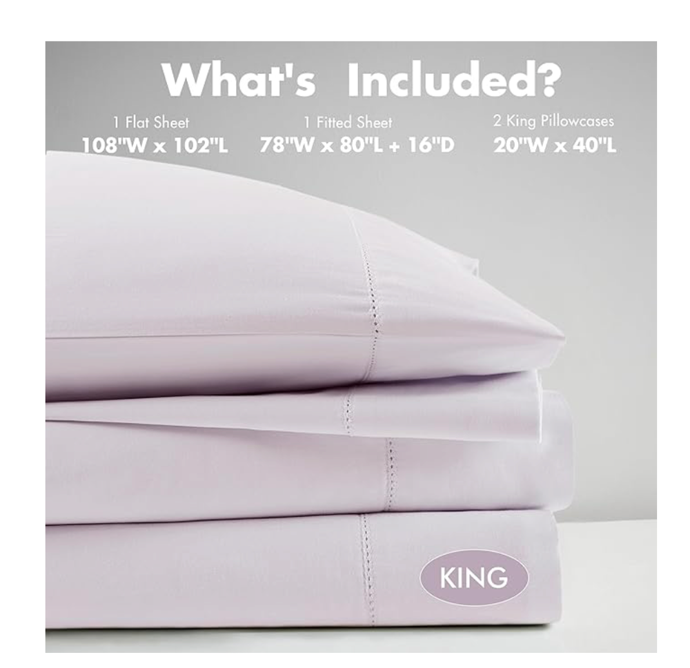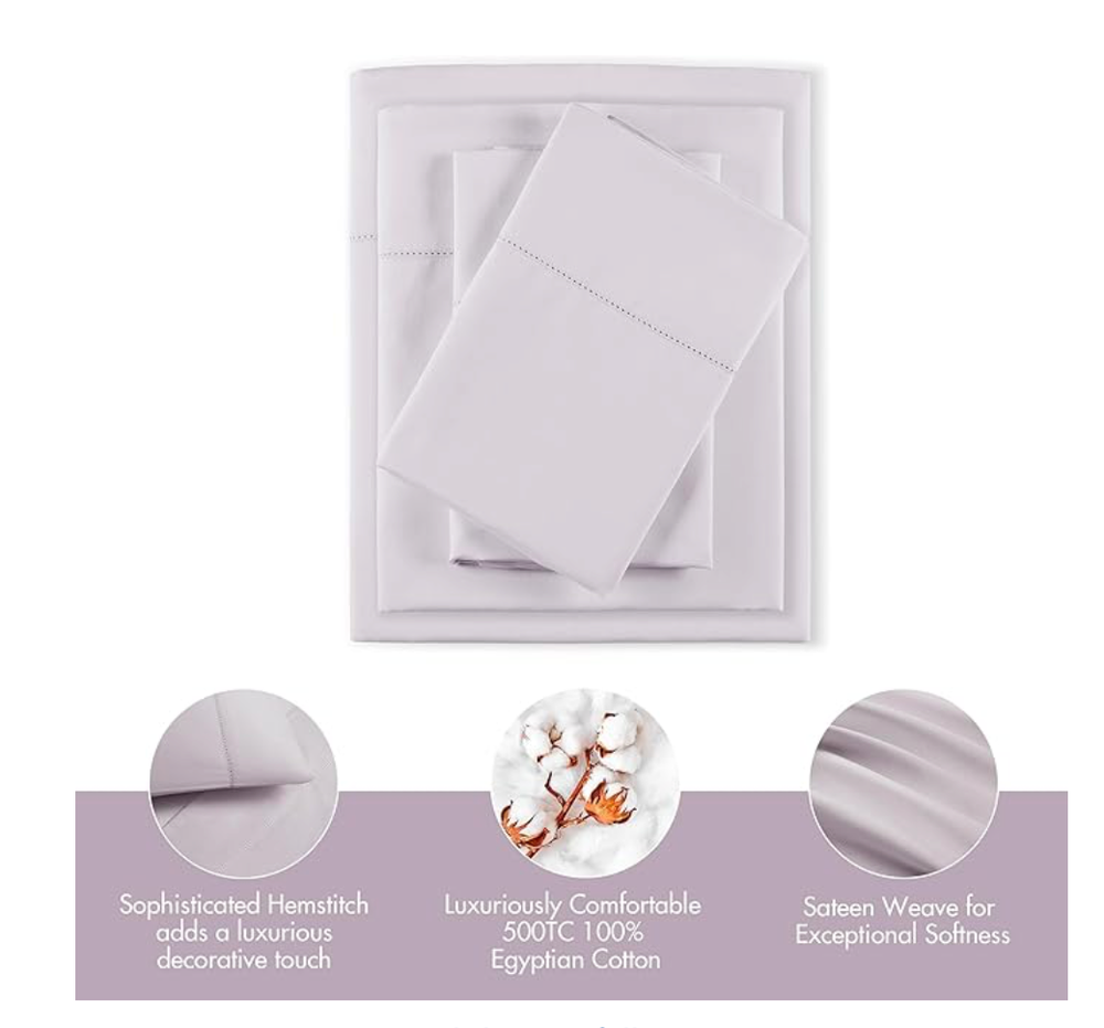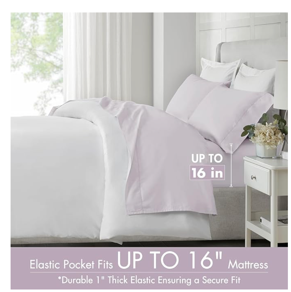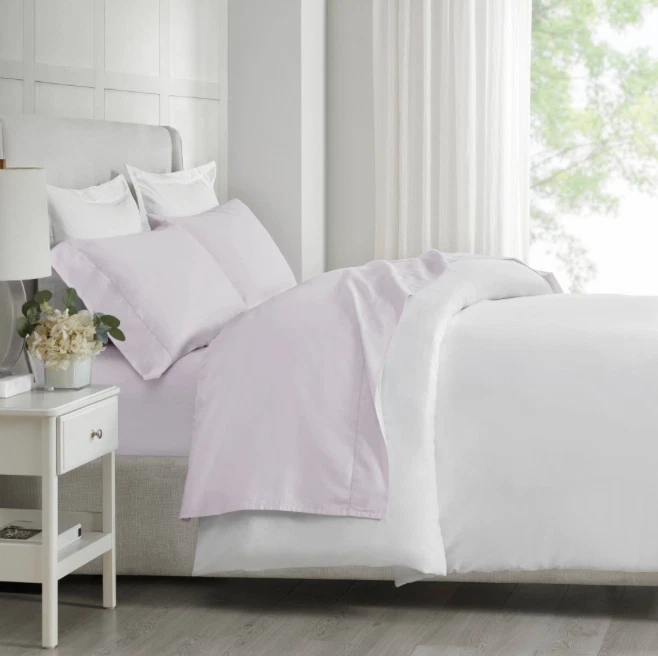The Madison Park 500-Thread Count Egyptian Cotton Deep Pocket 4-Piece Sheet Set in Queen size is a luxurious and high-quality bedding option for adults. Made from 100% Egyptian cotton, this set includes a flat sheet and two standard pillowcases in a solid lilac color. The deep pocket fitted sheet can fit up to 18" mattresses, providing a comfortable and snug fit for all seasons. With its modern style and hypoallergenic features, this sheet set adds a touch of elegance to any bedroom while being machine washable for easy care.