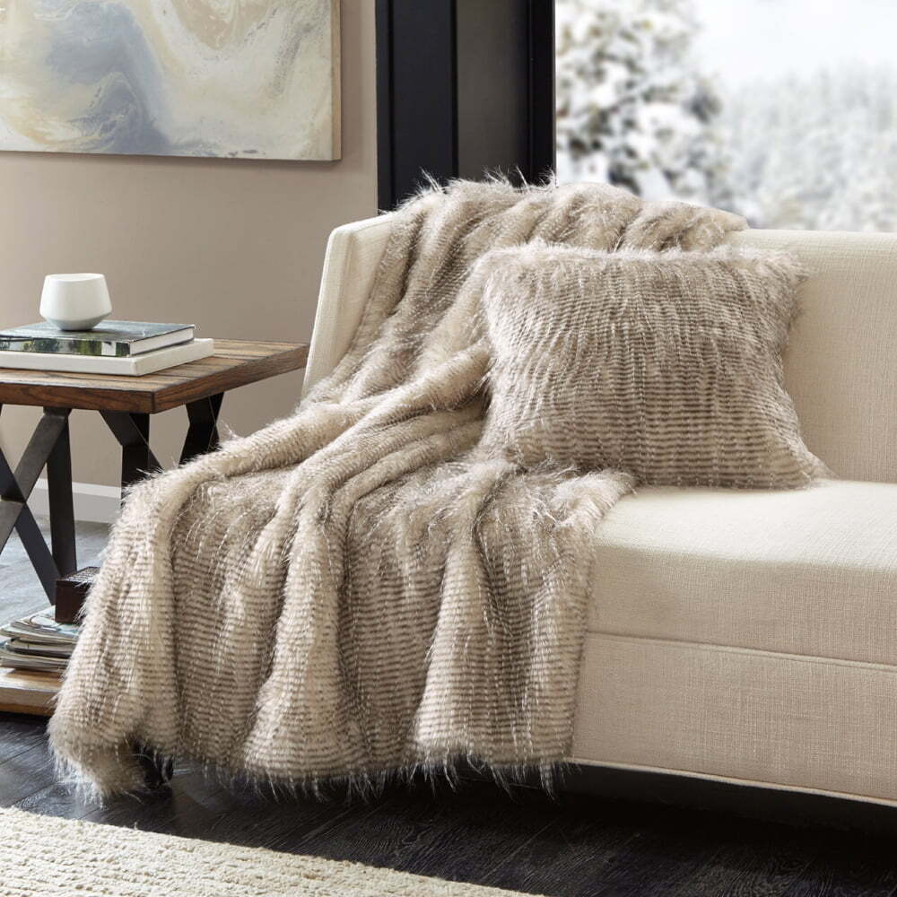 1 Throw (50"W x 60"L) Face: 70% acrylic & 30% polyester blend faux fur Reverse: 100% polyester solid mink Knife-Edge Polyester Eyelash Faux Fur