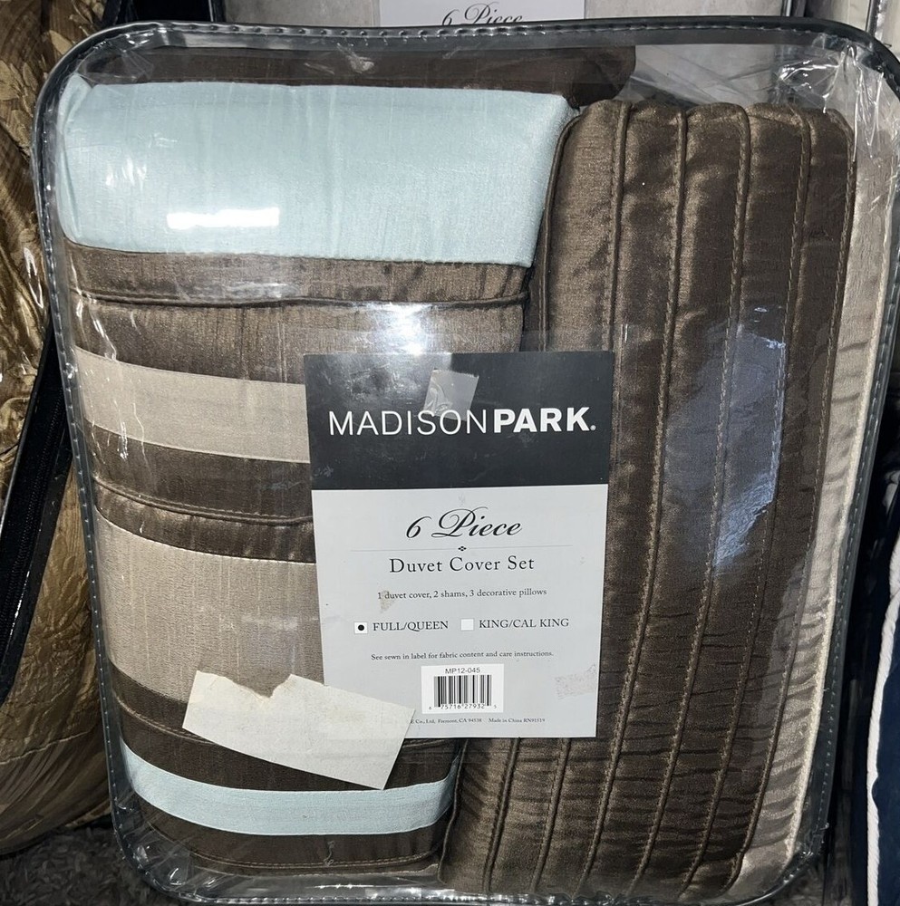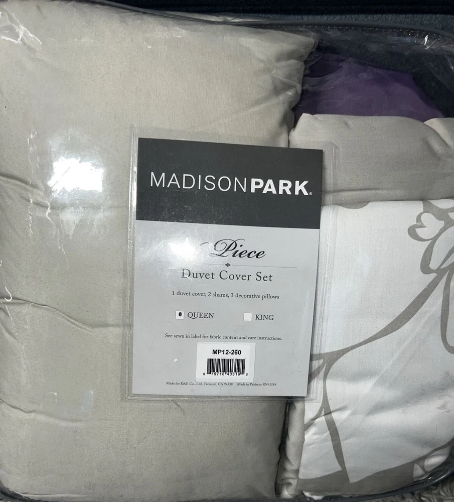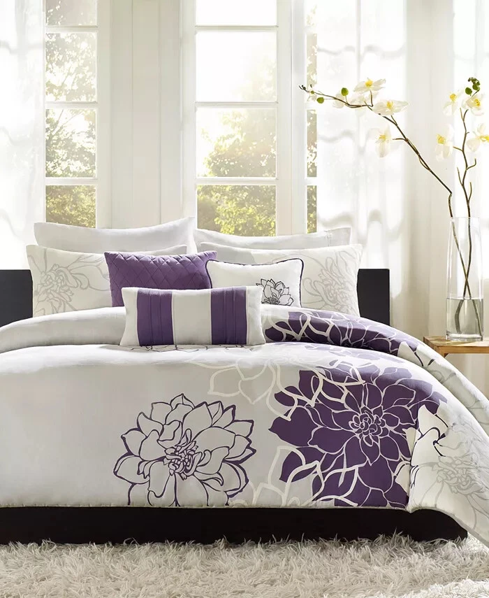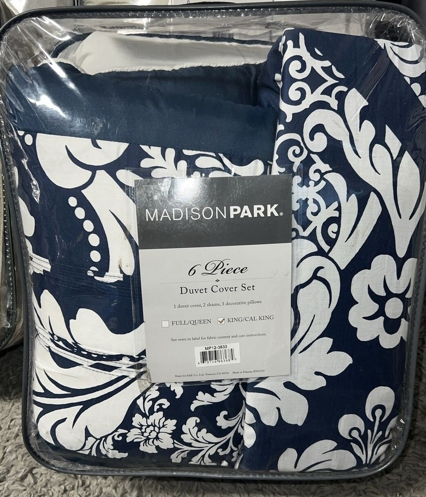 Vienna 6-Pc. Duvet Cover Set, King/California King: Add relaxing calm to your room with the Vienna duvet cover set from Madison Park, featuring an intricate pattern within an oversized ogee motif, while the soft touch of cotton adds to the overall charm. Set includes: duvet cover (104" x 92"), three decorative pillows (18" x 18", 16" x 16", 12" x 16") and two king shams (20" x 36") Oversized ogee motif Duvet/sham: cotton; Thread count: 200, reverses to 180; pillow: cotton; Thread count: 180; pillow fill: polyester Machine washable. Spot clean pillows. Imported Amherst 6-Pc. Duvet Cover Set, Full/Queen: Blue/brown Lavish any room with the luxurious style and comfort of this Amherst duvet cover set from Madison Park, featuring bold colorblocking in contemporary hues, pintucked panels for an added touch of texture and three coordinating decorative pillows for a professionally styled look. Set includes: full/queen duvet (90" x 90"), two standard shams (20" x 26") and three decorative pillows (16" x 16", 18" x 18", 12" x 20") Duvet,pillows,shams, and filling: polyester Lola 6-Pc. Duvet Cover Set, Full/Queen purple: Update your room with the Lola duvet cover set from Madison Park, featuring the relaxed style of a floral pattern and the soft touch of cotton sateen on the duvet cover and sham face. Set includes: duvet cover (90" x 90"), two standard shams (20" x 26") and three decorative pillows (18" x 18", 16" x 16", 12" x 20") Floral pattern Duvet cover/sham: cotton, reverses to cotton/polyester; Thread count: 200, reverses to 180; pillow: cotton/polyester; pillow fill: polyester Machine washable. Spot clean pillows. Imported Machine washable Imported Palisades 6-Pc. Duvet Cover Set, Full/Queen Blue/Gray: Add comfort and style to your bedroom with the Palisades duvet cover set from Madison Park, featuring pieced microsuede on the duvet cover and sham face, reversing to a brushed fabric. Set includes: duvet cover (104" x 92"), two king shams (20" x 36") and three decorative pillows (18" x 18", 16" x 16", 12" x 18") Microsuede from polyester Duvet cover/sham/pillow: polyester; pillow fill: polyester Machine washable. Spot clean pillows. Imported Pebble Beach 6-Pc. Duvet Cover Set, Full/Queen, Coral: Evoke seaside memories with the Pebble Beach duvet cover set from Madison Park, featuring a printed pattern of starfish and coral in white, rich coral and teal tones, while the duvet cover and sham feature the smooth touch of a cotton sateen face. Set includes: duvet cover (90" x 90"), three decorative pillows (18" x 18", 16" x 16", 12" x 18") and two standard shams (20" x 26") Starfish and coral motif Colors: white ground with rich coral and teal accents Asian American & Pacific Islander Owned, Woman Owned Duvet cover/sham: cotton, reverses to cotton/polyester; Thread count: 210 (face); pillow: cotton/polyester; pillow fill: polyester Machine washable. Spot clean pillows. Imported Please note this item may be shipped in a compression bag- allow 24-48 hours for the item to return to its normal size