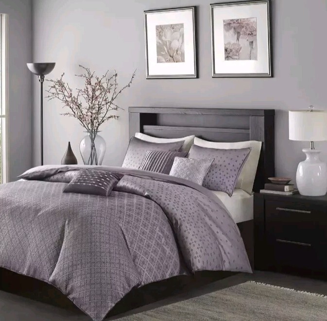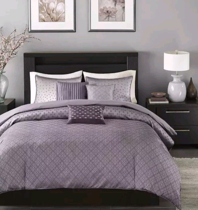 Elevate the look of your bedroom with this Madison Park 6 Pcs Duvet Cover Set in a stunning shade of purple. The set includes a full/queen size duvet cover, made from a soft and durable jacquard and polyester material blend, ensuring both comfort and style. The geometric pattern adds a modern touch to your decor, while the roomy dimensions of 17.09x15.59x12.48 inches provide ample space for a comfortable sleep. Ideal for any bedroom, this duvet cover set is designed to impress. The set weighs 8.4 pounds and is perfect for those who love modern style. With its jacquard and polyester material blend, the set is both soft and durable, ensuring a comfortable sleep every night.