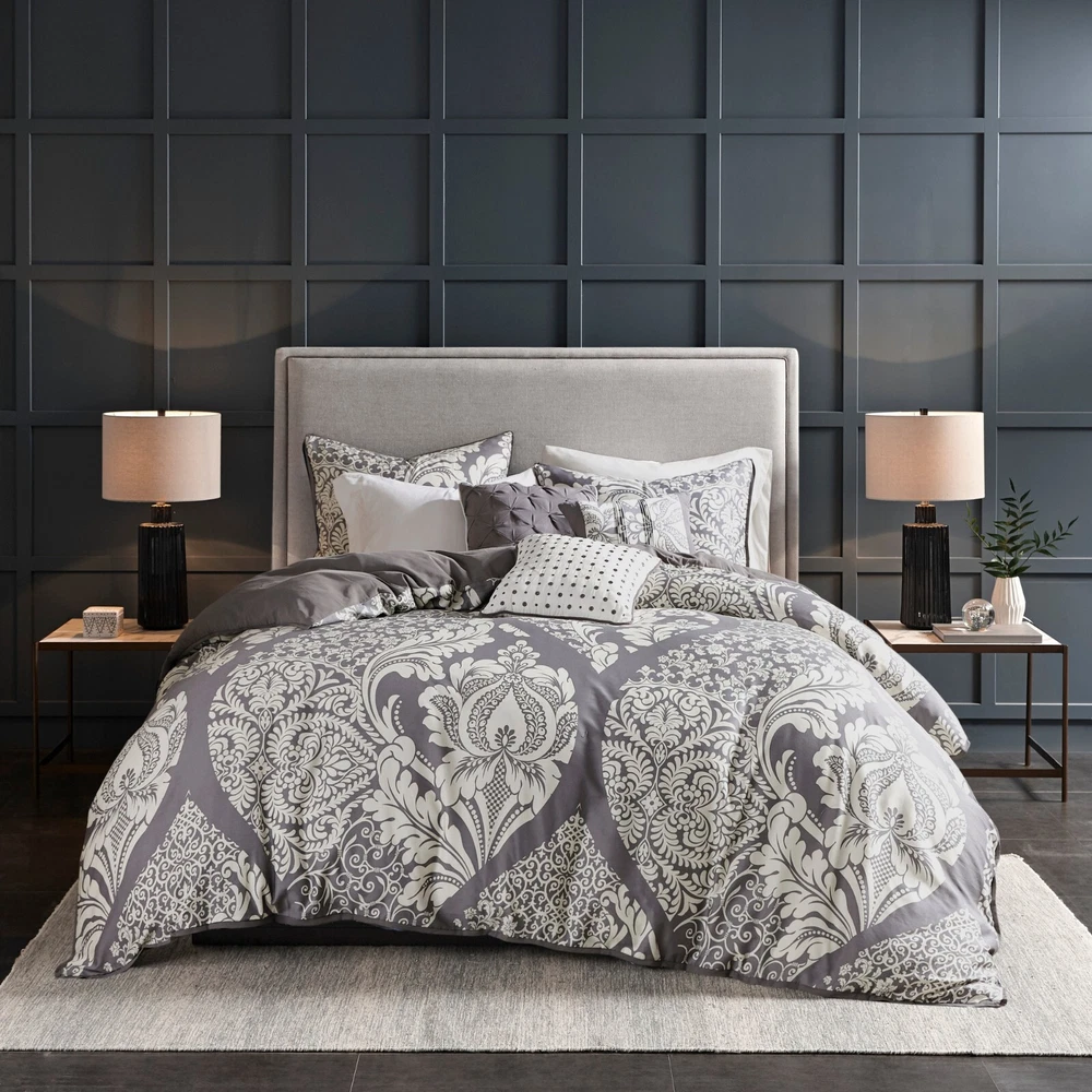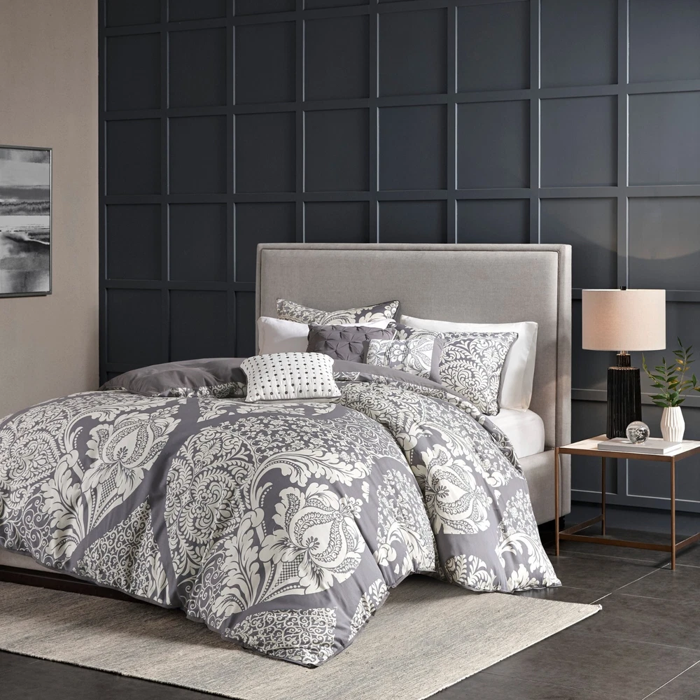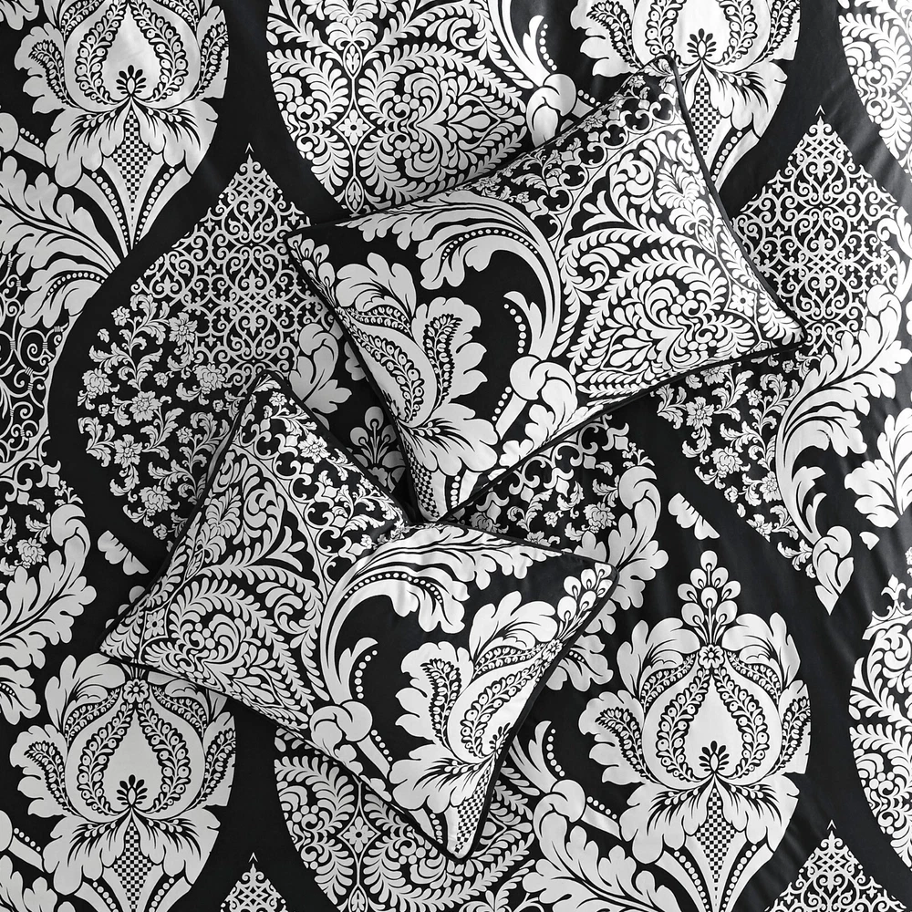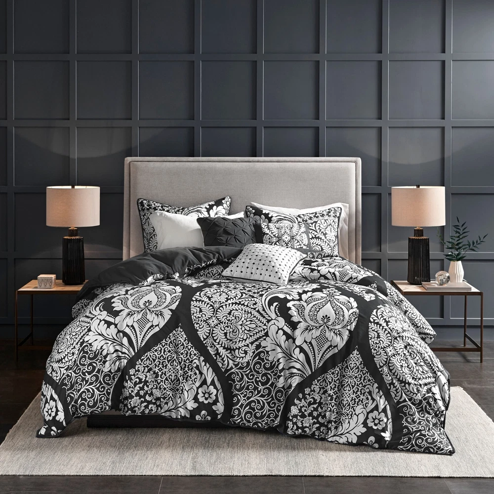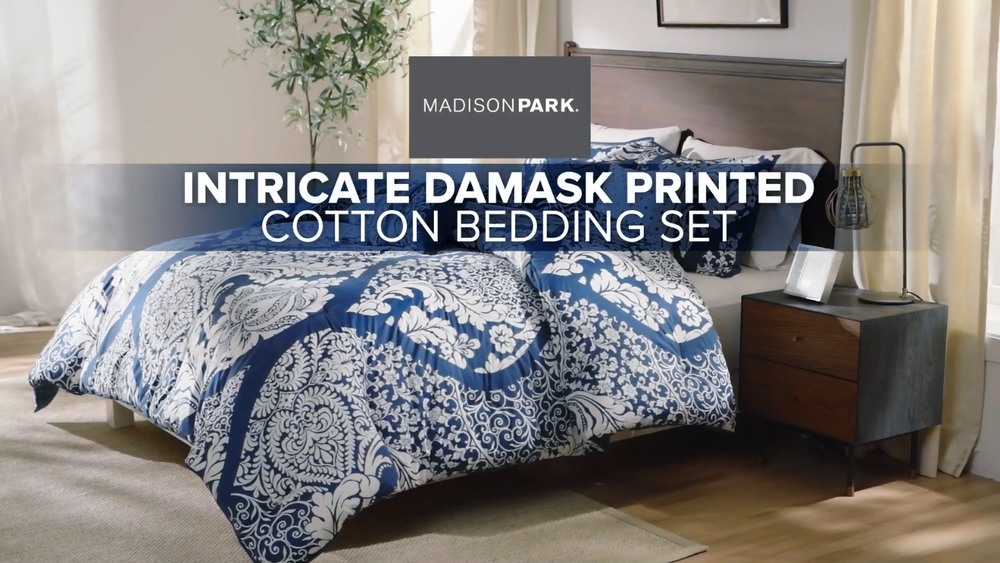 Store Categories Store Categories Bedding Comforters Decorative Pillows Duvet Covers Quilts & Coverlets Sheets Blankets & Throws Mattress Pads Pillows Home Decor Window Treatments Wall Art Home Accents Furniture Beds Dining Seating Ottomans & Benches Accent Chairs Accent Tables Dining Tables Sofas Bath Bath Robes Shower Curtains Towels Bath Rugs Bath Accessories Apparel Pajama Sets Nightgowns Rugs Rugs & Carpets Lighting Lamp Pendant Other Product Overview Details DESCRIPTION The Madison Park Vienna 6 Piece Printed Duvet Cover Set offers an eye-catching update to your bedroom decor. A beautifully intricate damask pattern is flaunted across the duvet cover and shams, for a chic transitional look. The solid reverse perfectly complements the top of the bed, while the flange border adds a charming accent to the duvet cover. Three decorative pillows with embroidered details and fabric manipulation complete the duvet cover set. Made from 100% cotton sateen, this bedding set is OEKO-TEX certified, meaning it does not contain any harmful substances or chemicals to ensure quality comfort and wellness. A button closure helps secure a comforter insert within the duvet cover and inside ties in the corners help prevent it from shifting (insert is NOT included). FEATURES • Transitional 6 piece cotton printed duvet cover set • Features Intricate damask design in black and white contrasted colors and solid black color on the reverse • Set includes 1 duvet cover, 2 matching shams and 3 decorative pillows • Embroidered and fabric manipulation decorative pillows • Button closure and inside ties to secure the insert (insert not included) • Oeko-Tex Certified, includes no harmful substances or chemicals • Machine washable for easy care MATERIAL Duvet Cover/Sham: 200TC Cotton sateen, printed Reverse/Sham: Cotton/polyester crossweave Pillows: Cotton/polyester crossweave with polyester filling Available Sizes: Full/Queen Duvet Cover Set includes: 1 Duvet Cover: 90"W x 90"L 2 Standard Shams: 20"W x 26"L + 2"D 1 Decorative Pillow: 18"W x 18"L 1 Decorative Pillow: 16"W x 16"L 1 Decorative Pillow: 12"W x 16"L K ing/California King Duvet Cover Set includes: 1 Duvet Cover: 104"W x 92"L 2 King Shams: 20"W x 36"L + 2"D 1 Decorative Pillow: 18"W x 18"L 1 Decorative Pillow: 16"W x 16"L 1 Decorative Pillow: 12"W x 16"L Bedding Comforters Decorative Pillows Duvet Covers Quilts & Coverlets Sheets Blankets & Throws Mattress Pads Pillows Home Decor Window Treatments Wall Art Home Accents Furniture Beds Dining Seating Ottomans & Benches Accent Chairs Accent Tables Dining Tables Sofas Bath Bath Robes Shower Curtains Towels Bath Rugs Bath Accessories Rugs Rugs & Carpets Lighting Lamp Pendant Product Overview Product Details DESCRIPTION The Madison Park Vienna 6 Piece Printed Duvet Cover Set offers an eye-catching update to your bedroom decor. A beautifully intricate damask pattern is flaunted across the duvet cover and shams, for a chic transitional look. The solid reverse perfectly complements the top of the bed, while the flange border adds a charming accent to the duvet cover. Three decorative pillows with embroidered details and fabric manipulation complete the duvet cover set. Made from 100% cotton sateen, this bedding set is OEKO-TEX certified, meaning it does not contain any harmful substances or chemicals to ensure quality comfort and wellness. A button closure helps secure a comforter insert within the duvet cover and inside ties in the corners help prevent it from shifting (insert is NOT included). FEATURES • Transitional 6 piece cotton printed duvet cover set • Features Intricate damask design in black and white contrasted colors and solid black color on the reverse • Set includes 1 duvet cover, 2 matching shams and 3 decorative pillows • Embroidered and fabric manipulation decorative pillows • Button closure and inside ties to secure the insert (insert not included) • Oeko-Tex Certified, includes no harmful substances or chemicals • Machine washable for easy care MATERIAL Duvet Cover/Sham: 200TC Cotton sateen, printed Reverse/Sham: Cotton/polyester crossweave Pillows: Cotton/polyester crossweave with polyester filling Available Sizes: Full/Queen Duvet Cover Set includes: 1 Duvet Cover: 90"W x 90"L 2 Standard Shams: 20"W x 26"L + 2"D 1 Decorative Pillow: 18"W x 18"L 1 Decorative Pillow: 16"W x 16"L 1 Decorative Pillow: 12"W x 16"L K ing/California King Duvet Cover Set includes: 1 Duvet Cover: 104"W x 92"L 2 King Shams: 20"W x 36"L + 2"D 1 Decorative Pillow: 18"W x 18"L 1 Decorative Pillow: 16"W x 16"L 1 Decorative Pillow: 12"W x 16"L